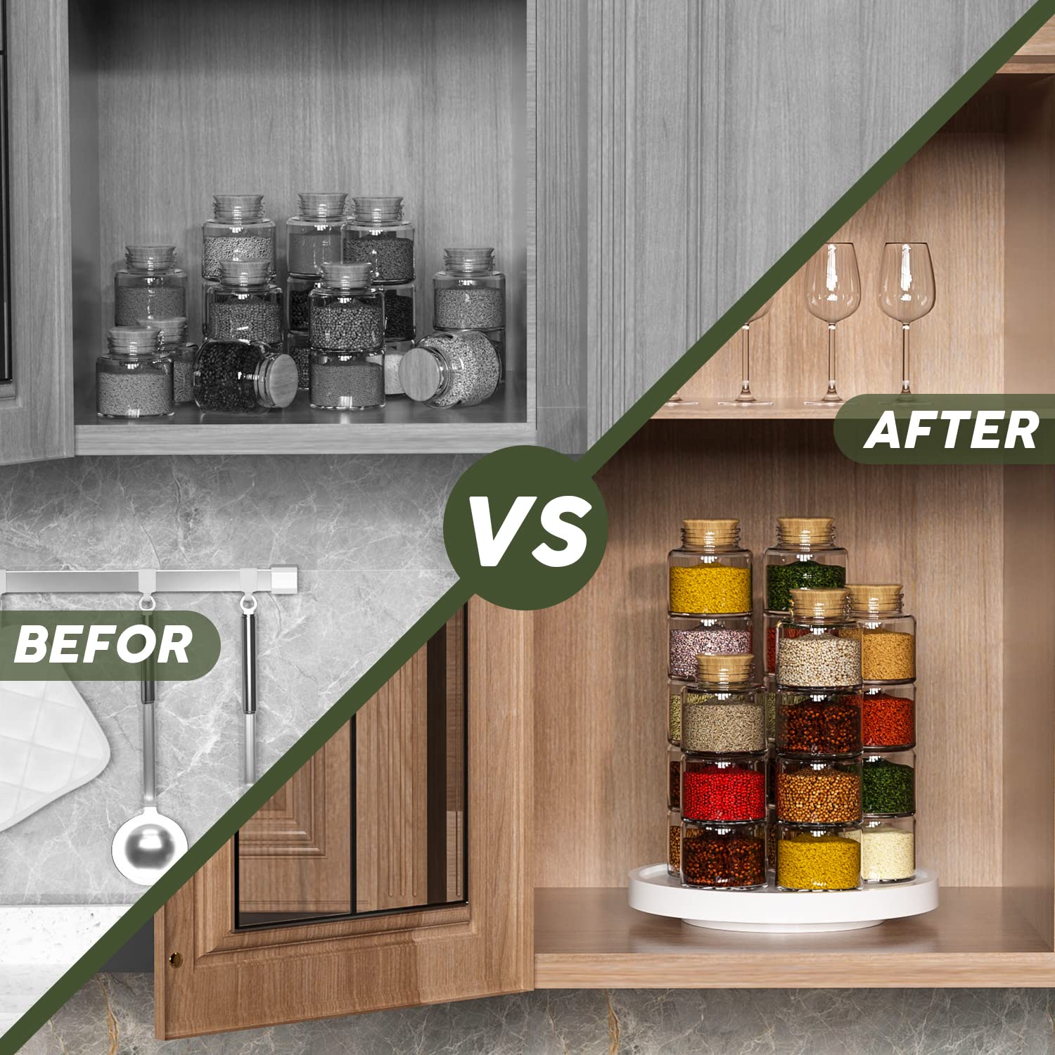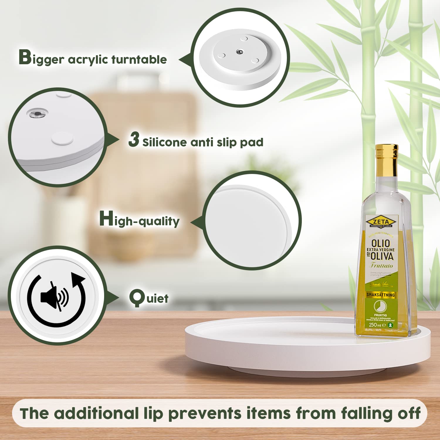 Updated Design: Bigger acrylic turntable with 3 silica gel skid prevention pad makes lazy susan organizer rotate smoother and quieter. You can get any item from any angle. The additional lip prevents items from falling off