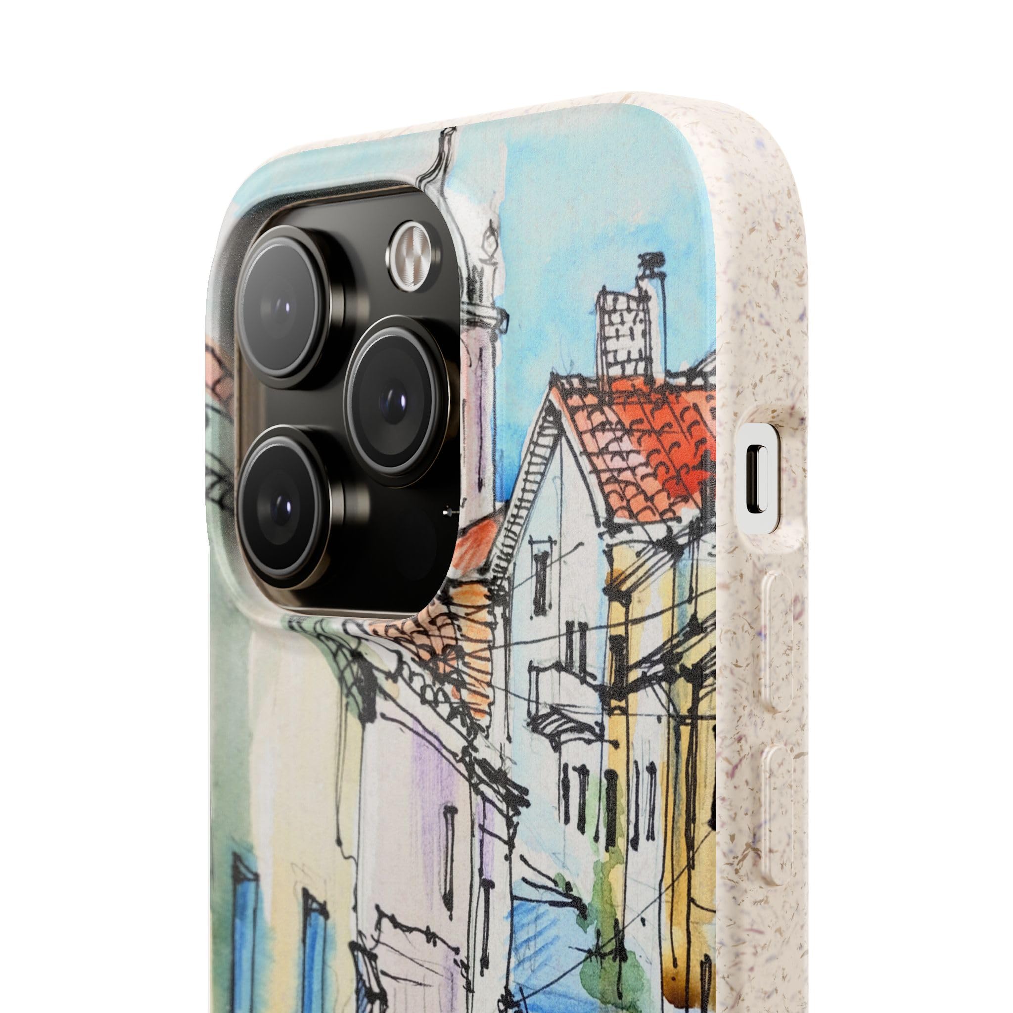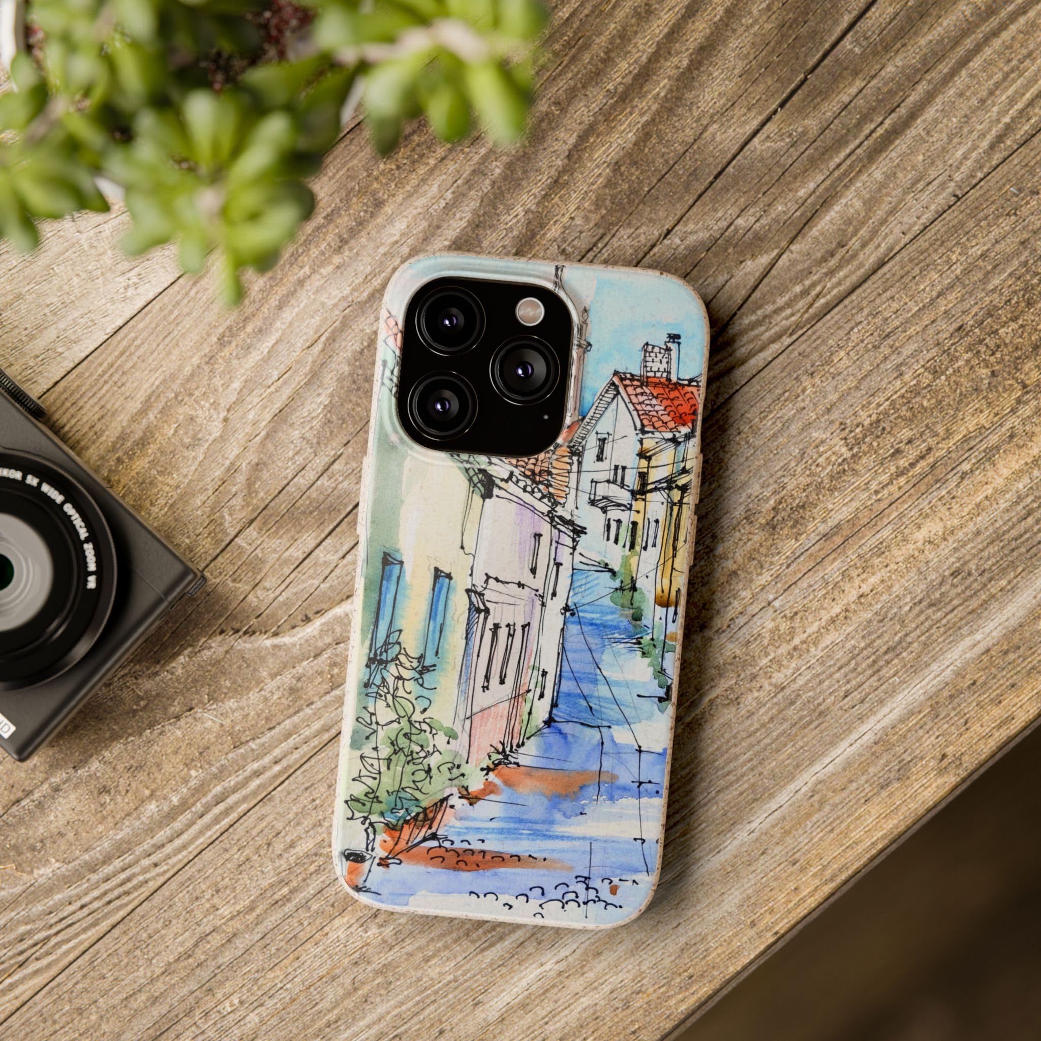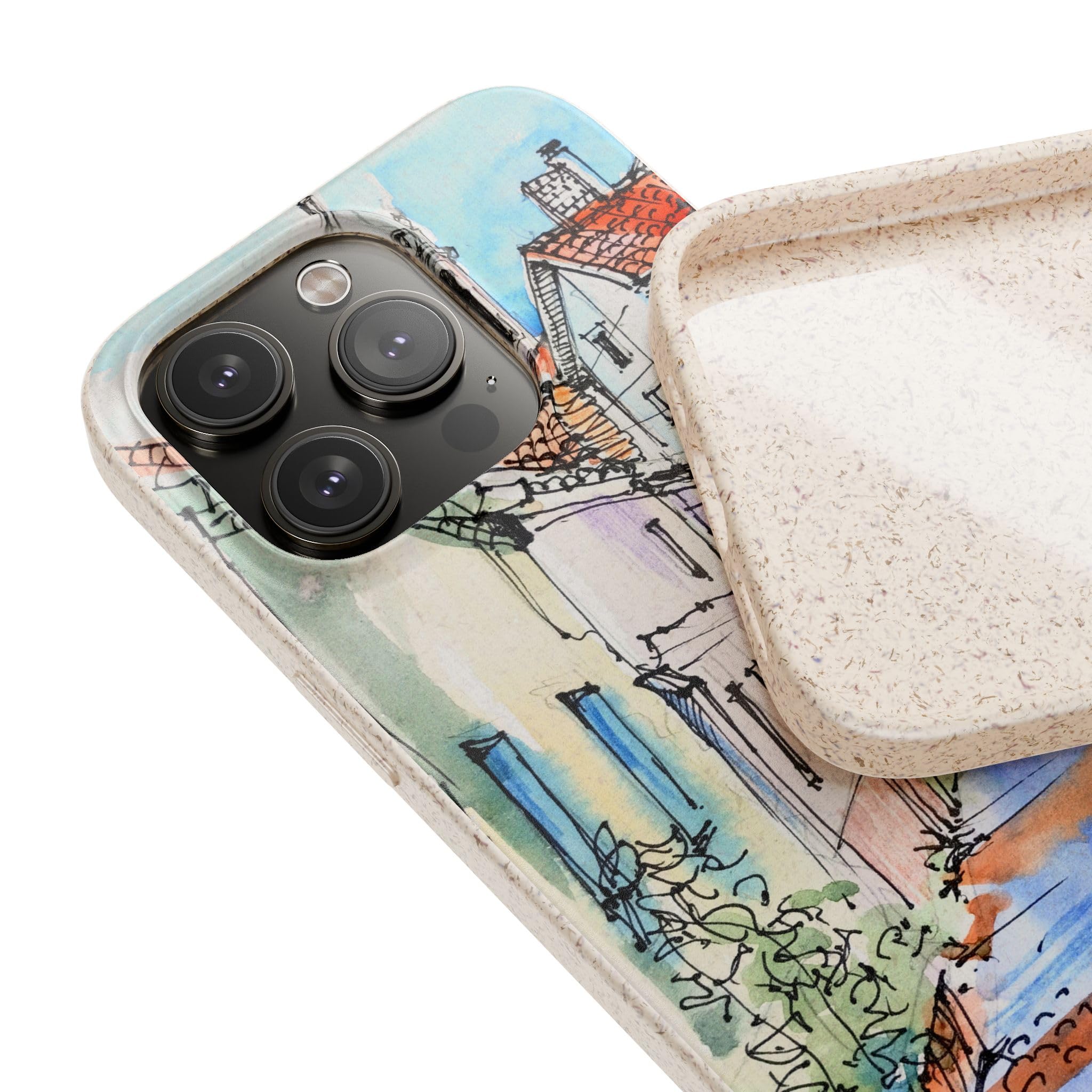 Protect your phone in style while protecting the planet! Embrace nature with our European Town Art Biodegradable Phone Case, featuring a charming illustration of a colorful European street scene. The design showcases quaint cobblestone roads, vibrant historic homes, and a picturesque chapel, all beautifully rendered in watercolor and fine pen detail. Perfect for lovers of travel-inspired art, European architecture, and the warm, nostalgic feel of hand-painted urban landscapes. Crafted from eco-friendly, compostable materials, this sustainable phone case not only protects your device but also supports a greener planet — naturally biodegrading within 160 days of disposal. It’s lightweight, durable, and fully supports wireless charging for effortless everyday use. Available for multiple phone models. Order yours today and carry the beauty of nature wherever you go! Details: .: Materials: PLA and PBAT polymers, bamboo fibre .: Matte finish .: Wireless charging compatible .: Precise cut outs for connectivity .: Might have a natural scent