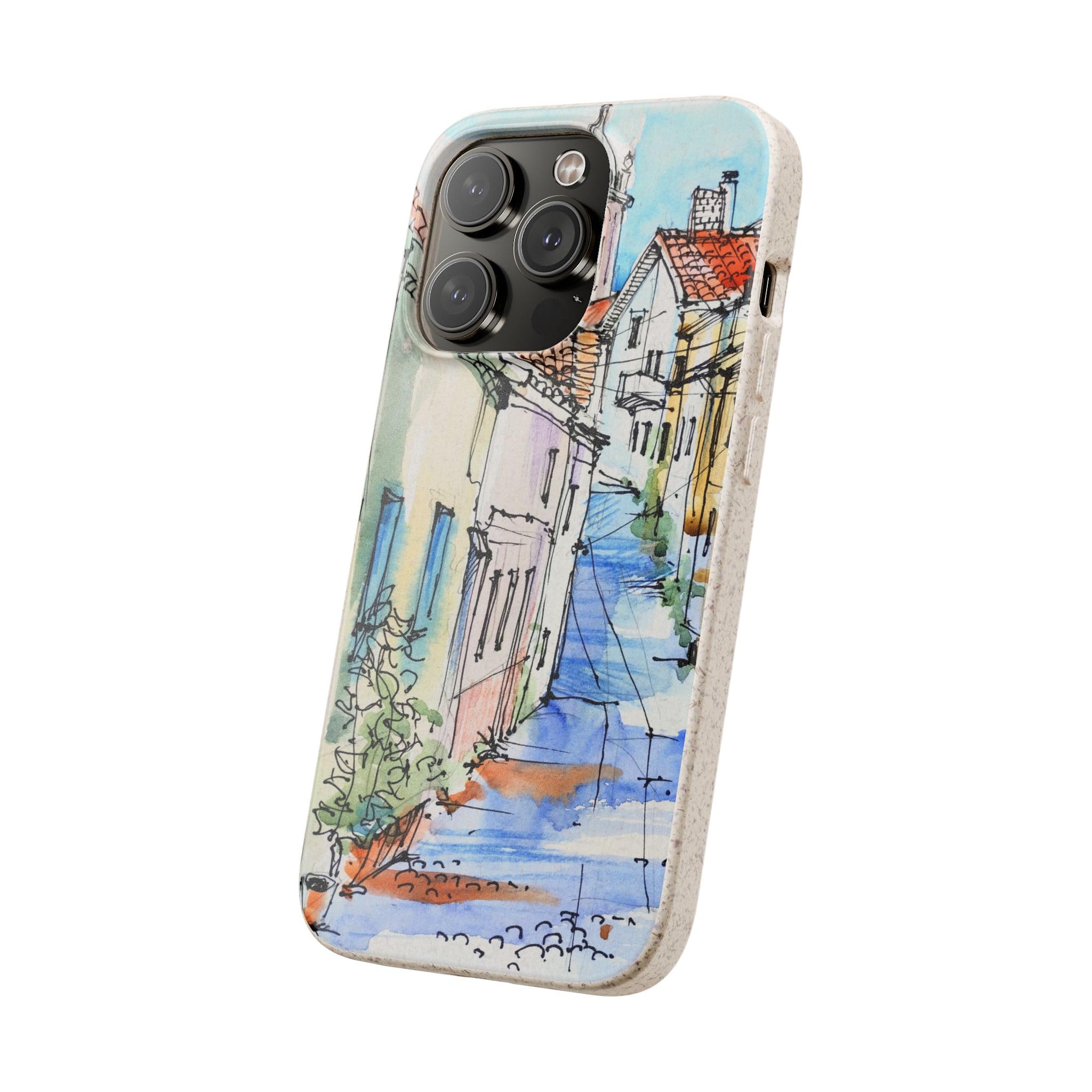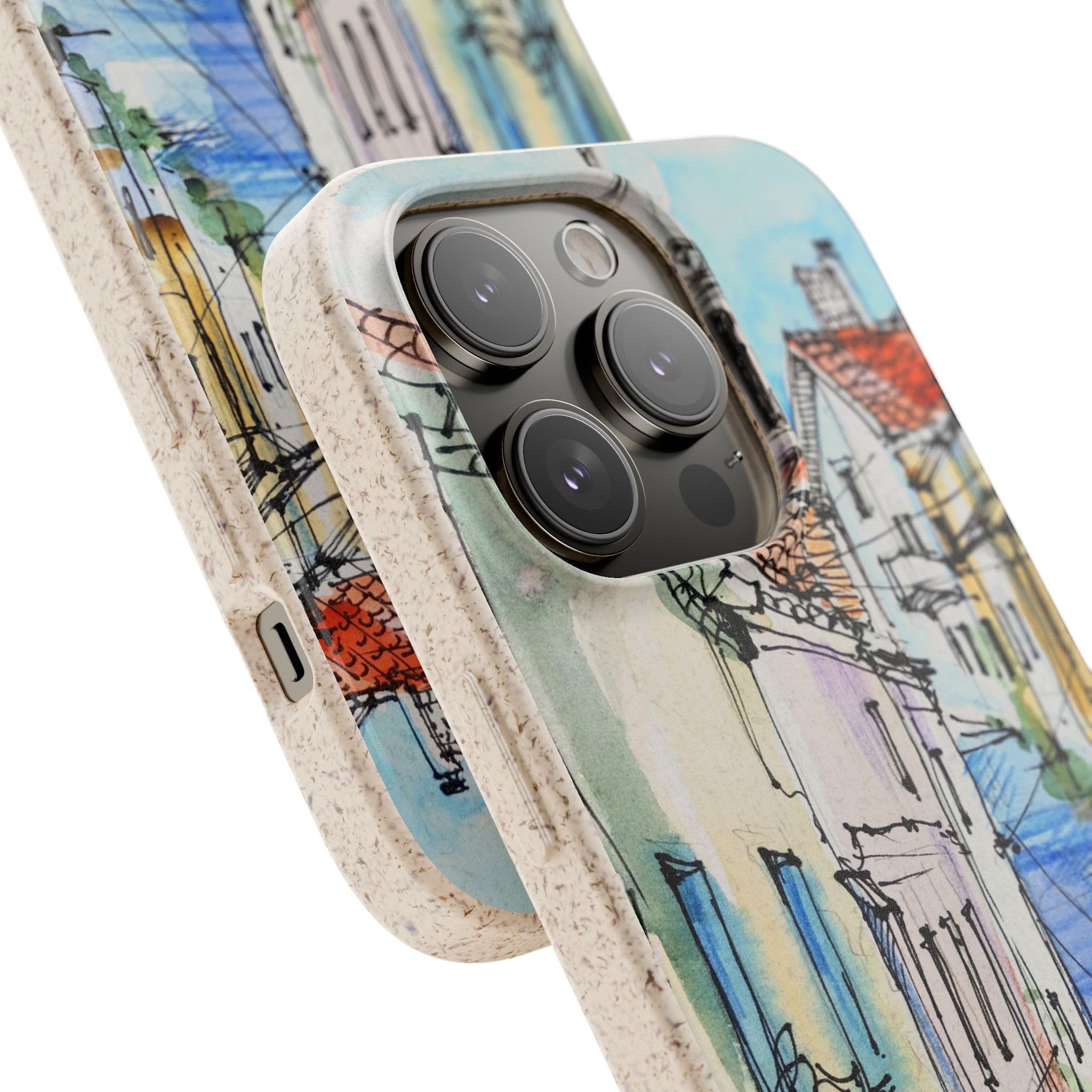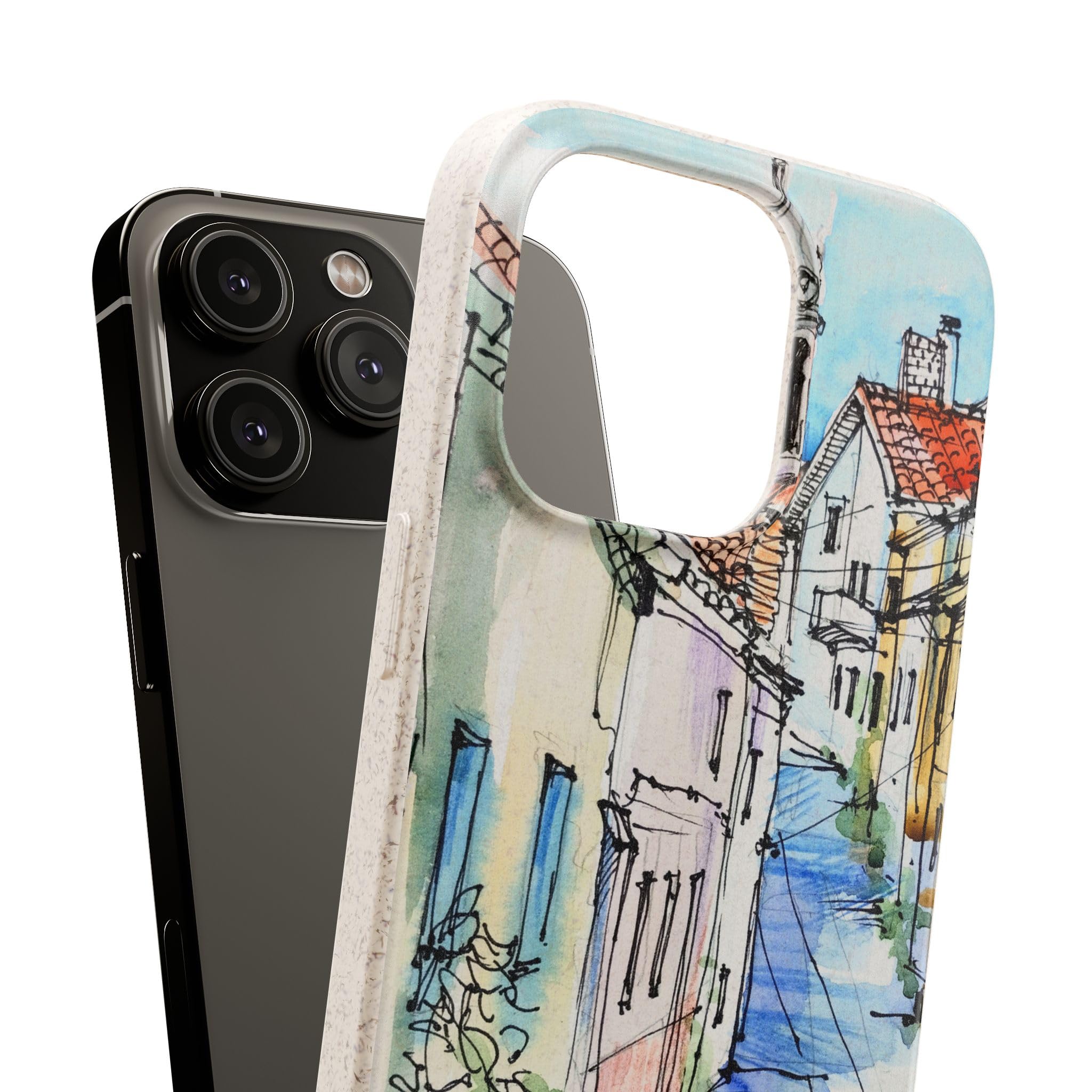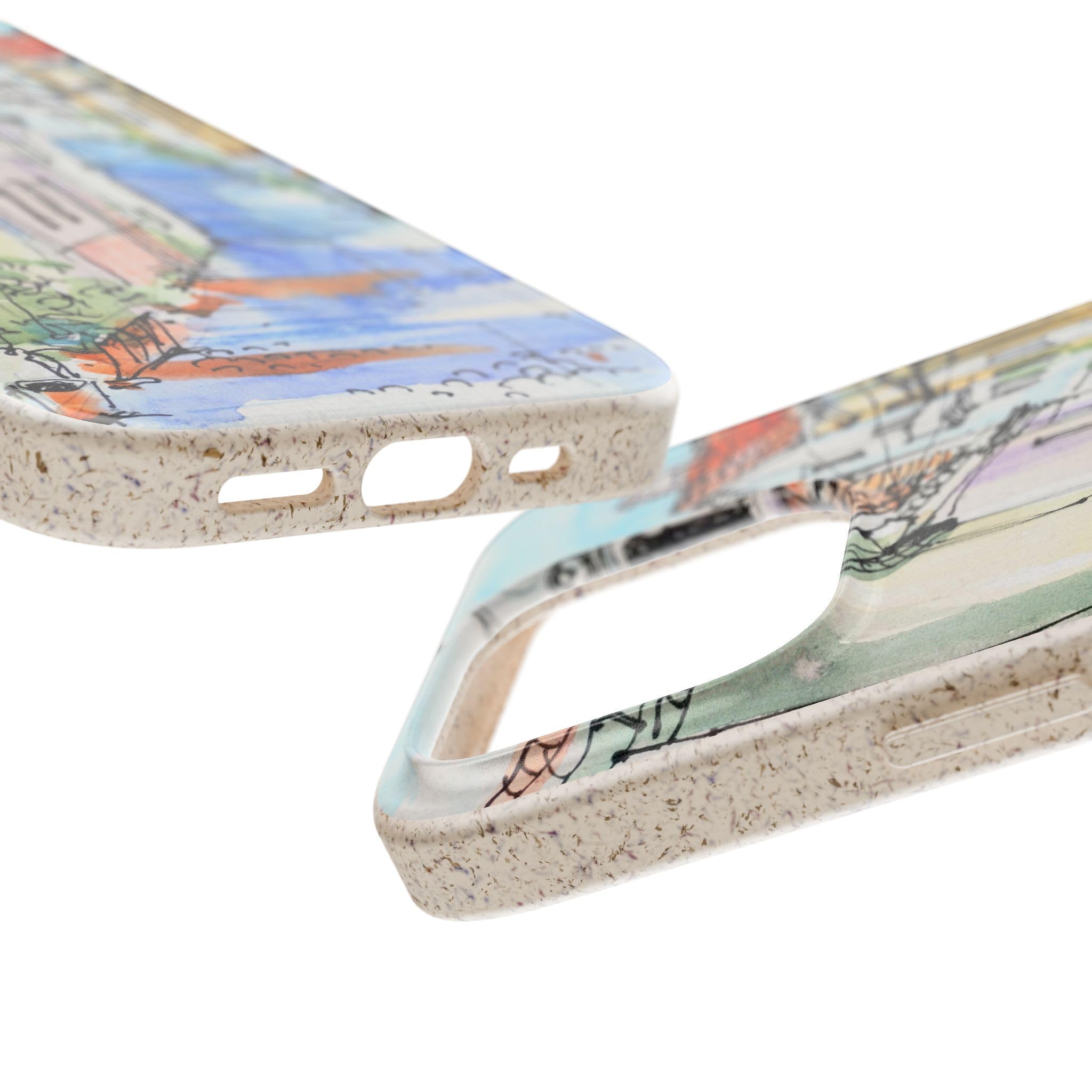 Protect your phone in style while protecting the planet! Embrace nature with our European Town Art Biodegradable Phone Case, featuring a charming illustration of a colorful European street scene. The design showcases quaint cobblestone roads, vibrant historic homes, and a picturesque chapel, all beautifully rendered in watercolor and fine pen detail. Perfect for lovers of travel-inspired art, European architecture, and the warm, nostalgic feel of hand-painted urban landscapes. Crafted from eco-friendly, compostable materials, this sustainable phone case not only protects your device but also supports a greener planet — naturally biodegrading within 160 days of disposal. It’s lightweight, durable, and fully supports wireless charging for effortless everyday use. Available for multiple phone models. Order yours today and carry the beauty of nature wherever you go! Details: .: Materials: PLA and PBAT polymers, bamboo fibre .: Matte finish .: Wireless charging compatible .: Precise cut outs for connectivity .: Might have a natural scent