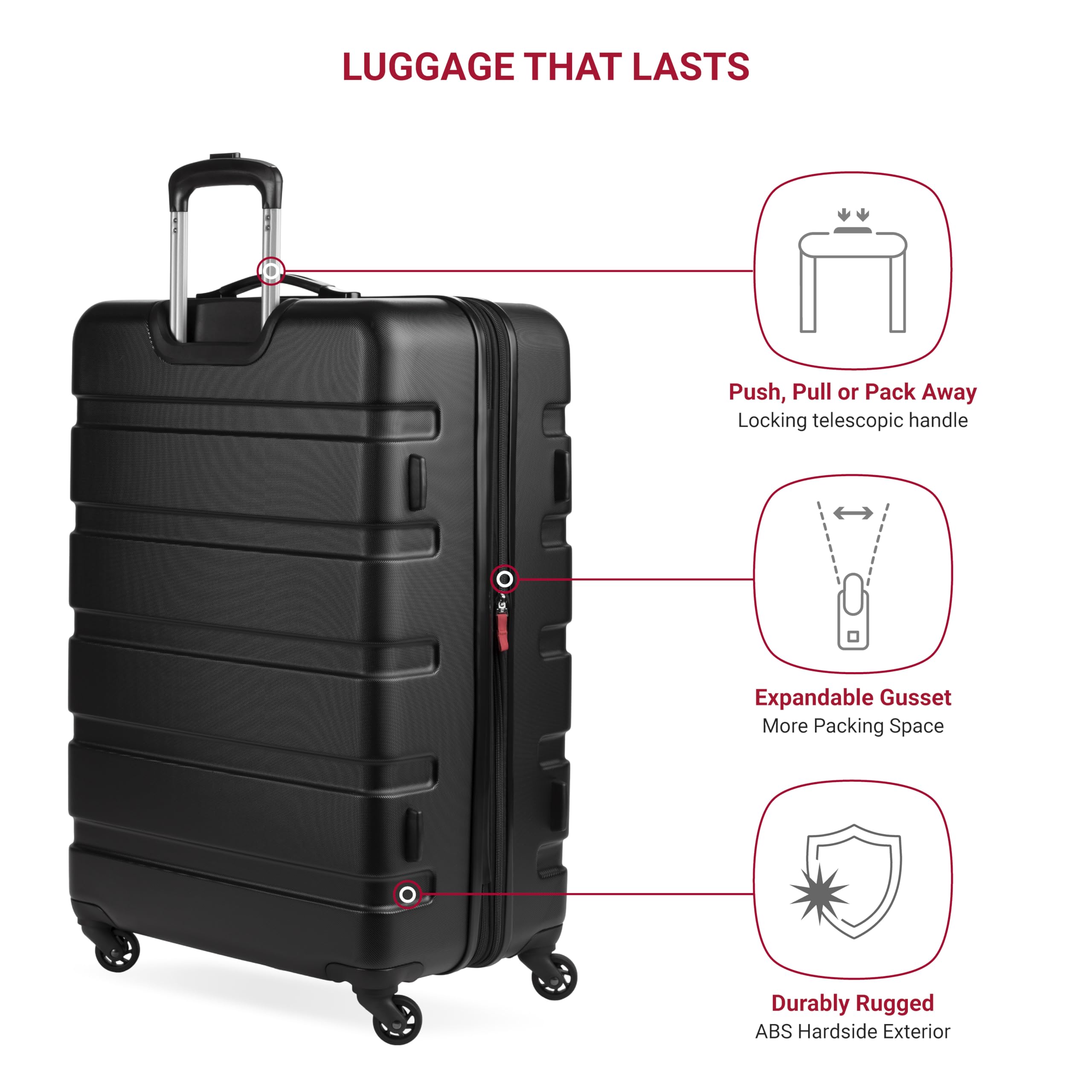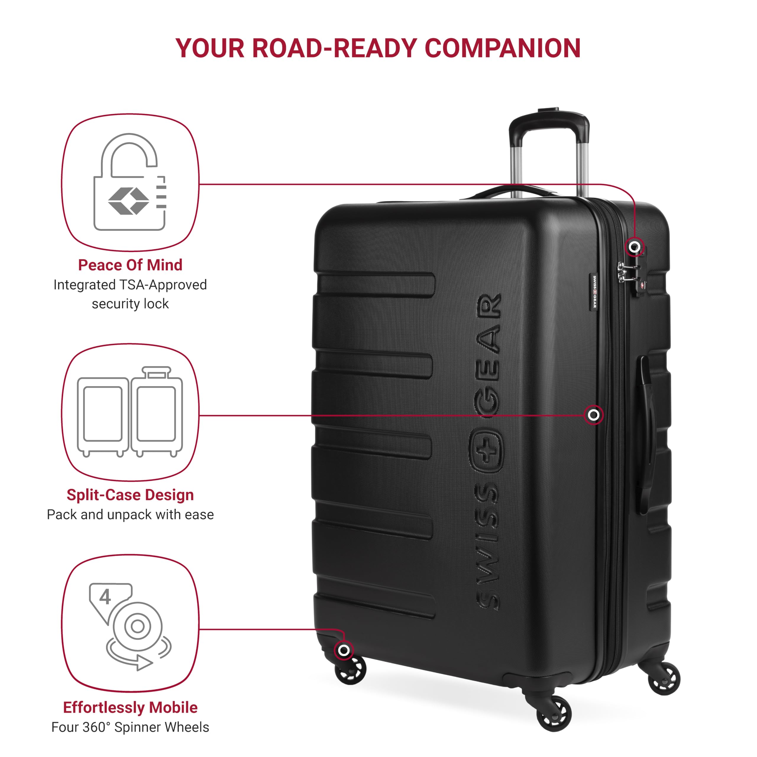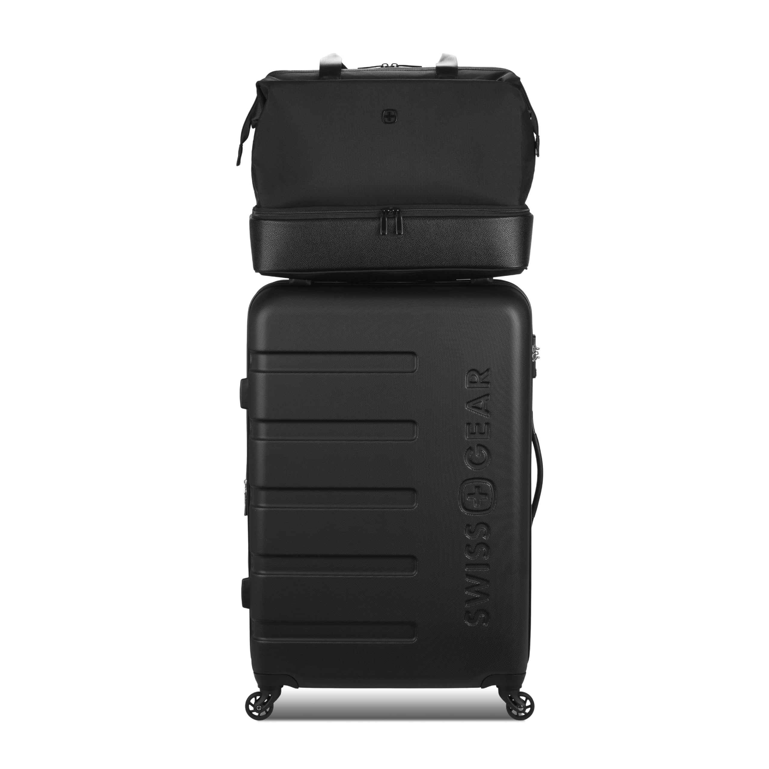 Description Travel in style and confidence with the SwissGear 7366 Expandable Hardside Luggage Set. Designed for durability and modern convenience, this set includes a versatile Weekender Tote and a 27” large checked suitcase—perfect for any travel itinerary. The Weekender Tote features a wire-frame opening for easy packing, a key hook, a trolley strap for secure stacking, and a zippered bottom compartment ideal for shoes or extra essentials. The hardside suitcase boasts an almost indestructible split-case design, offering an organized interior with tie-down straps, a zippered lid pocket, and a spacious packing compartment to keep your belongings secure. With smooth four-wheel 360-degree spinner mobility, a premium steel locking telescopic handle, and expandable packing capacity, this set ensures stress-free travel. For added security, the hardside suitcase includes a built-in TSA-approved three-dial combination lock. Whether you're traveling for business or leisure, this stylish and functional luggage set is designed to keep you organized and ready for any adventure.