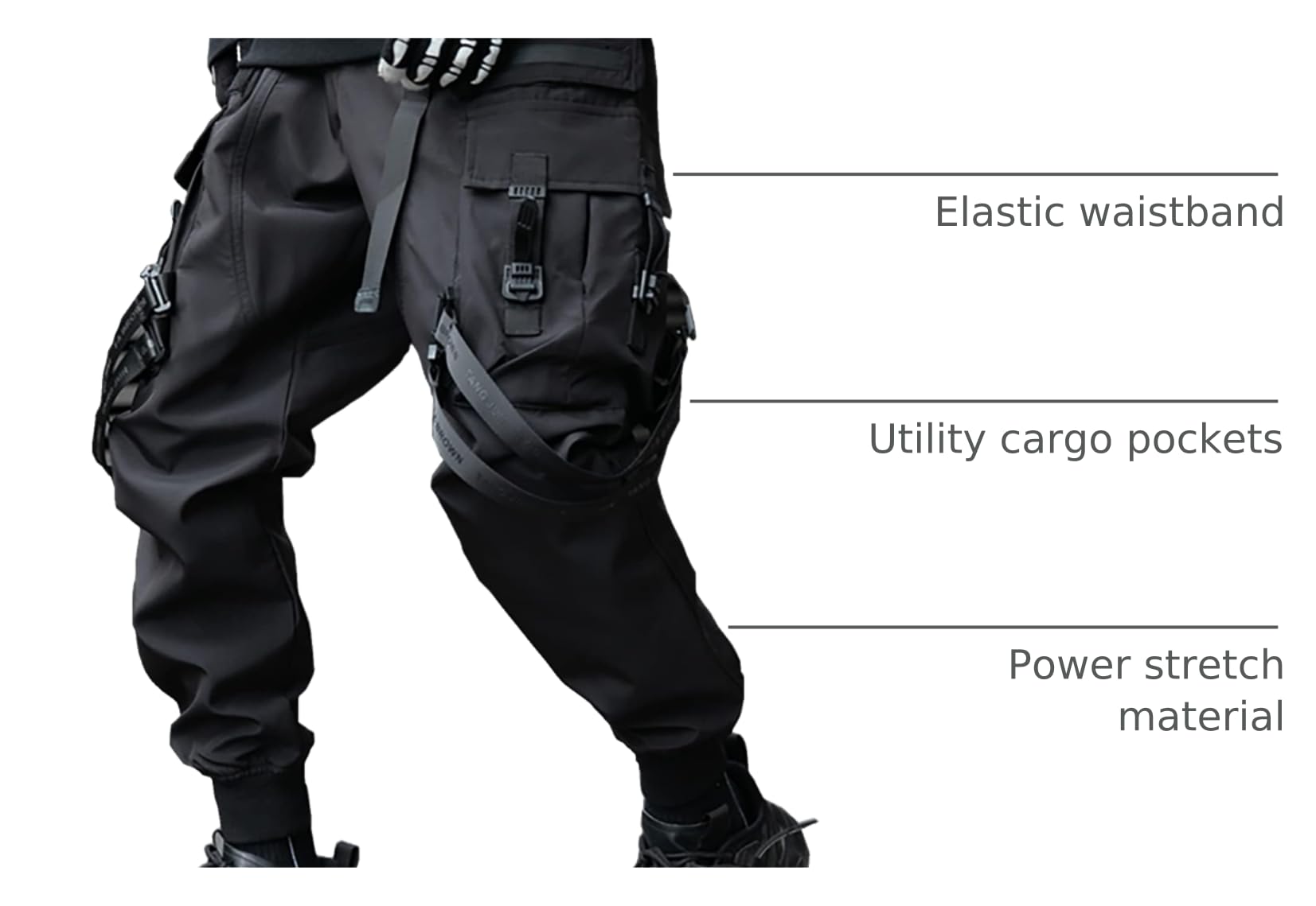 Description Techwear cargo pants made from power stretch material for comfort and fit. Cut in a relaxed fit silhouette. Features utility style cargo pockets for extra storage. These jogger pants perfect for both streetwear and techwear enthusiasts.