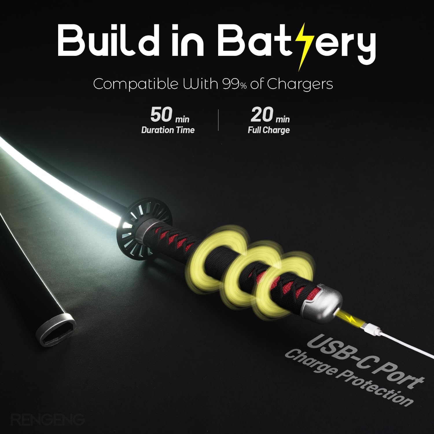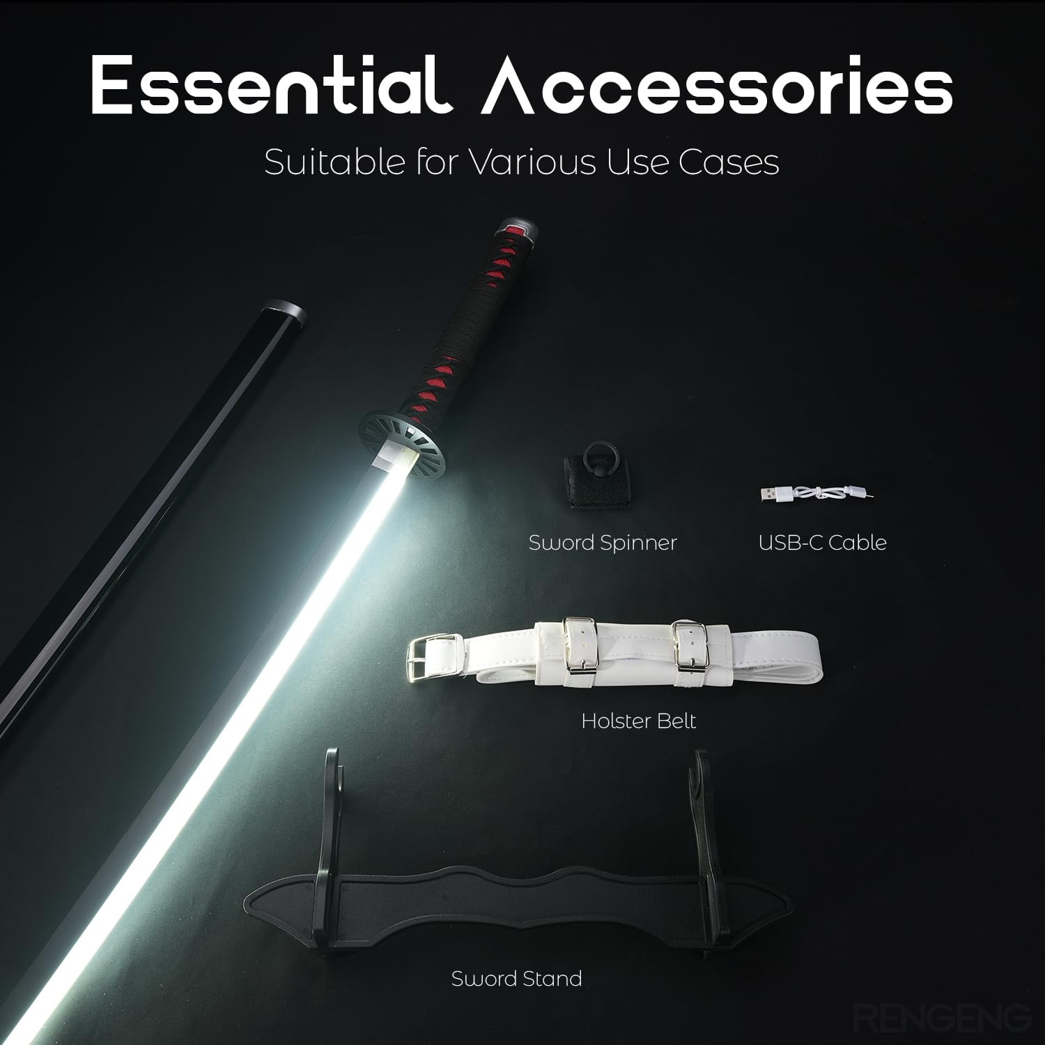 [Packaging Includes] This package contains: Light Up Sword x1, Holster Belt x1, Sword Stand x1, Sword Spinner x1, and USB-C Cable x1