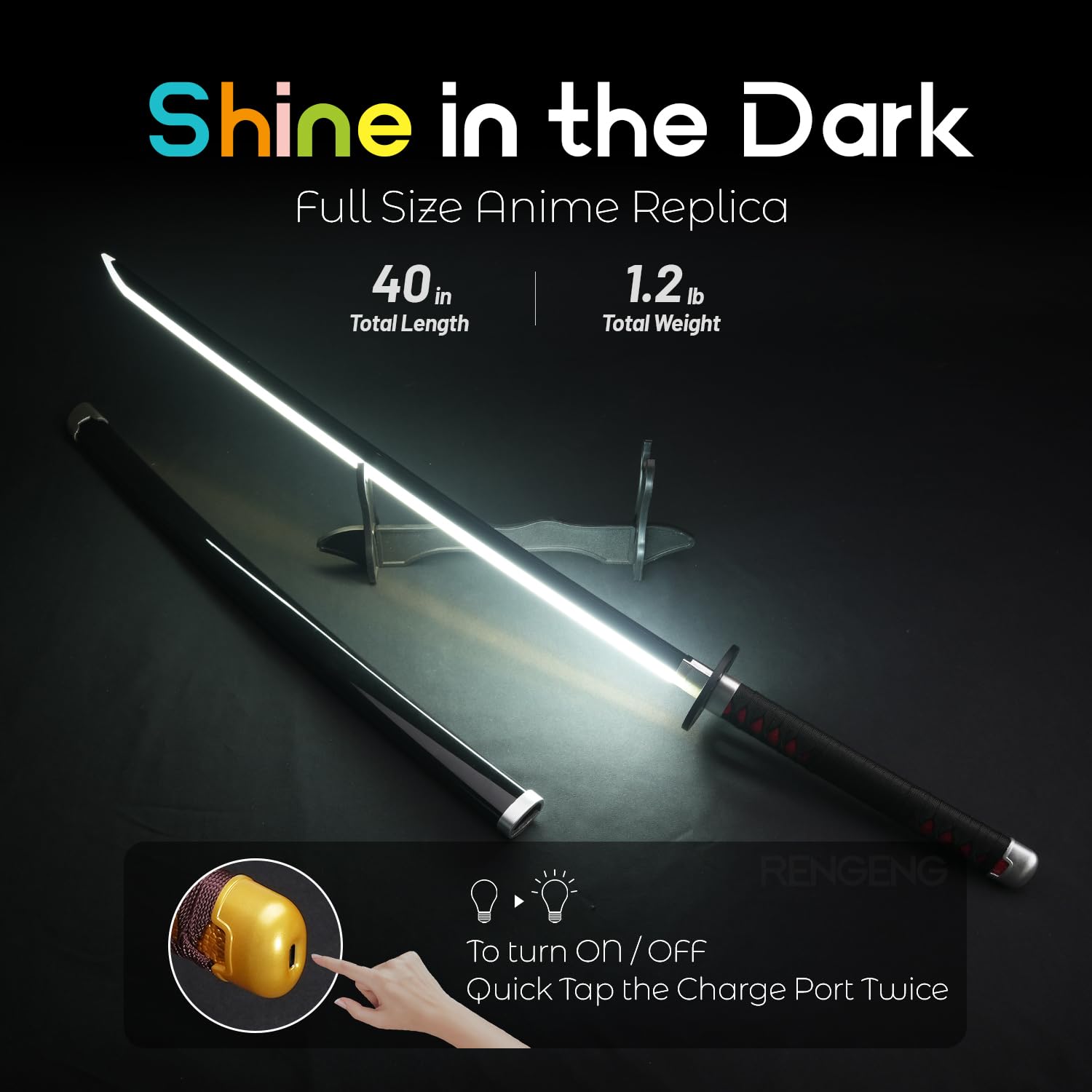 [Rechargeable] The light-up sword is powered by a rechargeable battery that lasts up to 50 minutes on a full charge, which takes about 20 minutes. Turning the light on or off is as simple as tapping the charging port on the handle twice