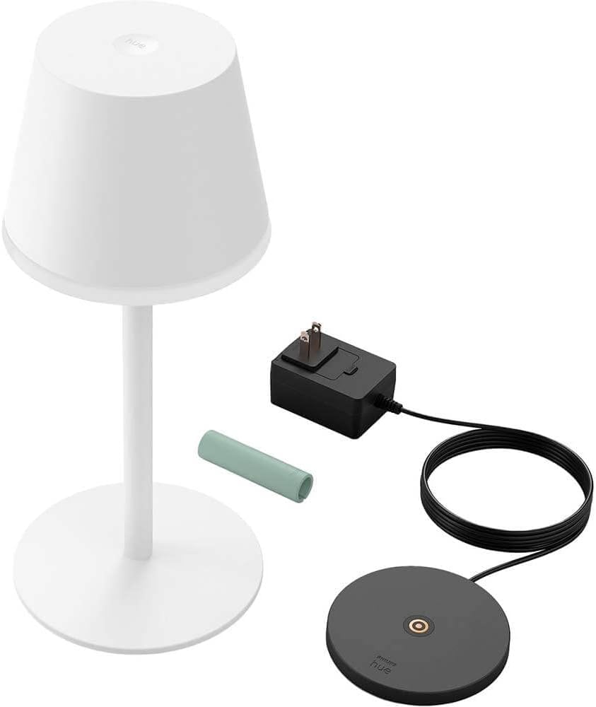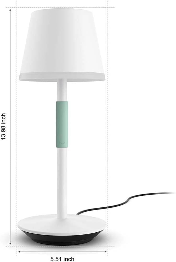 Take smart light with you indoors and outside: With the Philips Hue Go portable table lamp you can take smart light with you. Rated for outdoor use and featuring a handy silicone grip, it's easy to carry where you need light most: inside to read or outside to illuminate a dinner party. Its 48-hour battery life means its light will last, too -- and recharging is easy with the included charging base. Use the button on top of the lamp to cycle through preset light scenes or the Hue app to play with millions of colors of white and color light.