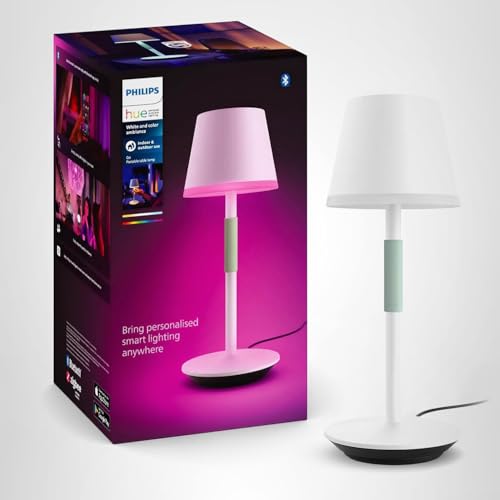 WHAT’S IN THE BOX - Includes one white Hue Go portable table lamps with White and Color Ambiance smart, color-changing bulbs; Designed for both indoor and outdoor use, with a silicone grip and IP54 rating (protected against dust and splashing water)