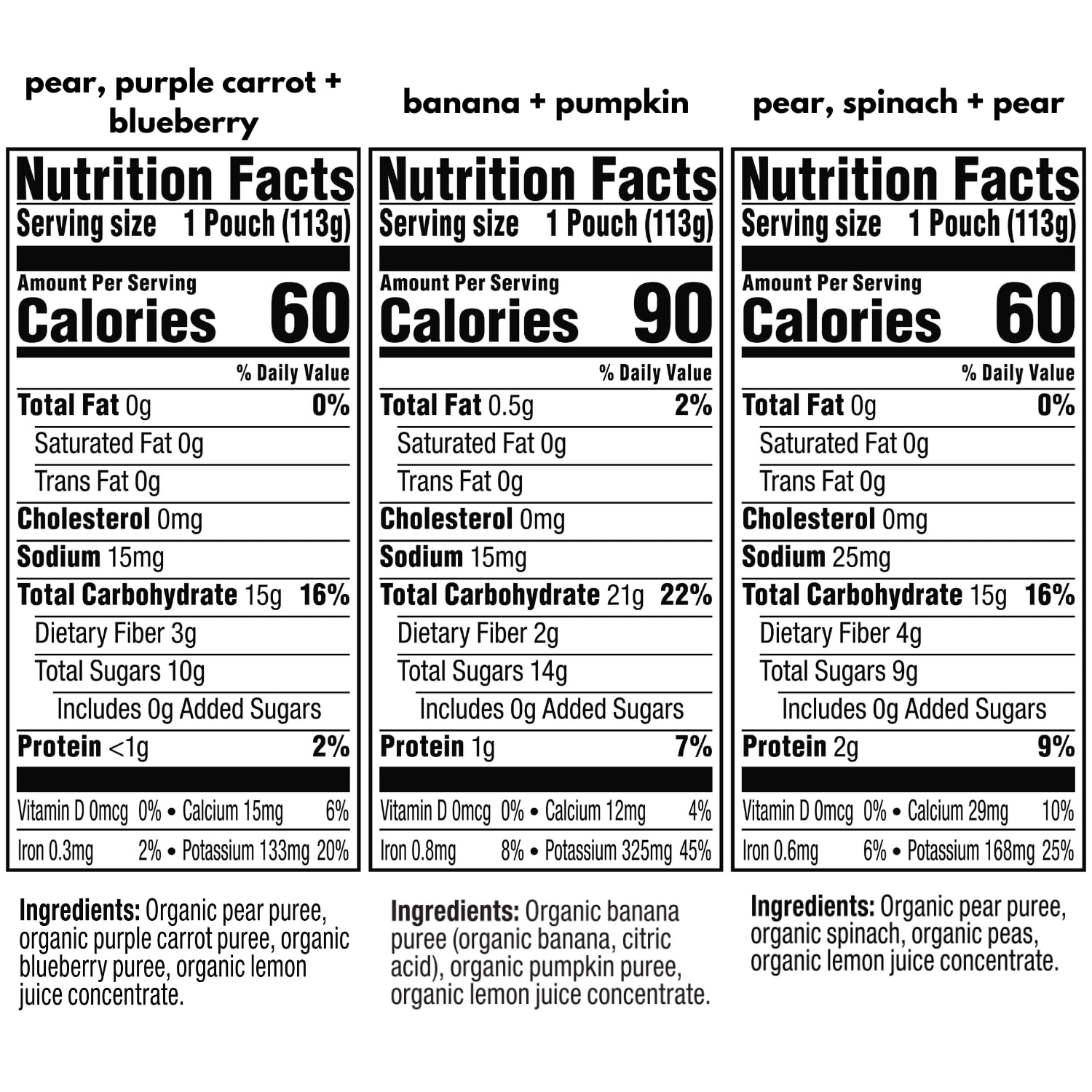 MADE WITH NATURAL FLAVORS: Pear, Purple Carrot, and Blueberry, Banana and Pumpkin, and Pear, Spinach, and Pea blends made with organic purees