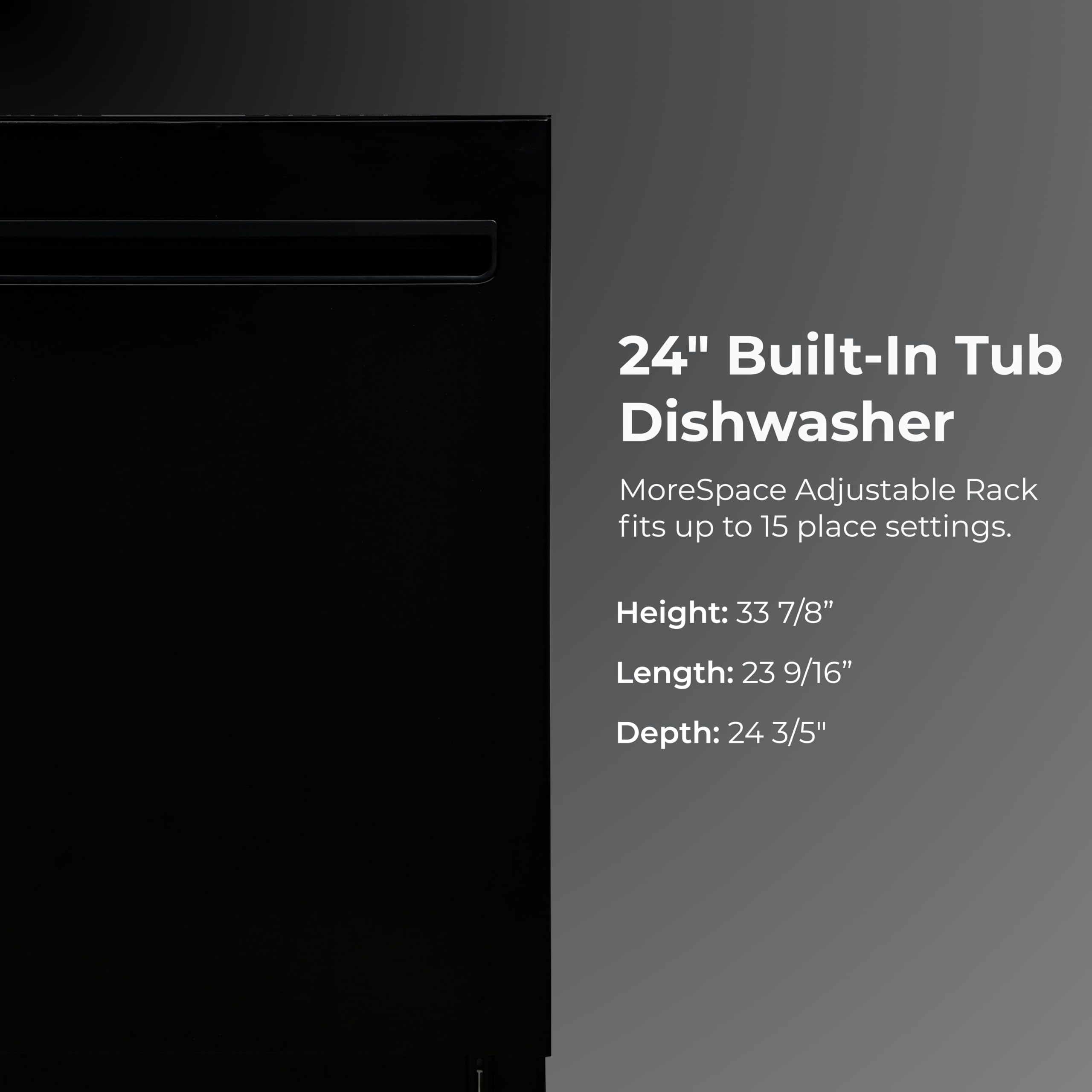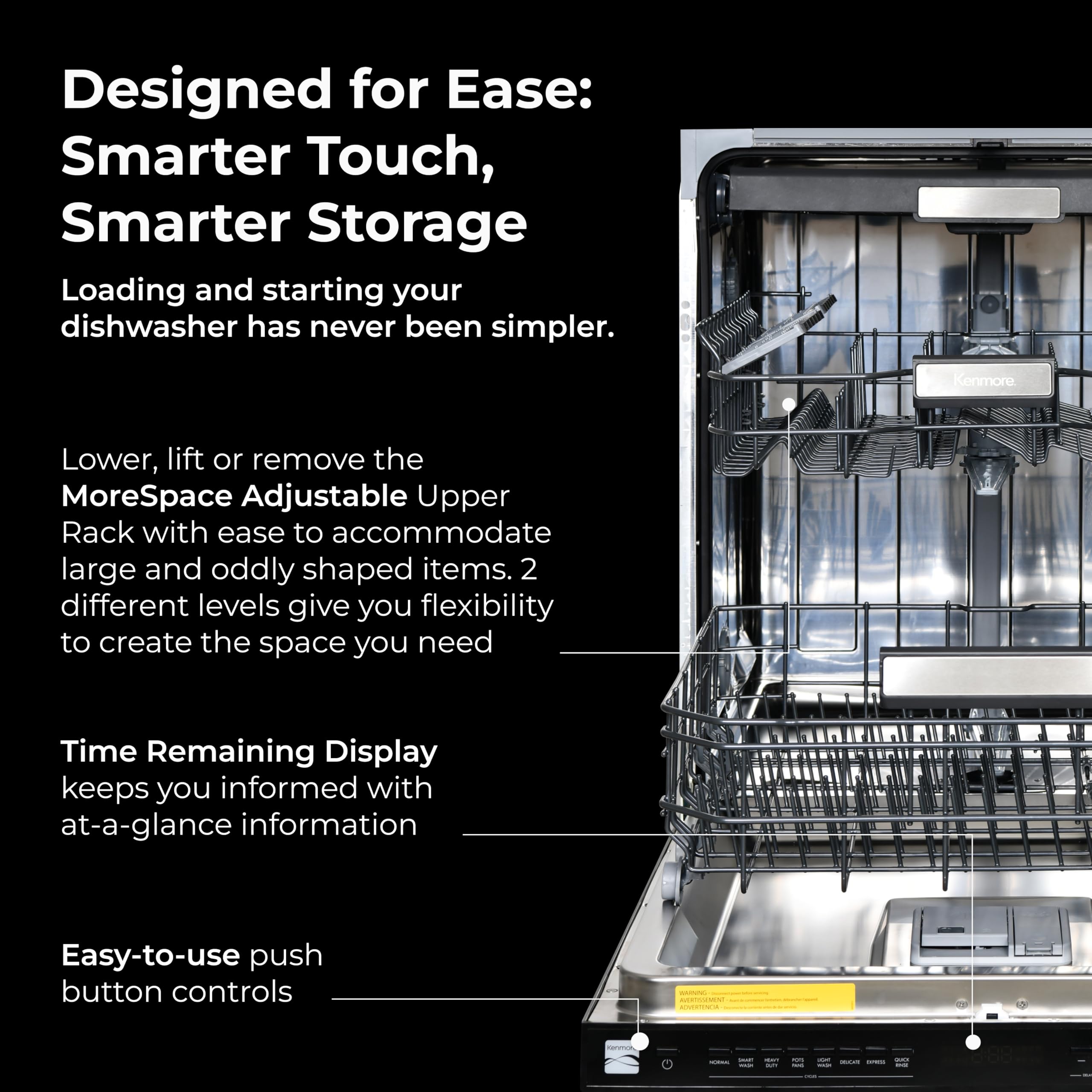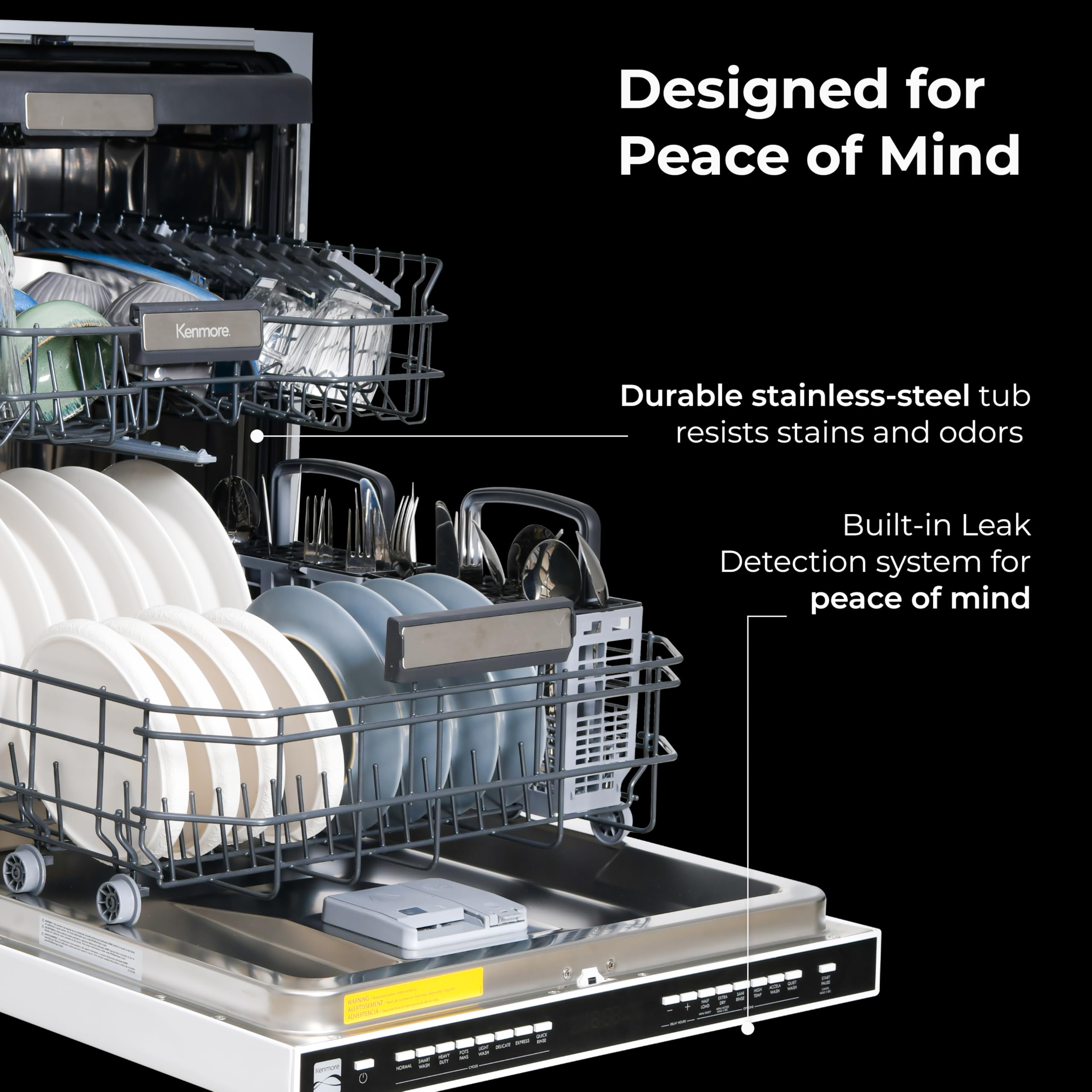 Tackle tough messes fast with the Kenmore 24" Built-In Dishwasher. UltraWash Plus uses 3 pressurized spray arms and filtered water to blast away stuck-on food from every angle. The SmartWash Cycle detects the amount of soil in the water and automatically adjusts water temperature, pressure, and cycle time for a customized clean that saves time and resources. When you’re in a hurry, the Accela Wash Option uses slightly more water and energy to deliver faster cleaning—perfect for back-to-back loads. TurboDry combines a built-in fan and heating element to remove moisture at the end of the cycle, even on plastic containers. The Extra Dry Option adds time and heat for a boost on hard-to-dry items. Fit up to 15 place settings in the spacious stainless steel tub, which resists stains and helps retain heat to improve drying. The flexible MoreSpace Adjustable Rack can be raised or lowered to fit tall cookware, awkward dishes, or delicate stemware. The 3-stage UltraWash Filter captures food particles as small as a grain of sand and drains them away, so they don’t redeposit on clean dishes. For added peace of mind, the built-in Leak Detect System monitors water flow throughout the cycle. If a problem is detected, the dishwasher will automatically drain the tub and alert you. The Quiet Wash Option reduces noise by adjusting wash temperature and cycle duration, so cleanup won't interrupt your evening. With the Delay Start Option, you can run the dishwasher on your schedule—up to 24 hours in advance. ENERGY STAR certified to help reduce energy and water usage with every load.