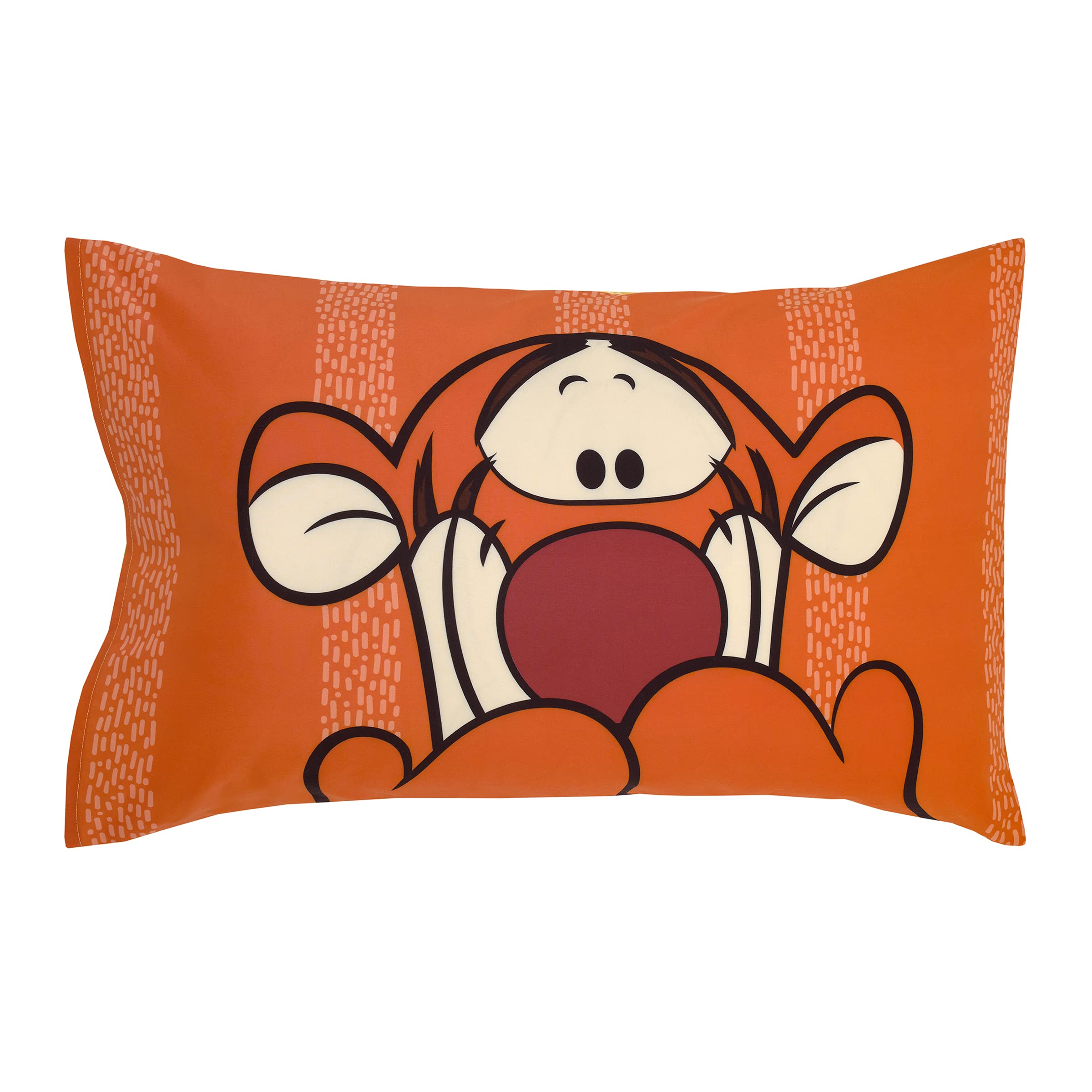 Disney Winnie the Pooh and all his friends are ready for fun on the Funny Friends 4 Piece Toddler Bed Set. This set includes a comforter, fitted bottom sheet, flat top sheet and reversible pillowcase, all in bright shades of aqua, blue, gold and orange - perfect for boys and girls alike. The printed 57" x 42" comforter front features Pooh, Tigger, Eeyore and Piglet on an aqua striped background surrounded by trees; the comforter back is solid aqua. The reversible 20" x 30" pillowcase features loveable Pooh with his hand stuck in his hunny pot on a gold background, the reverse has Tigger on an orange background. The set is finished with a fitted sheet and top sheet, both in solid aqua. Elastic is featured all the way around the fitted sheet for a safe and snug fit. Top sheet measures 45" x 60". The set is made from super soft fabrics, and fits a standard size toddler bed, using a 28" x 52" crib/toddler mattress. Machine washable for easy care!
