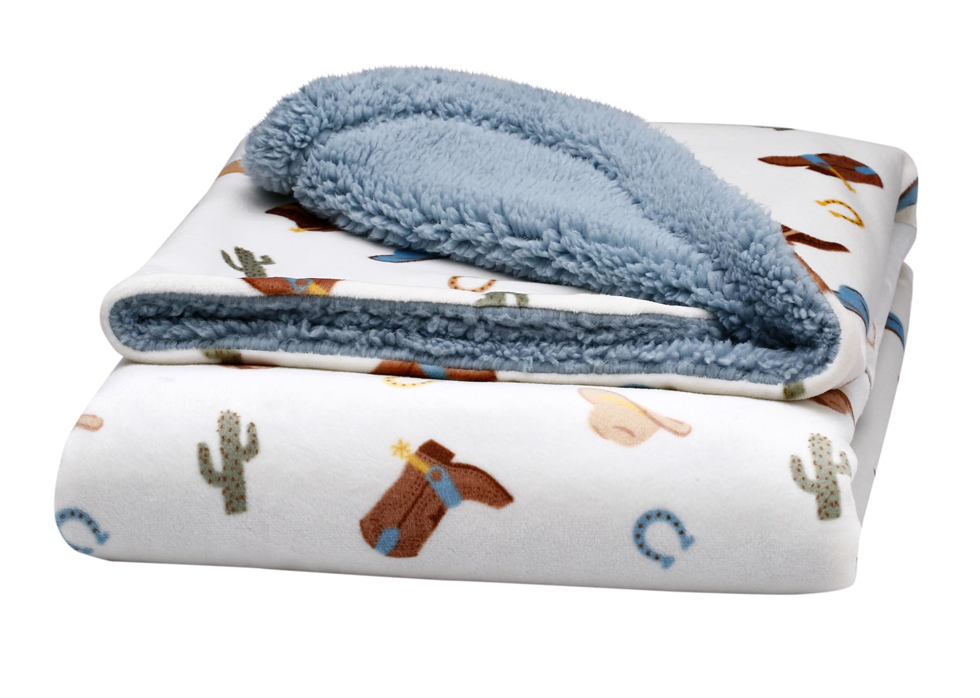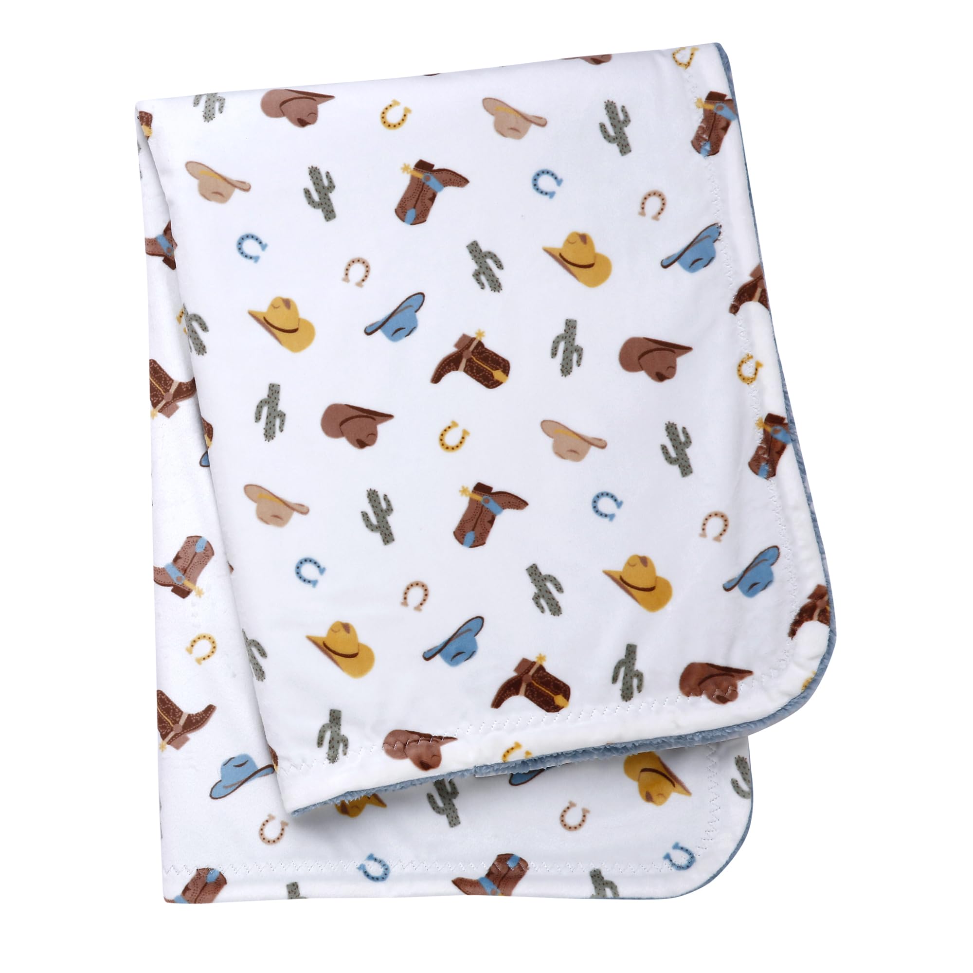 Soft and cuddly, this silky soft baby blanket (30 in x40 in) is the perfect for a new baby and parents. The soft, double layer reversible blanket is printed on one side and a solid color on the reverse. The western ranch design is accented with cowboy hats, boots, horseshoes and grey on the reverse. The 2 ply blanket is great for snuggling and tummy time at home or while traveling with baby.