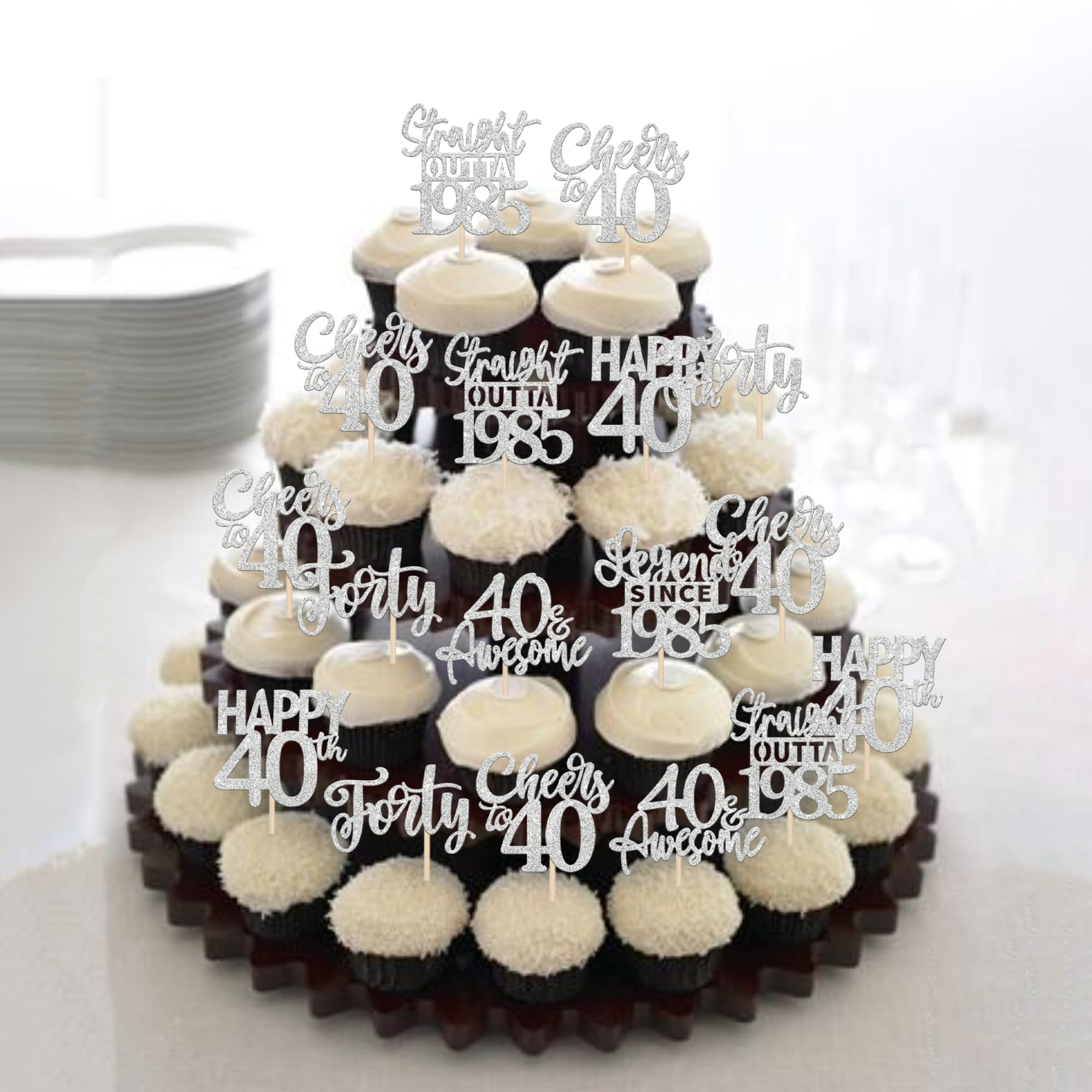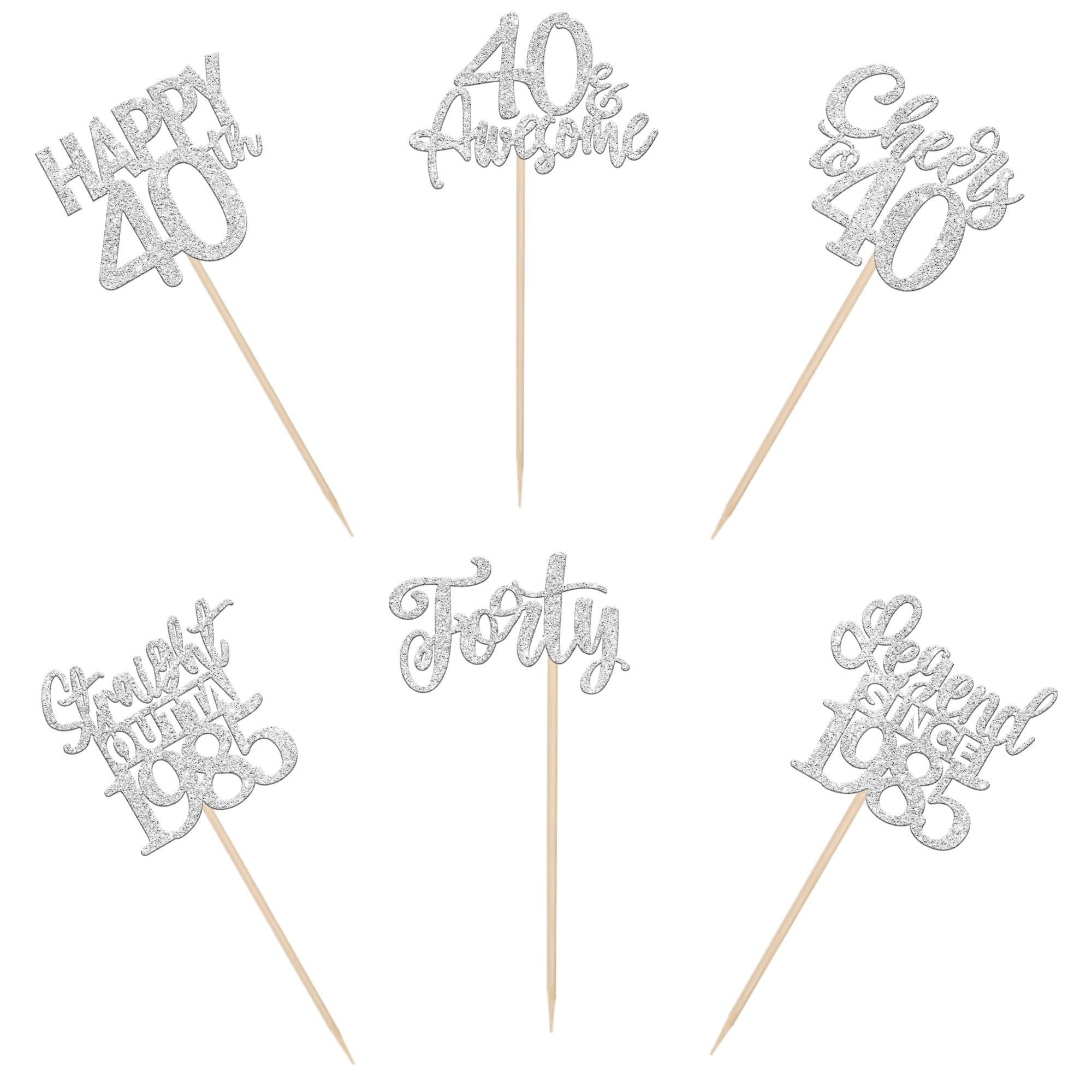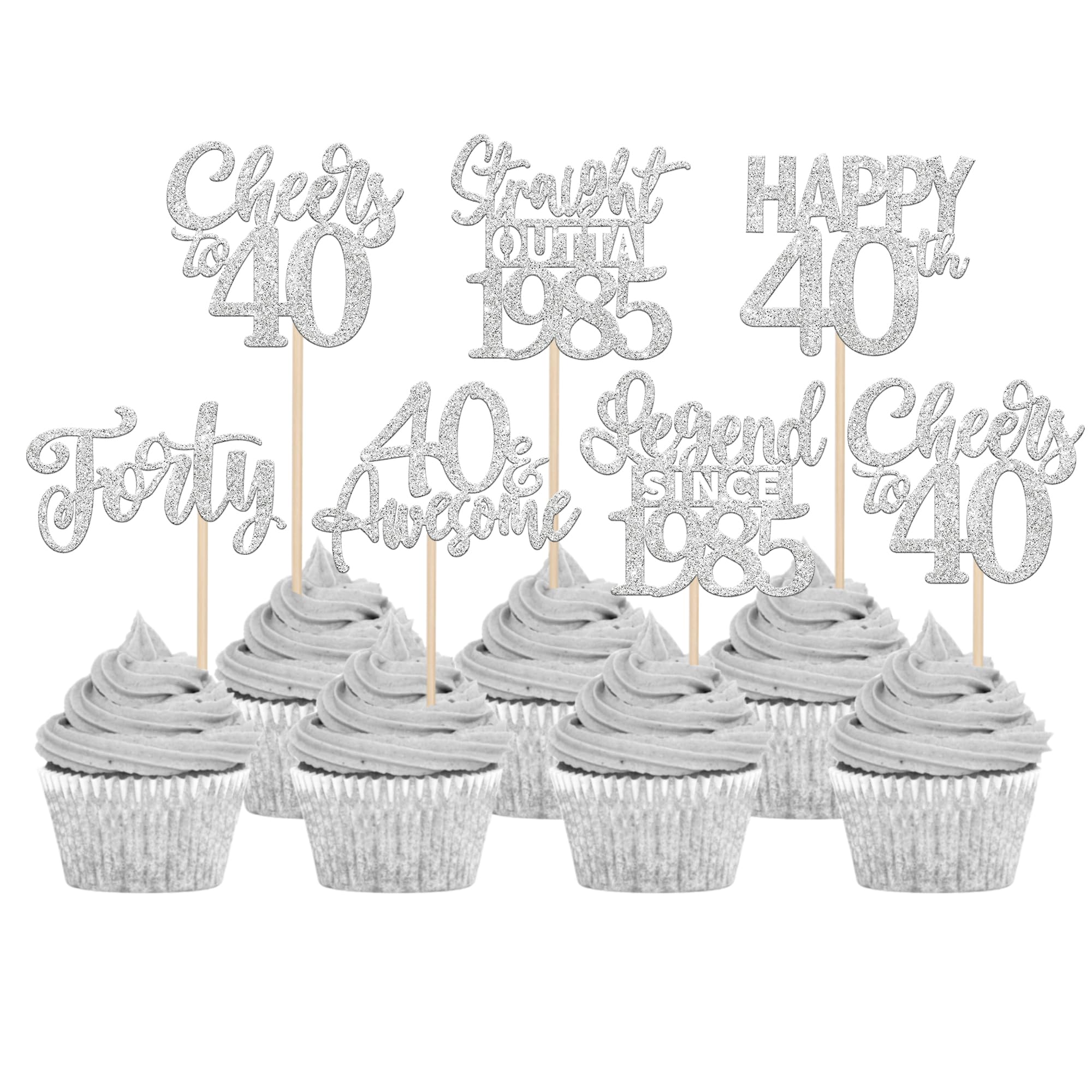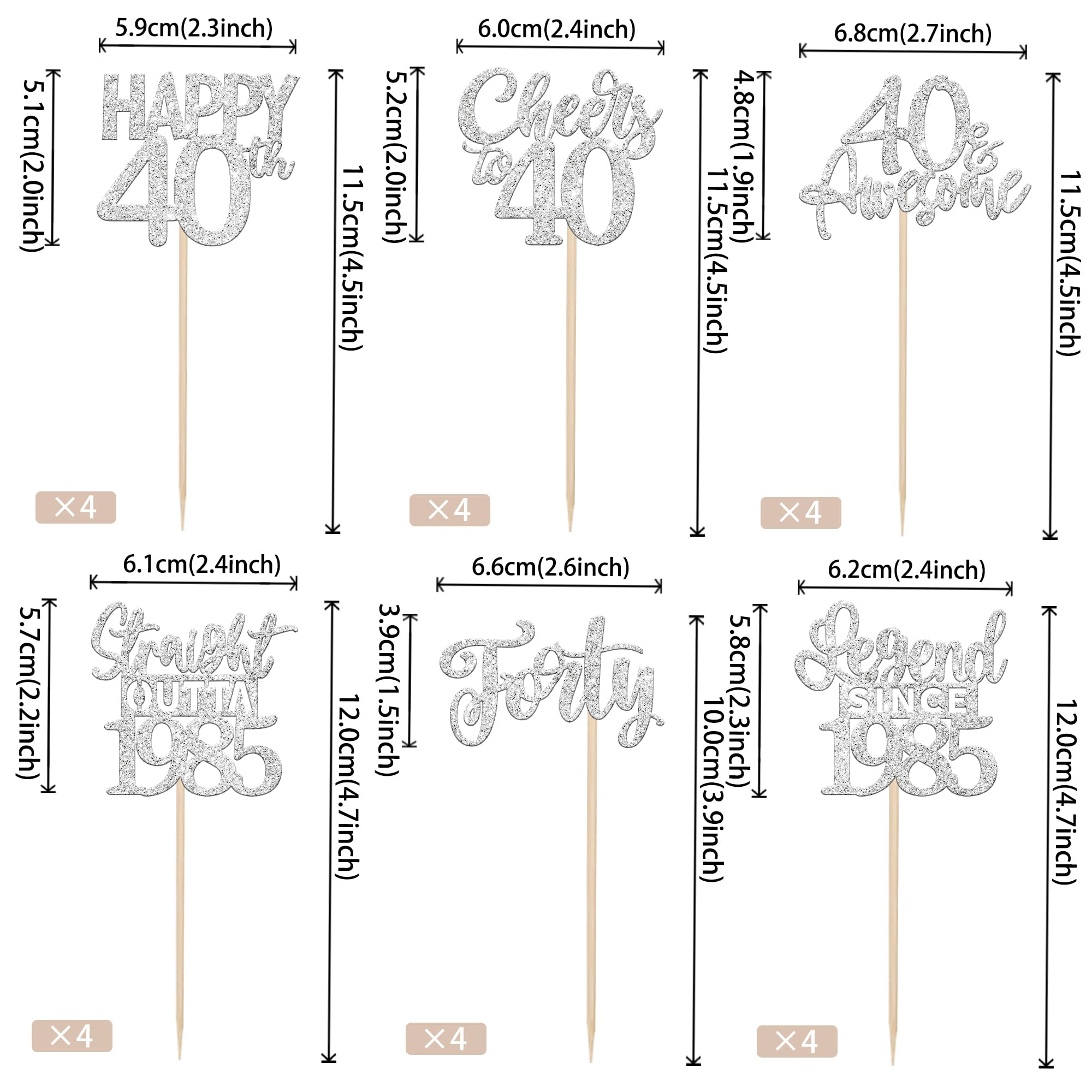 24PCS Happy 40th Birthday Cupcake Toppers Forty Straight Outta 1985 Cupcake Picks Cheers to 40 Birthday Decorations Lengend Since 1985 Cupcake Decorations for 40th Birthday Anniversary Party Cake Decorations Supplies Perfect for legend since 1985 theme party, 40th anniversary theme party,cheers to 40 years theme party, 40 awesome theme party cupcake decorations supplies. Pack of 24 pcs,4 pcs of each design. The size is 2.3*4.5/ 2.4*4.5/ 2.7*4.5/ 2.4*4.7/ 2.6*3.9/ 2.4*4.7 inch ( with stick ) Made of high quality paper card stock,thick and sturdy. These straight outta 1985 cupcake toppers are one side glitter, another side is white, and they are intended for decoration only, please do not put them in oven or microwave. If the item you received has any defects, please contact us immediately.we will deal with it within 24 hours.