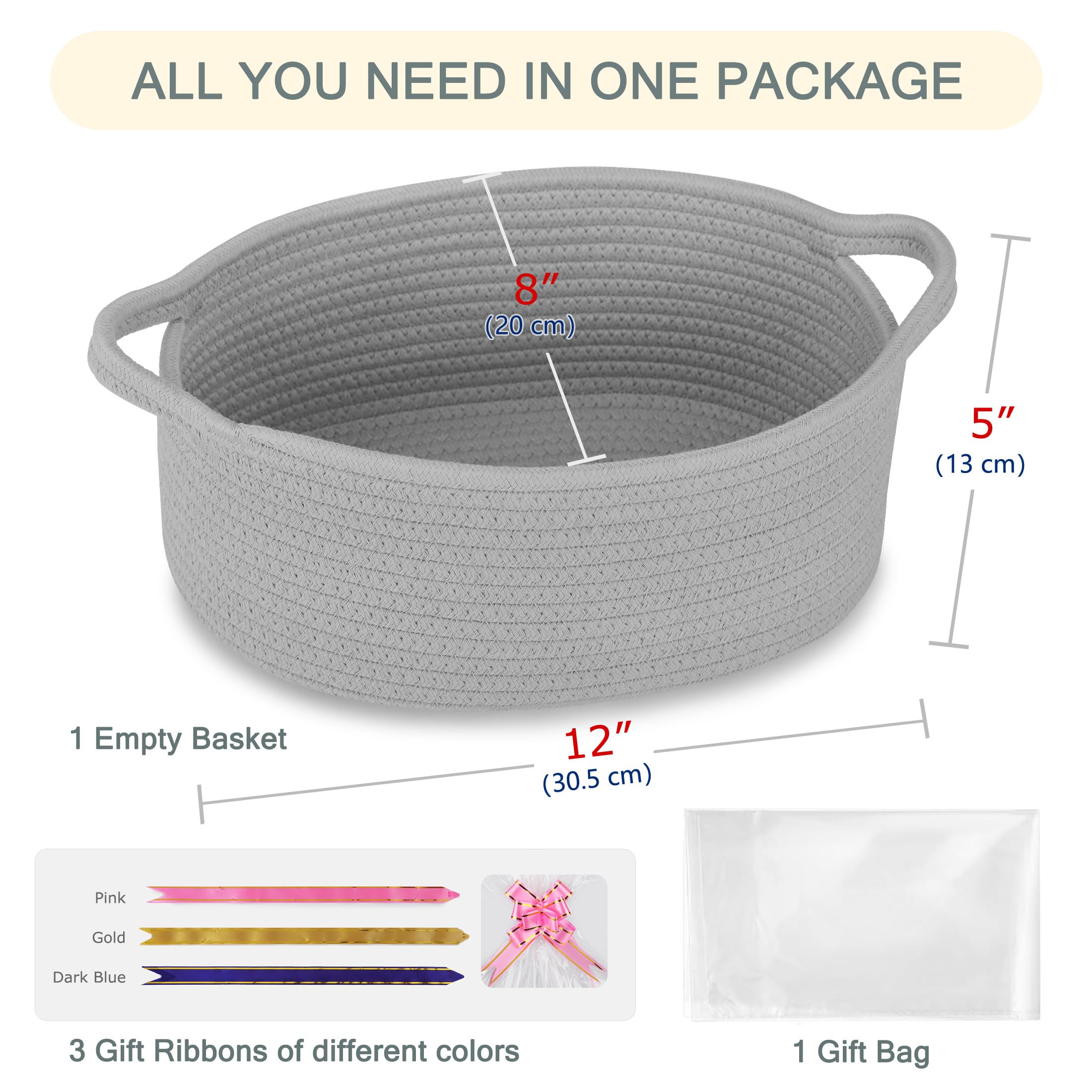【Ideal Size and Material】The cute small empty gift basket size is 12“ x 8” x 5”. The soft basket is made of natural cotton rope, a healthy, chemical-free material that is safe for kids and pets.Our gift baskets are available in a variety of colors.The classic solid color design enhances any room or decor in your home.