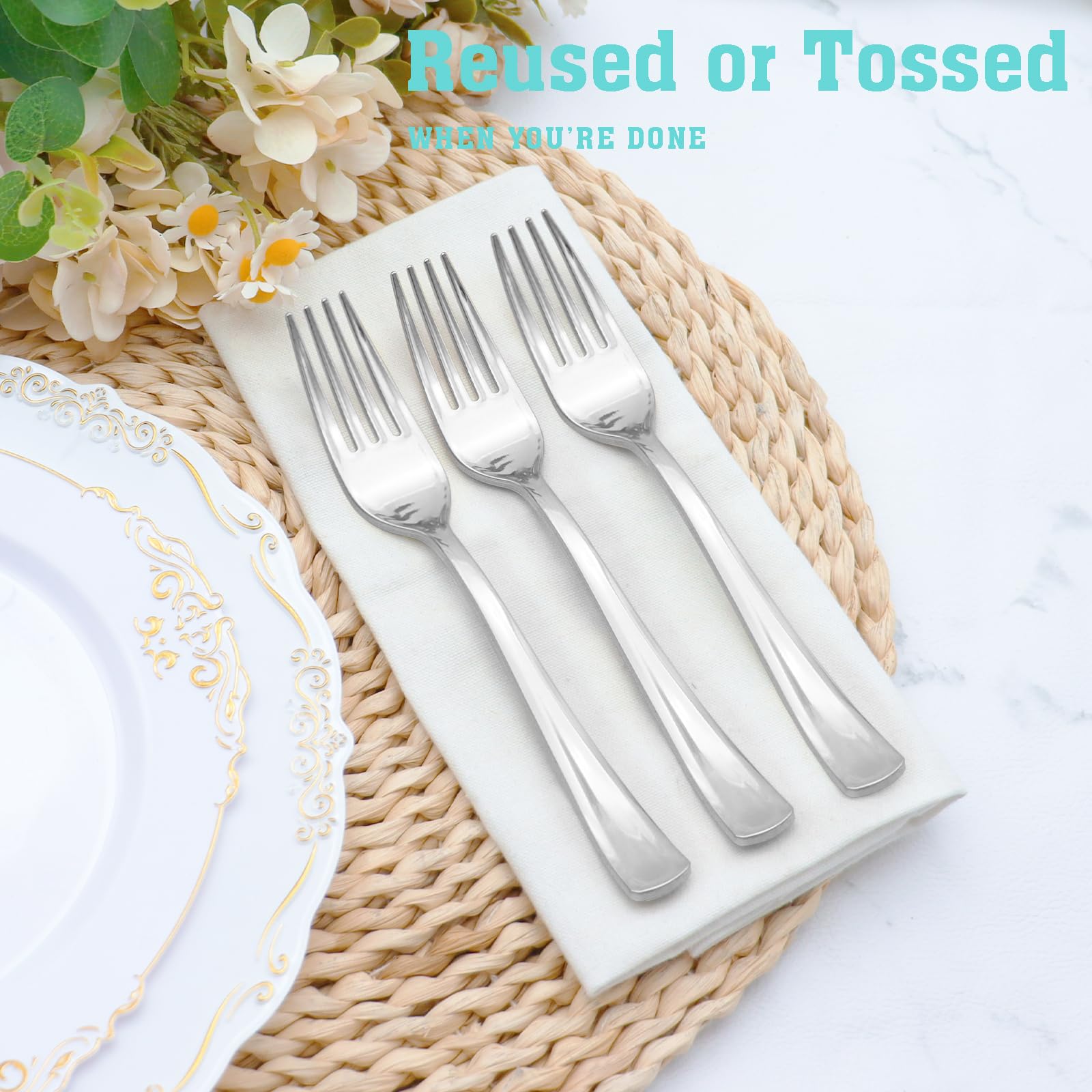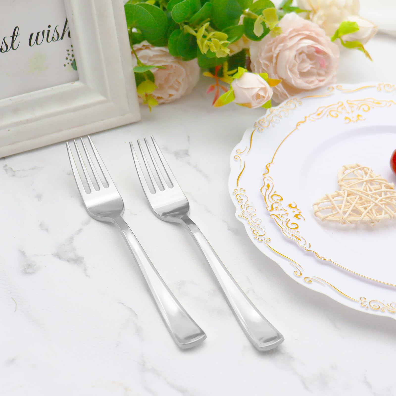 【High Quality Plastic Materials】: The silver plastic forks are made of high quality heavy-duty plastic materials with high strength and abrasion resistance, able to withstand normal use, not easy to break or deform, and the paint is not easy to peel off, ensuring the durability and reliability of the product.