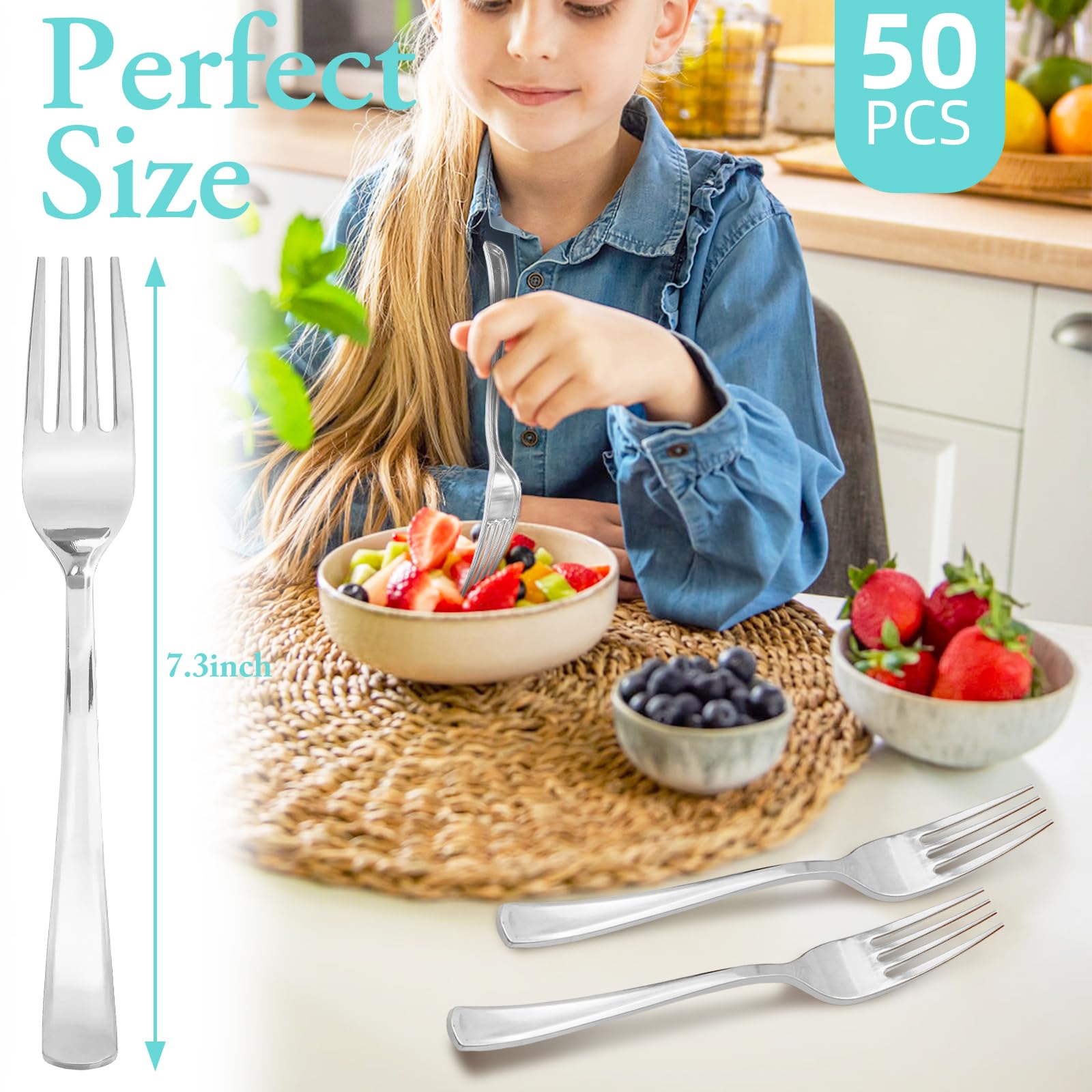【Large Capacity Package】: Each pack contains 50 silver plastic forks, no need to buy frequently, suitable for family storage, restaurant use or large party activities, easily meet the needs of many people. Offering multiple different color options, they are sure to match your decor.