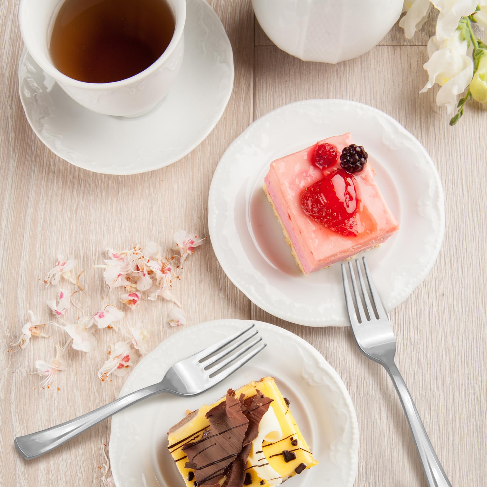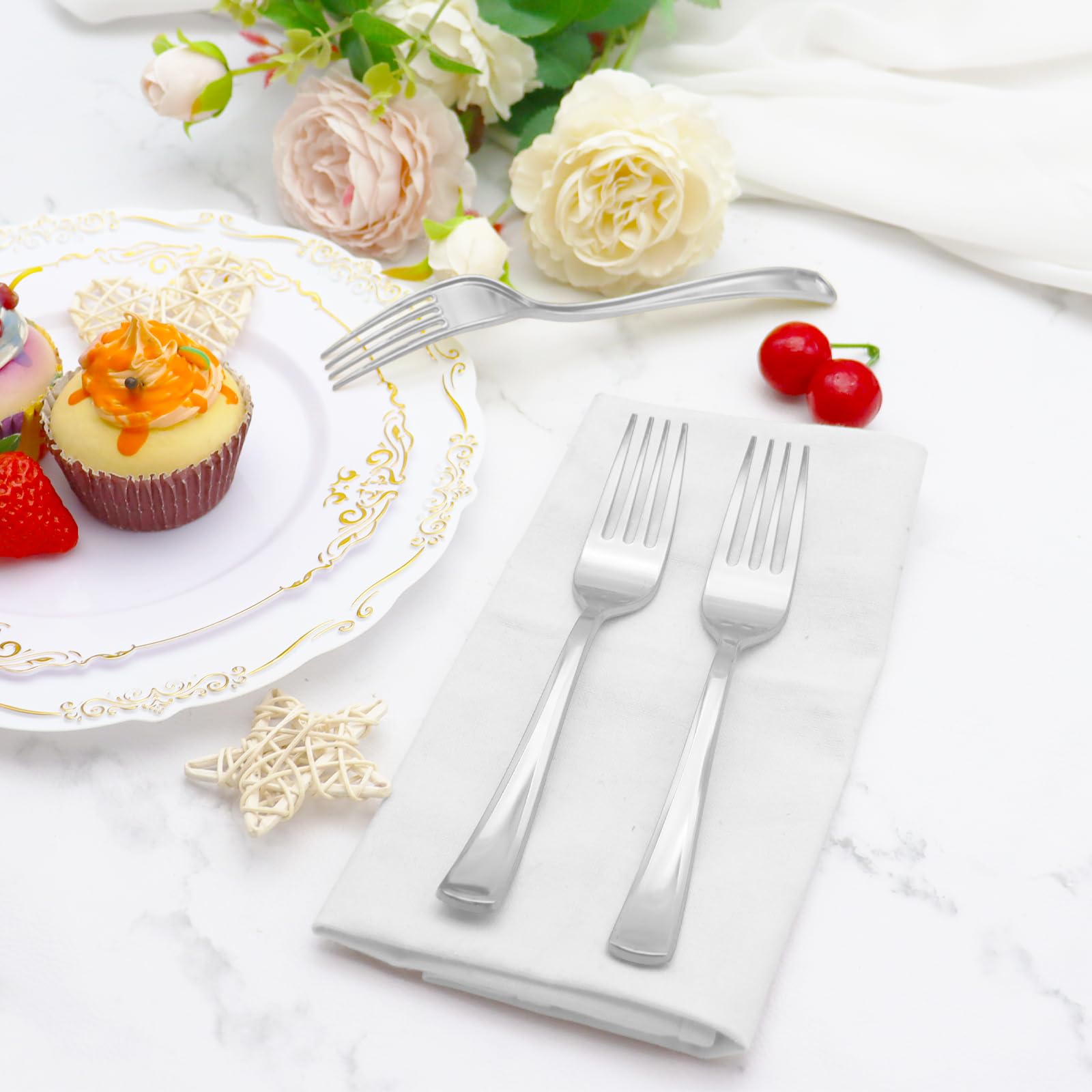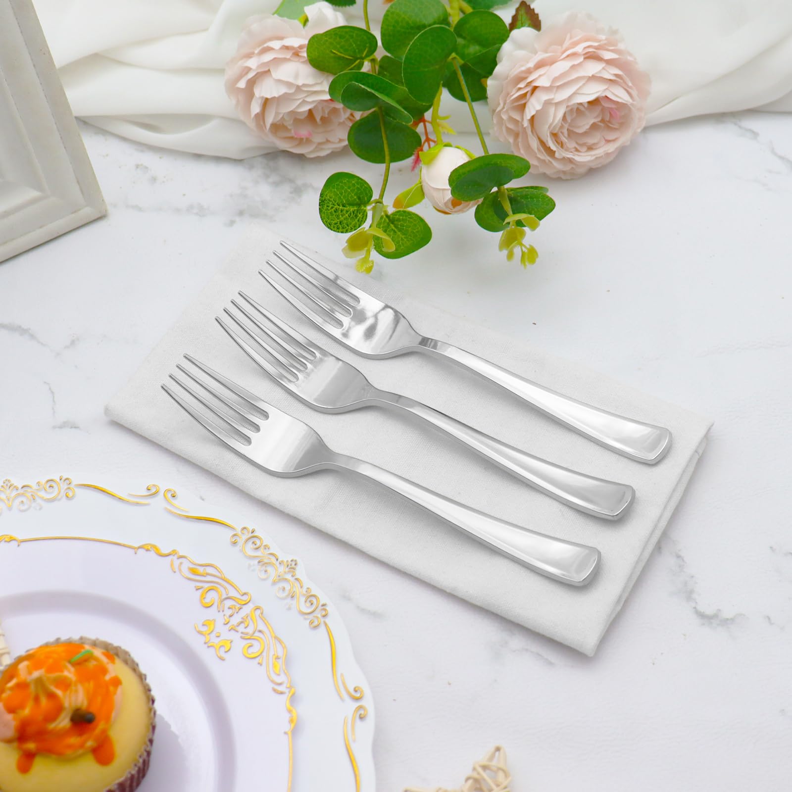 【Fashionable and Noble Design】:Our silver plastic forks are as shiny as real metal cutlery, not only sturdy, but also significantly lighter than metal cutlery. The shiny silver appearance gives the disposable silverware a noble and stylish atmosphere. They can add a sophisticated and unique visual effect to parties, banquets or other occasions.