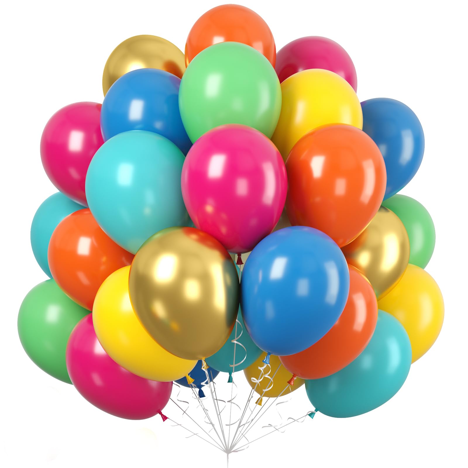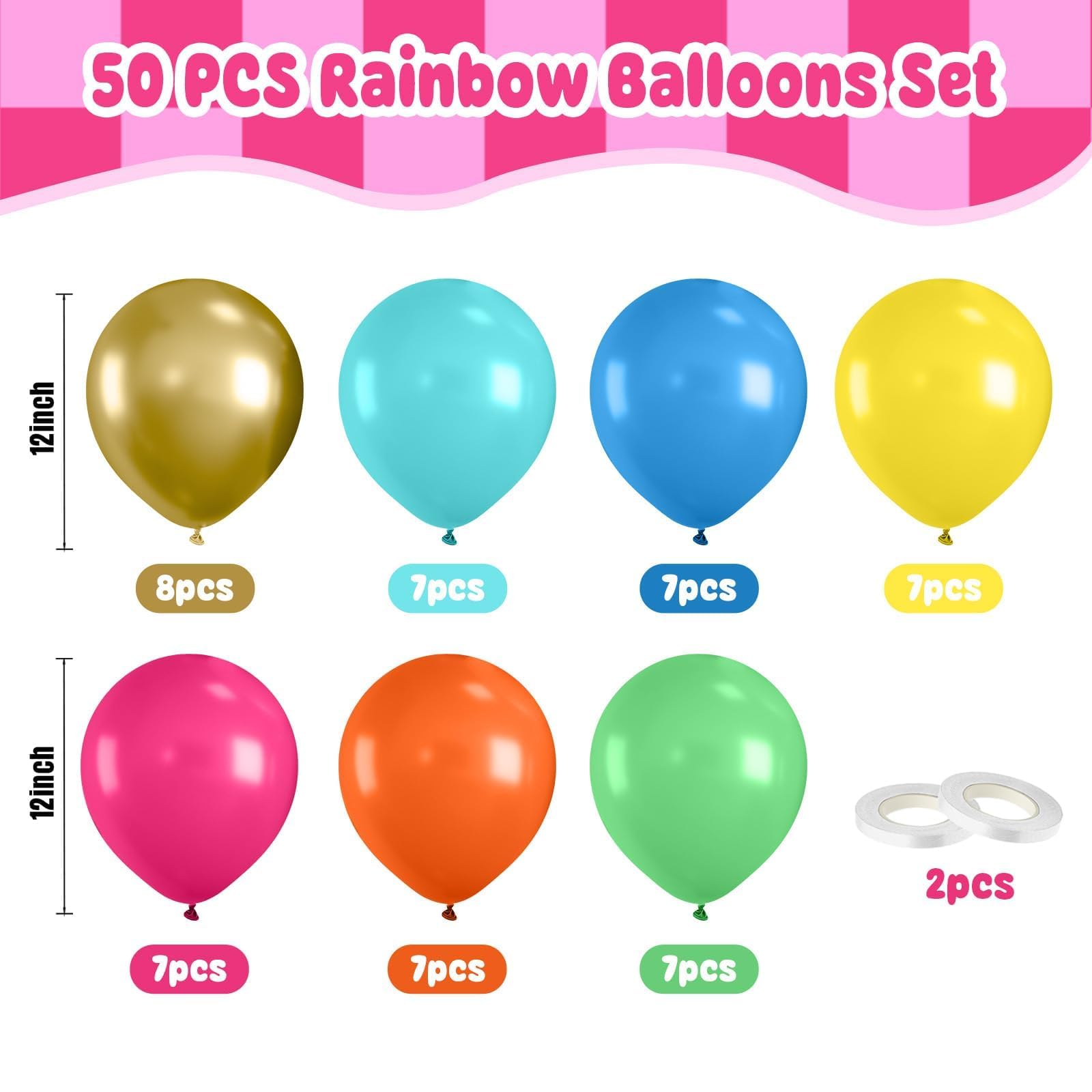 【WHAT YOU WILL GET】Our Rainbow Birthday Party Balloons include 50pcs latex balloons, designed to help you create stunning decoration: 8 x metallic gold balloons, 7 x teal blue balloons, 7 x dark blue balloons, 7 x yellow balloons, 7 x hot pink balloons, 7 x orange balloons, 7 x light green balloons, 2 x white ribbon. The size of the balloon is about 12 inches after inflation.tion.