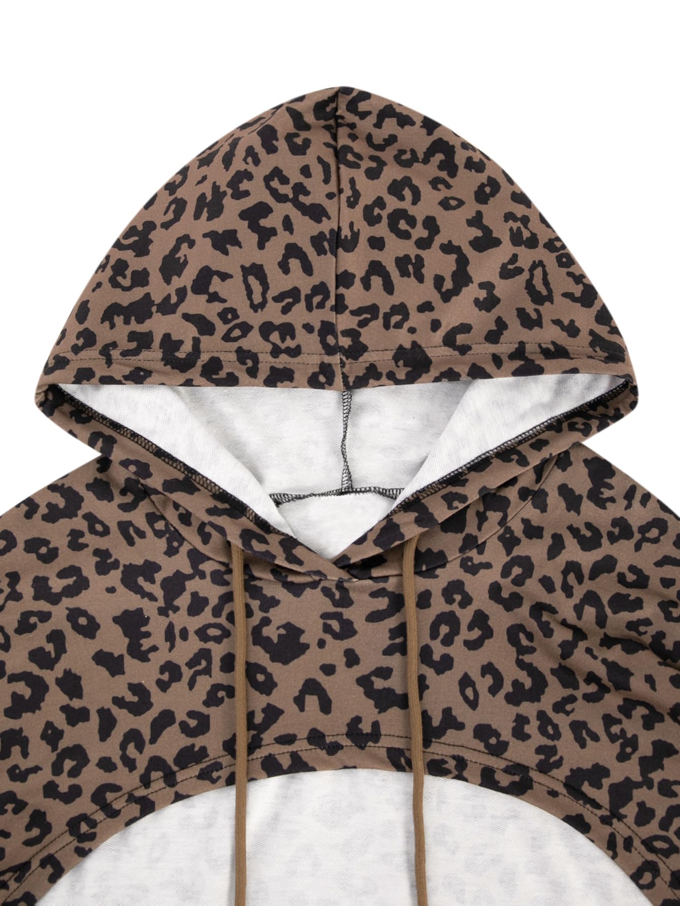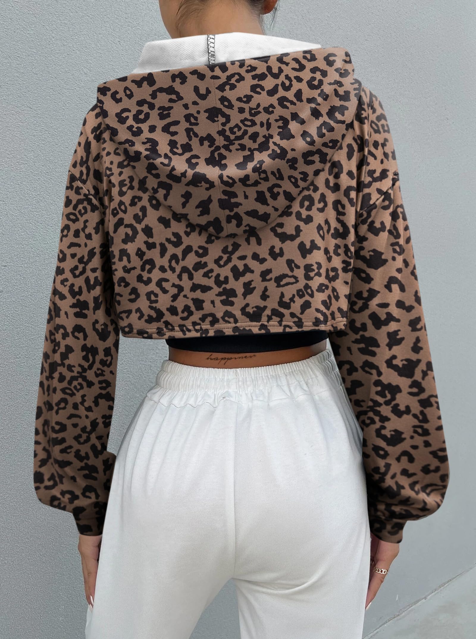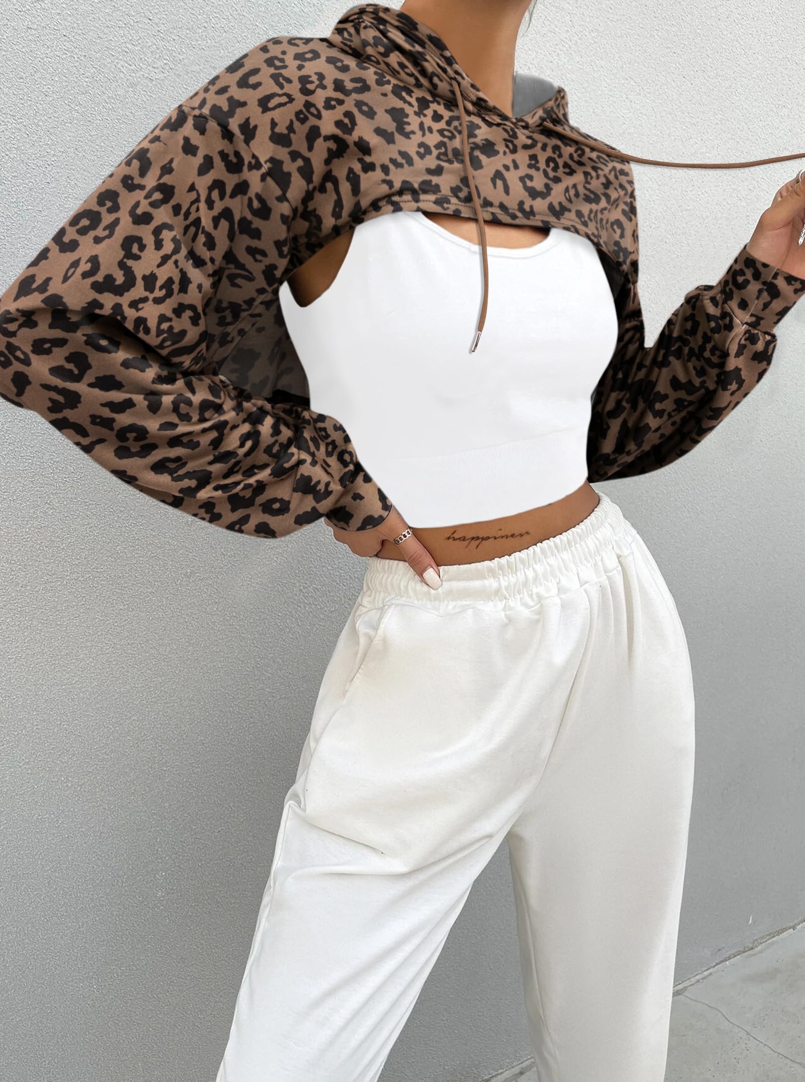 FEATURES: Cheetah print hoodie, long sleeves, cropped length, drop shoulder, loose fit, drawstring hooded, one piece pullover, workout crop tops for women