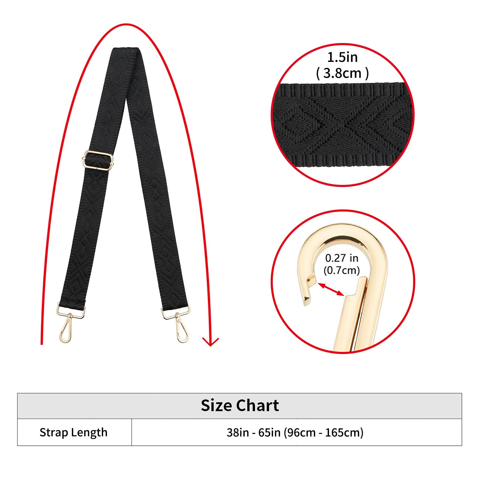 ★Adjustable - Adjustable length(including snap hooks): 38"~65"(96cm-165cm), it is long enough to wear on the shoulder or cross body, use it as a decorative accessories for your bag also a good choice.