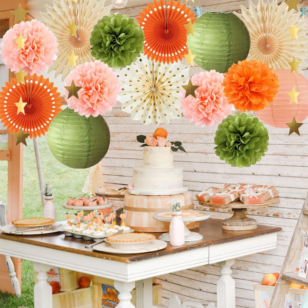 【Olive Green and Orange Decorations Kit】 5pcs orange and cream paper fans, 6pcs olive green orange and peach pom poms, 3pcs hanging peach and olive green paper lanterns, 1pc paper gold star garland