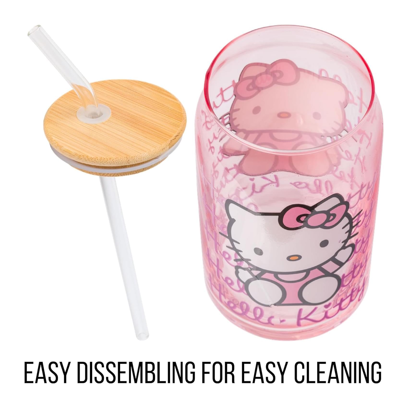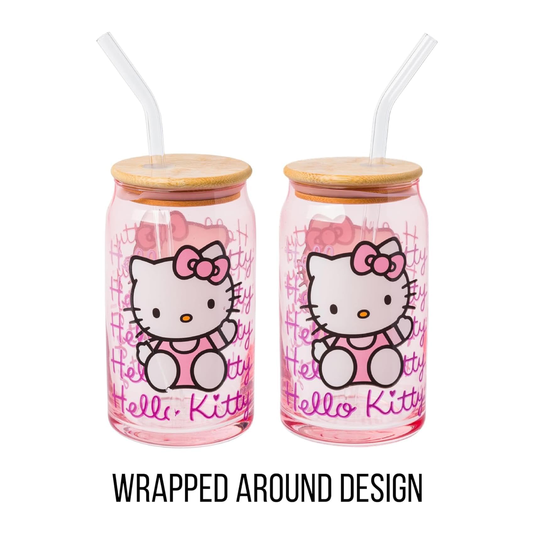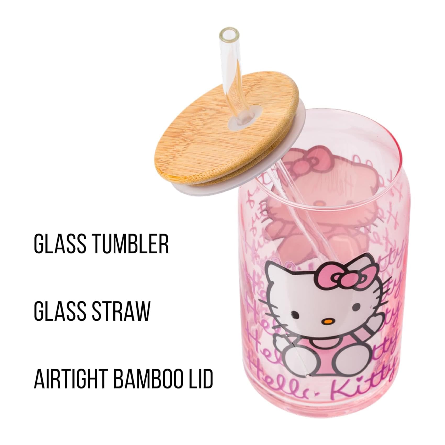 SANRIO HELLO KITTY TUMBLER: Stylish 16 oz pink glass tumbler with bamboo lid and reusable glass straw. Featuring a fun picture of beloved Hello Kitty