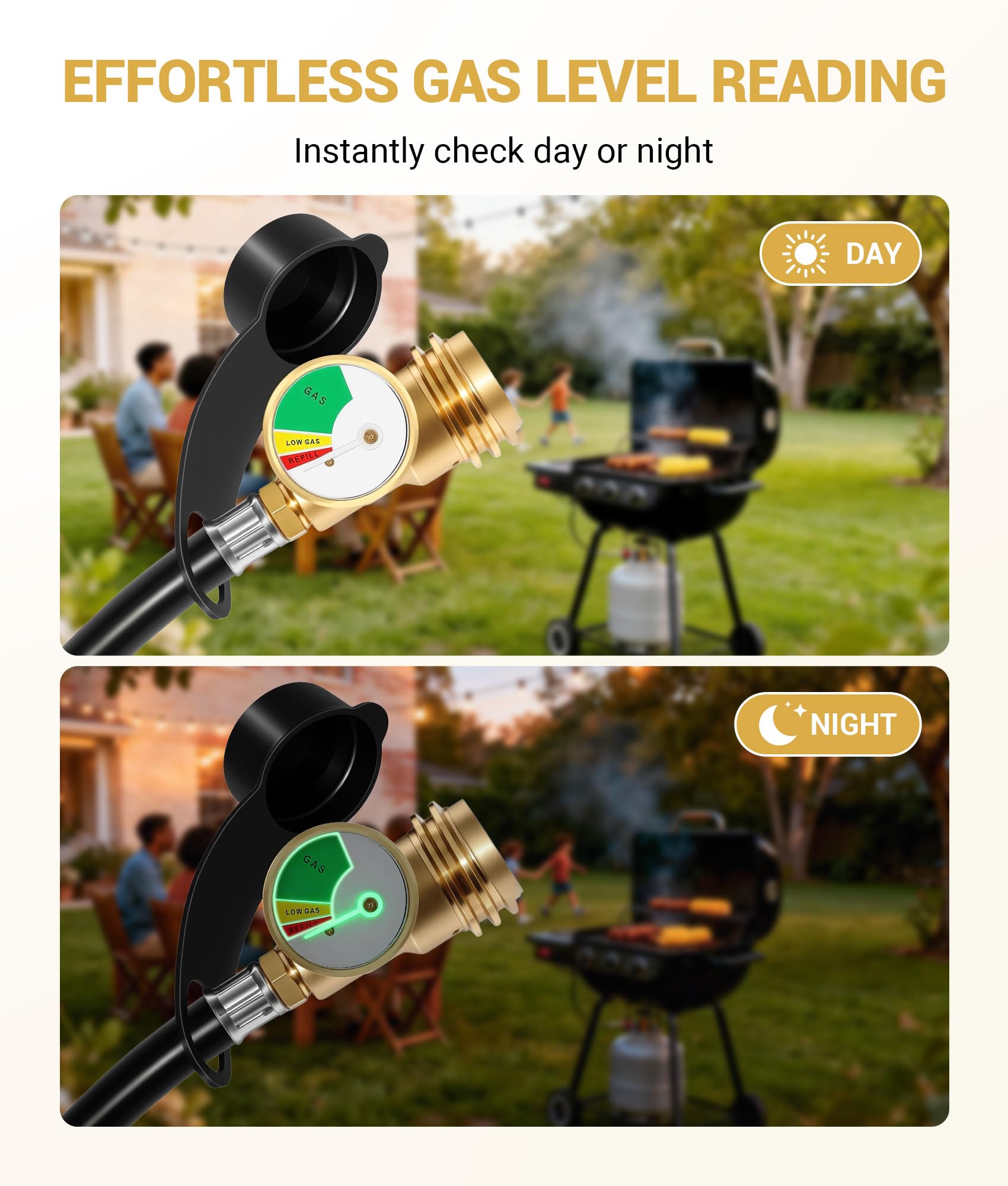 Gas Level Display: Equipped with propane tank pressure gauge. Bright color readouts make it easy to view gas levels. Green means there is enough gas, yellow means there is insufficient gas, and red means the gas is about to run out. Luminous hands can be seen clearly even in the dark
