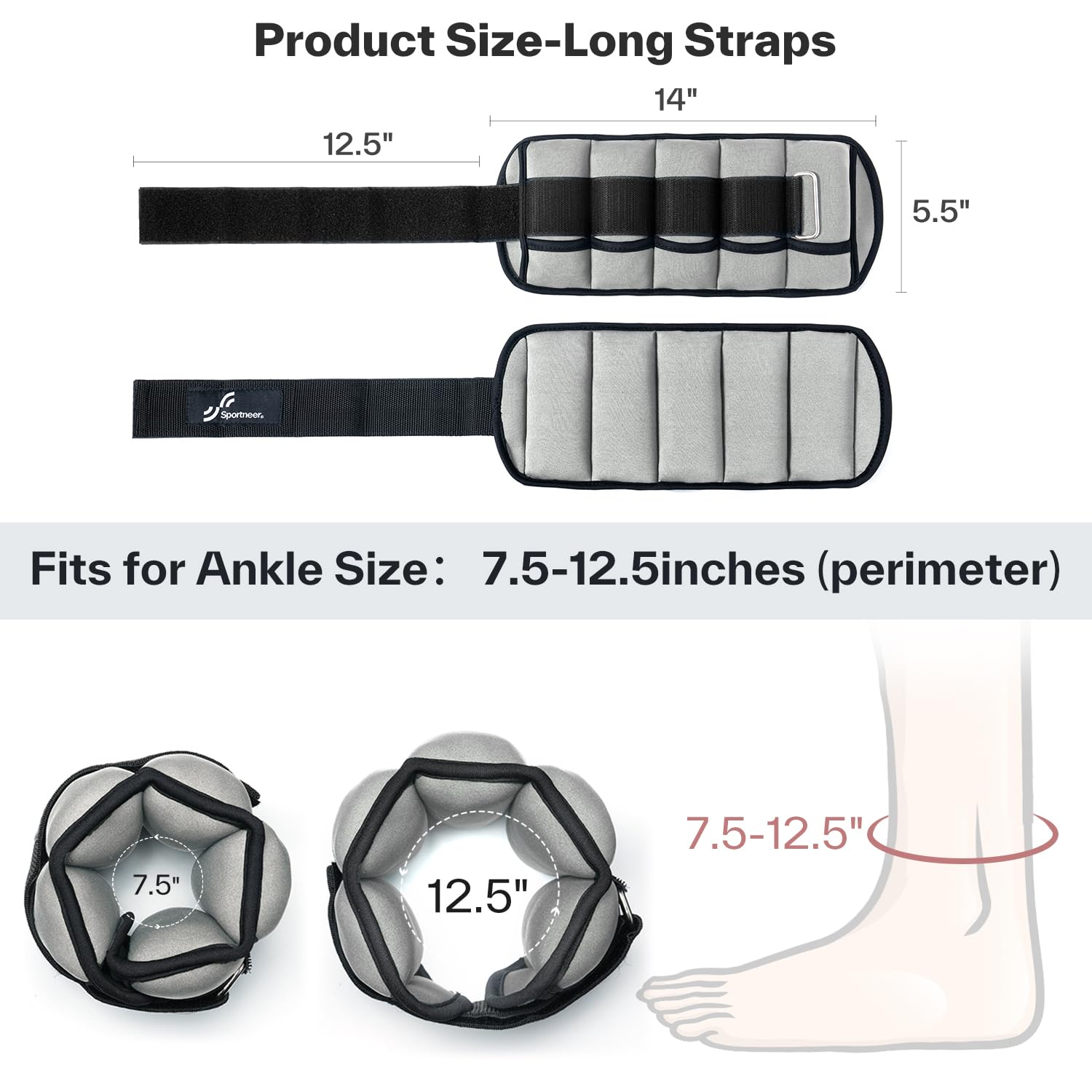 ONE SIZE FITS MOST ANKLES: The ankle weights feature long velcro straps(about 12.5inch), ensuring a comfortable and secure fit for size of ankle from 7.5 to 12.5 inches(perimeter)