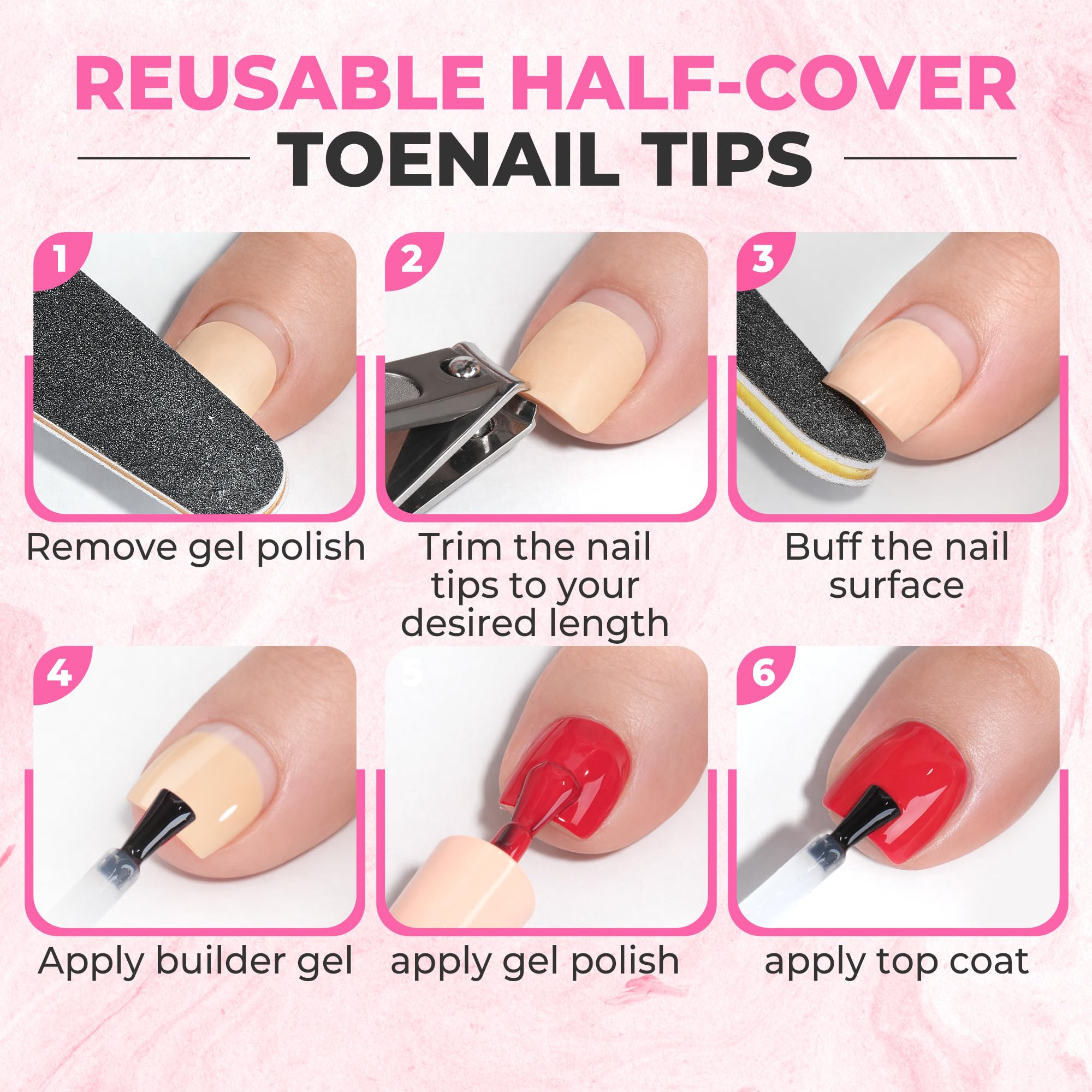 ❤ Easy Application for Salon-Quality Results: Achieve a professional pedicure look at home with these premium toe nail tips. These pre-shaped half cover toe nail tips eliminate the need for complex sculpting—simply select the correct size, apply with gel or glue, and cure. The soft gel structure of these toe nail tips soaks off easily with acetone, protecting your natural nails from damage. Perfect for creating trendy summer looks, these versatile gel toe nail tips allow you to confidently wear open-toe heels, flip-flops, and sandals.