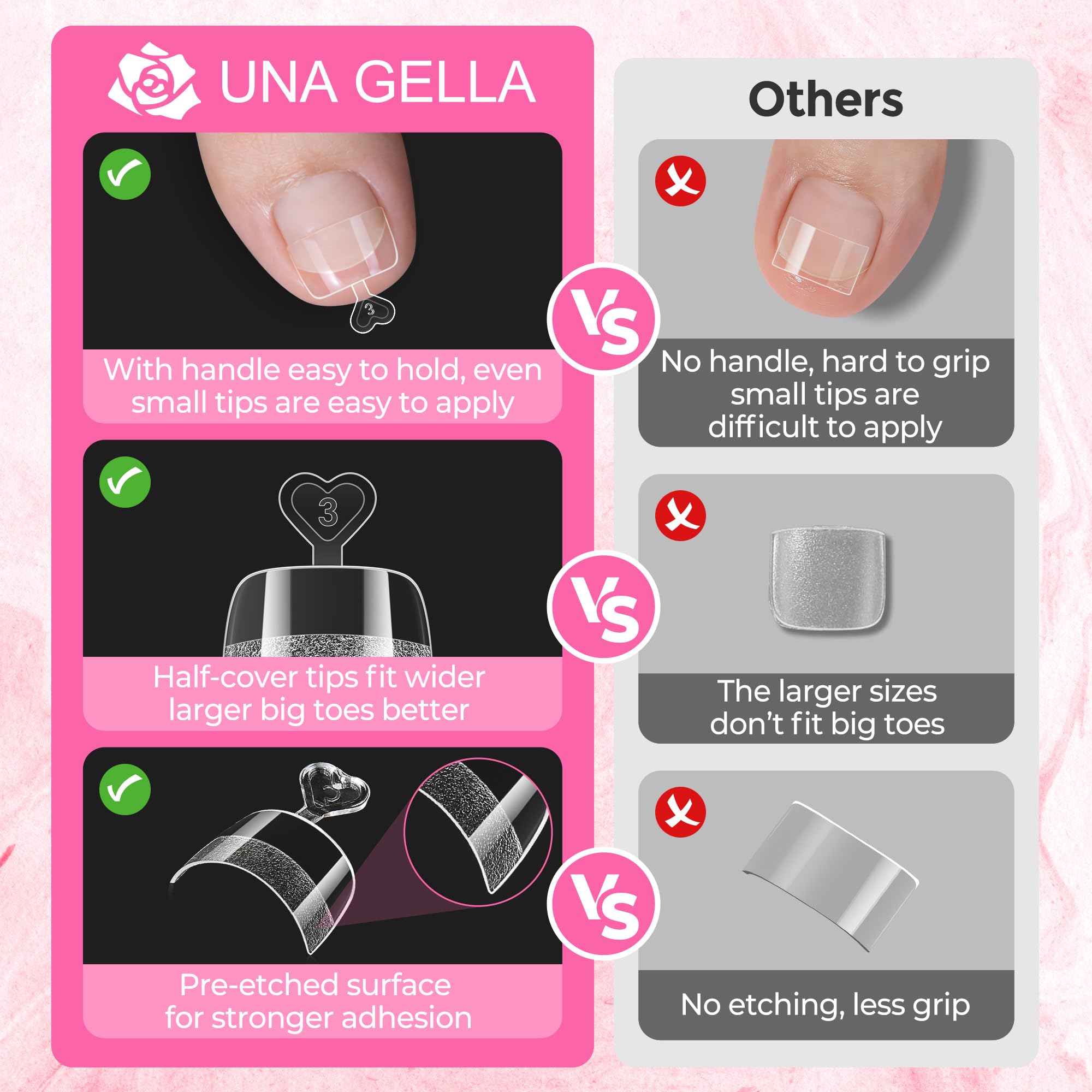 ❤ Designed for Comfort & Longevity: Our toe nail tips feature a medium square round shape that complements the natural toe line for a chic, clean look. These gel toe nail tips are odorless. For optimal results, pair these half cover toe nail tips with UNA GELLA nail glue or gel to achieve a wear time of up to 4 weeks. Whether you are doing a quick color change or a full acrylic extension, this 504-piece set of toe nail tips provides the versatility and durability needed for stunning, long-lasting results.