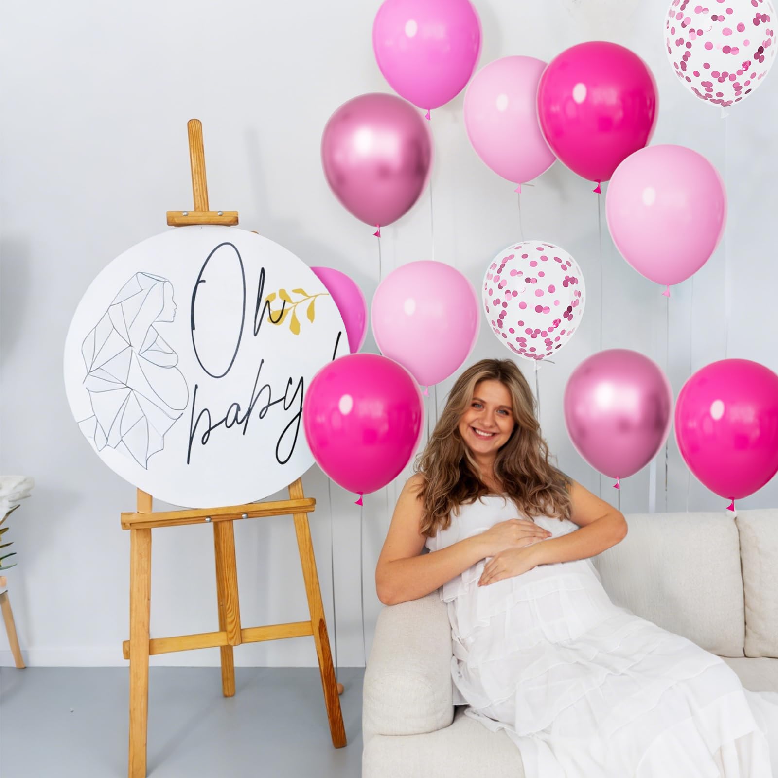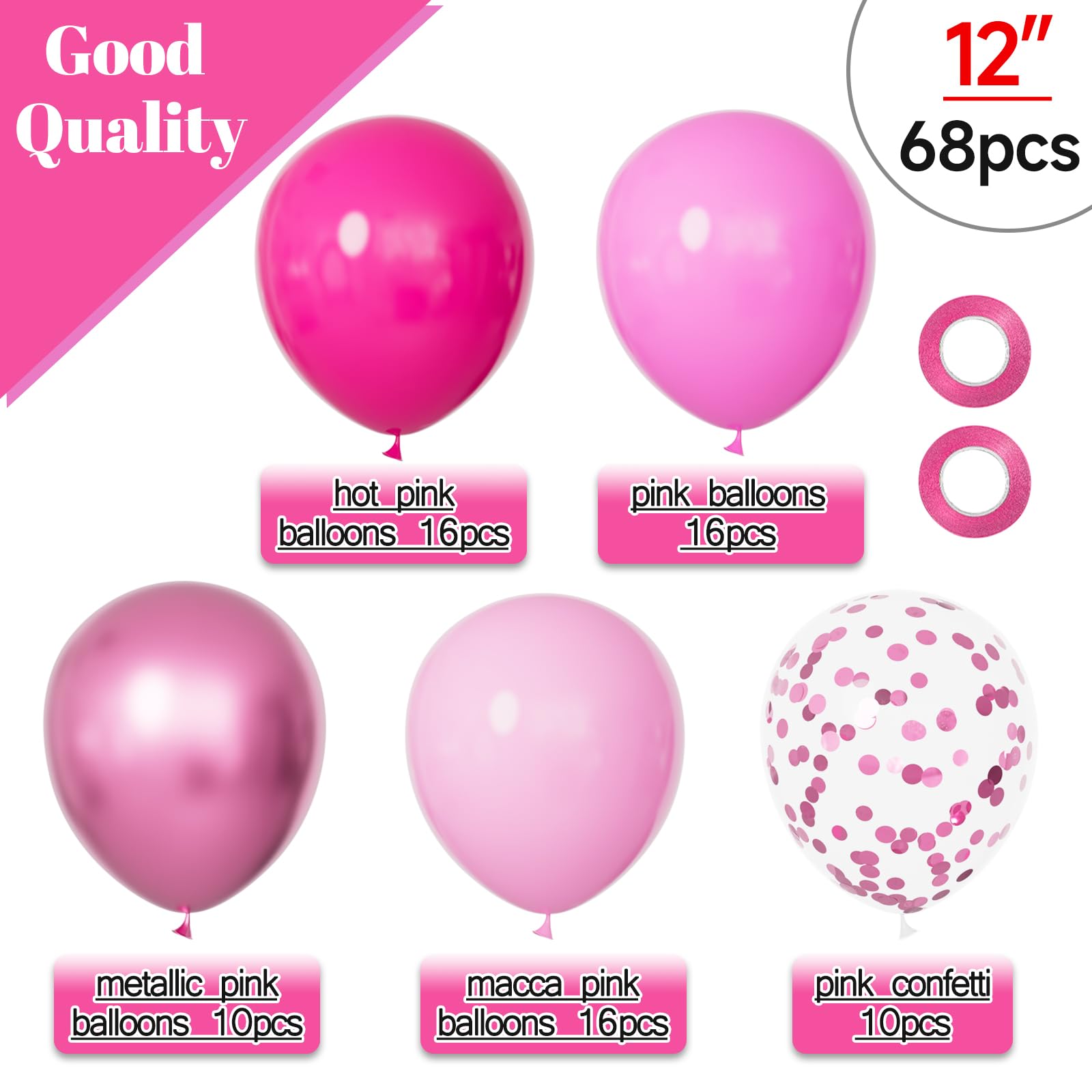 【Pink Balloons Packing】 This balloon kit includes 16pcs hot pink balloons, 16pcs light pink balloons, 16pcs dark pink balloons, 10 pcs metallic pink balloons and 10pcs pink confetti balloons, 2 rolls ribbons. All the balloon size is about 12 inches after inflation.