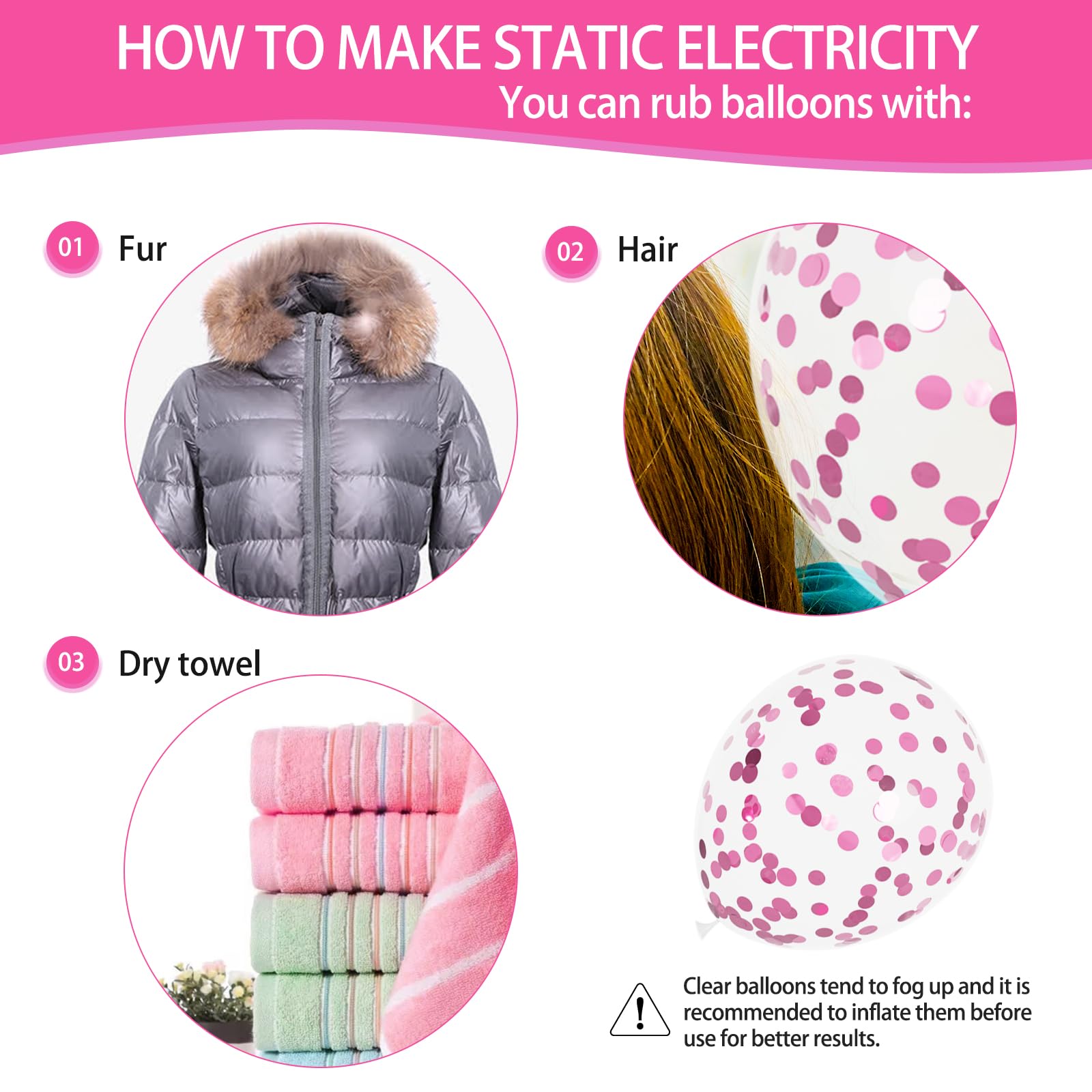 【Easy To Use】Pink latex balloons and confetti balloons can be filled with air, helium and even water. Please do not over inflate the balloons to avoid bursting. If you have any questions about our balloon set, please contact us at once .