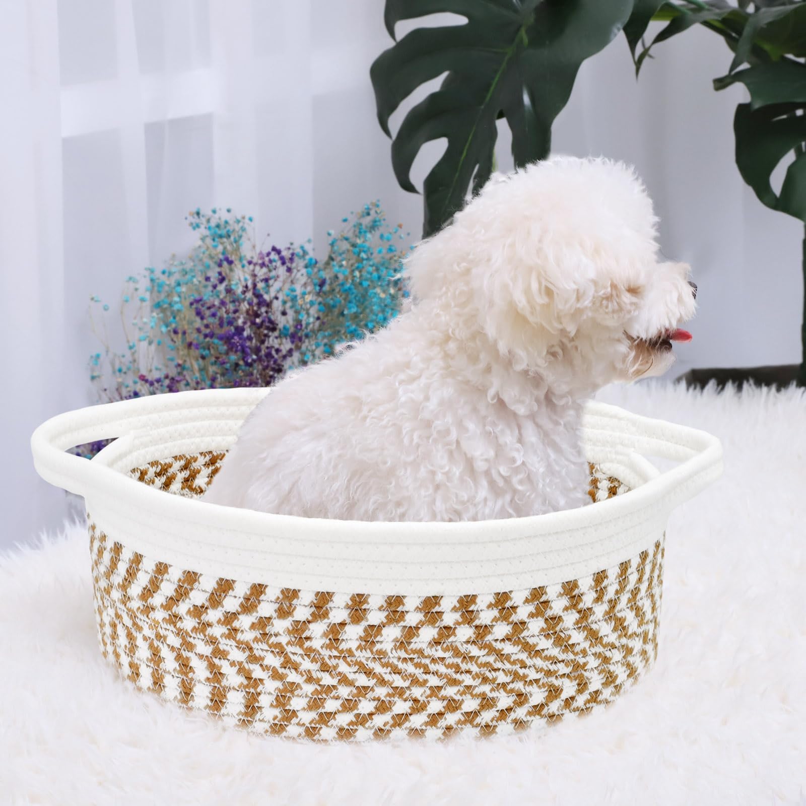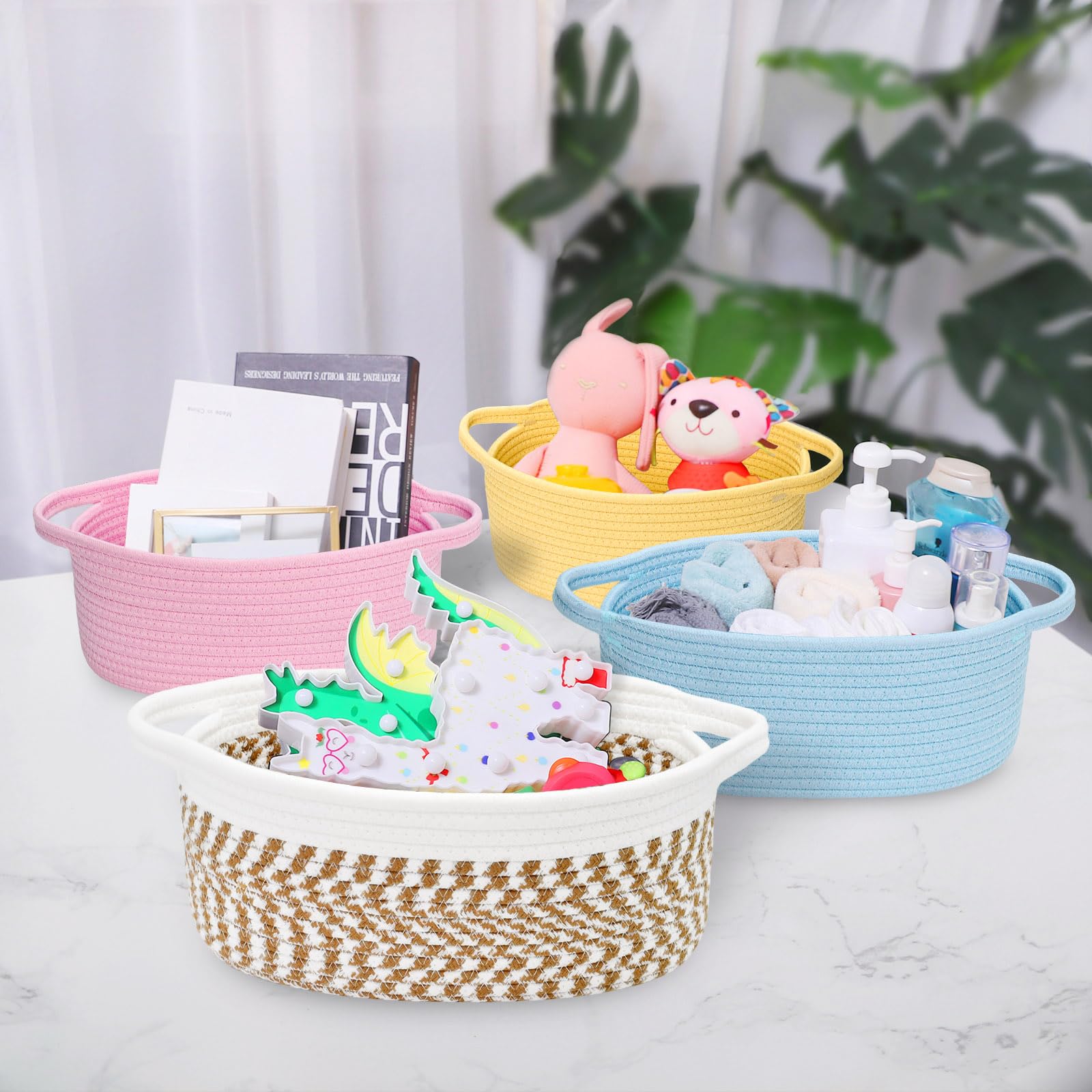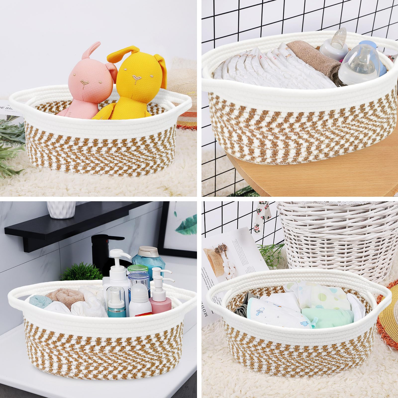 Small baskets for organizing, keep spa essential, fruits, remote control, towel, diaper, blanket, toy, nursery necessaries, make-ups organized in order. Even can be used as dog cat basket