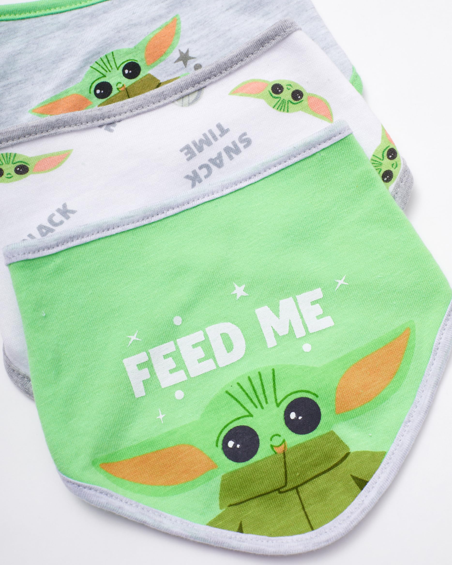 This Baby Yoda bandana bib multipack features a green bib with a "Feed Me" Grogu print, a grey bib with a "Snack Time" Baby Yoda print, and an allover Baby Yoda print on the white bib