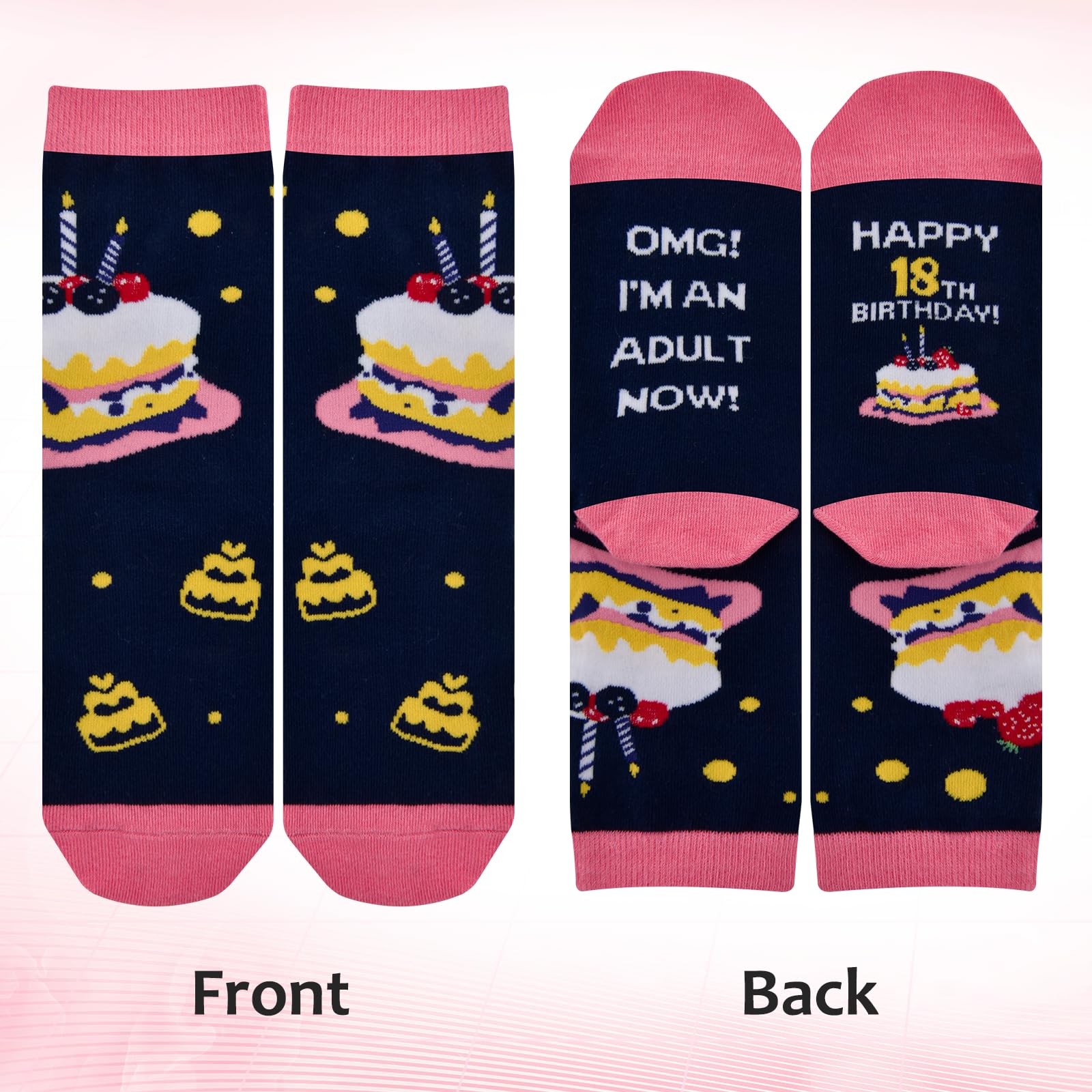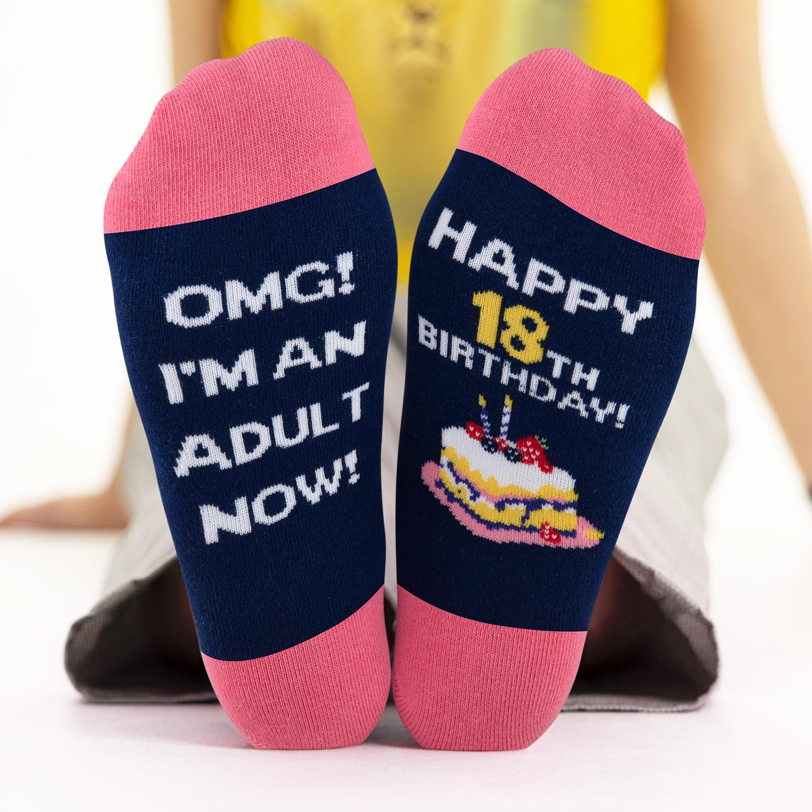 【Happy 18th Birthday Cake Topper】These cool 18th birthday gifts socks feature cute cake and candle designs, while the bottom is sewn with a hilarious hidden message: "OMG! I'm An Adult Now! Happy 18th Birthday!". The birthday socks are best gifts for 18 year old girls.