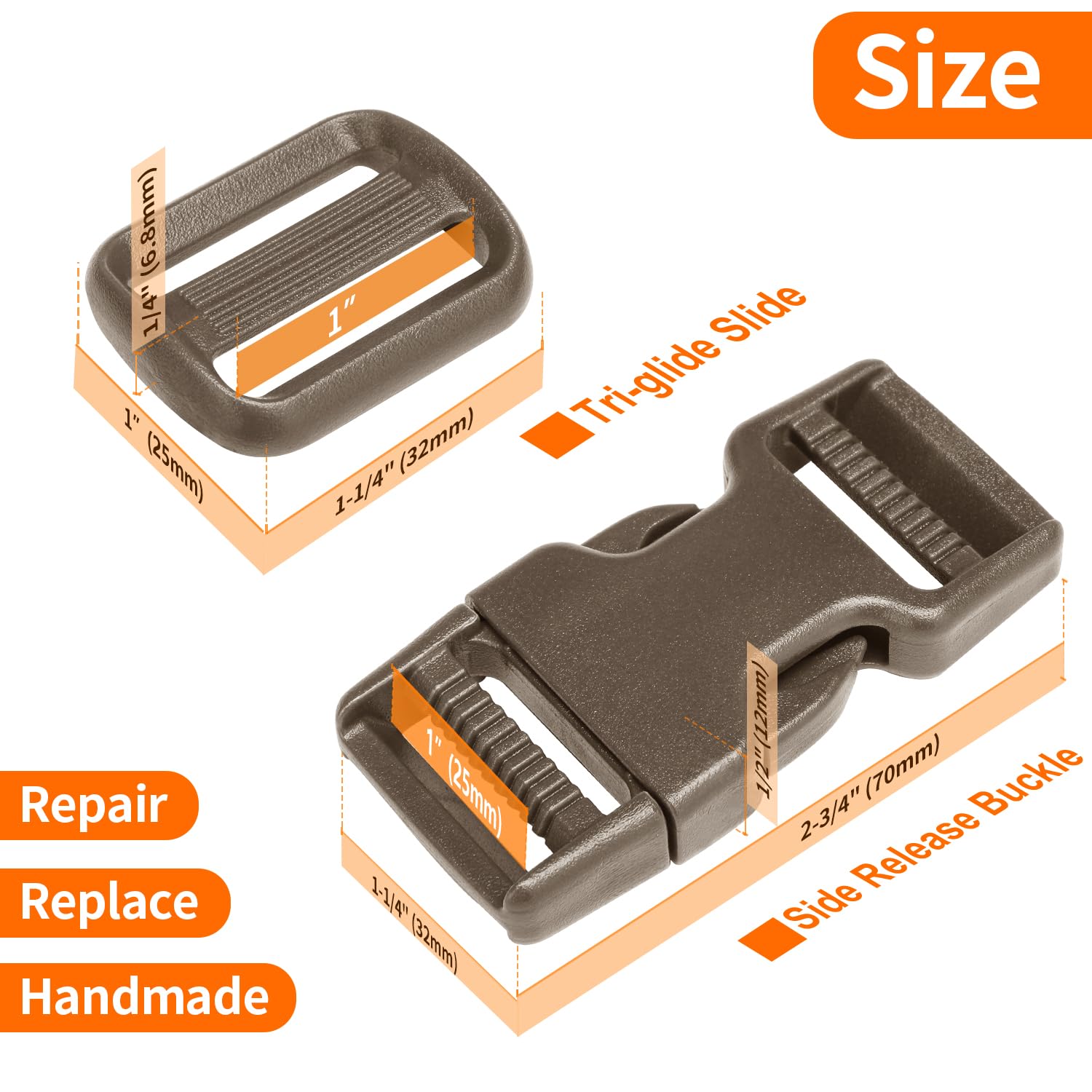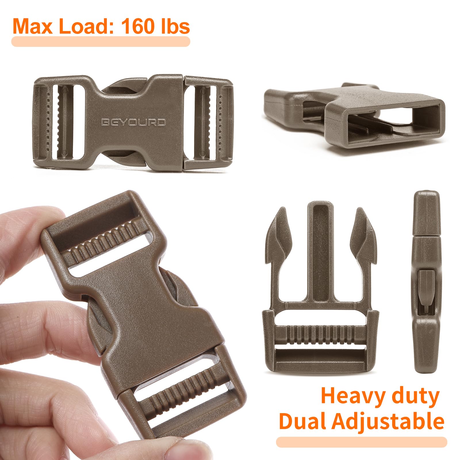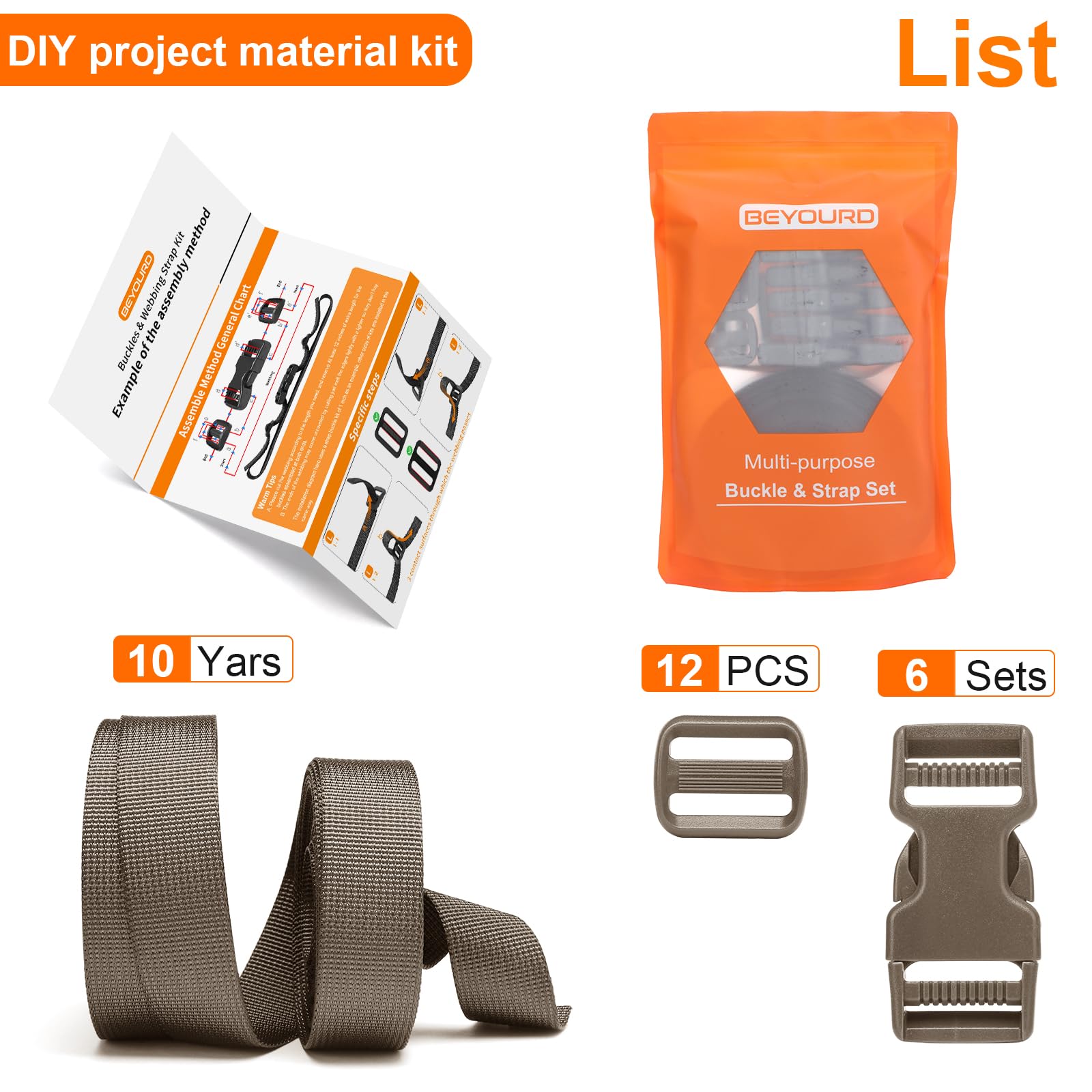 Package Contents: The BEYOURD package includes 10 yards of webbing strap, 6 parachute buckles, and 12 tri-glide side clips. These versatile components are ideal for a wide range of DIY projects
