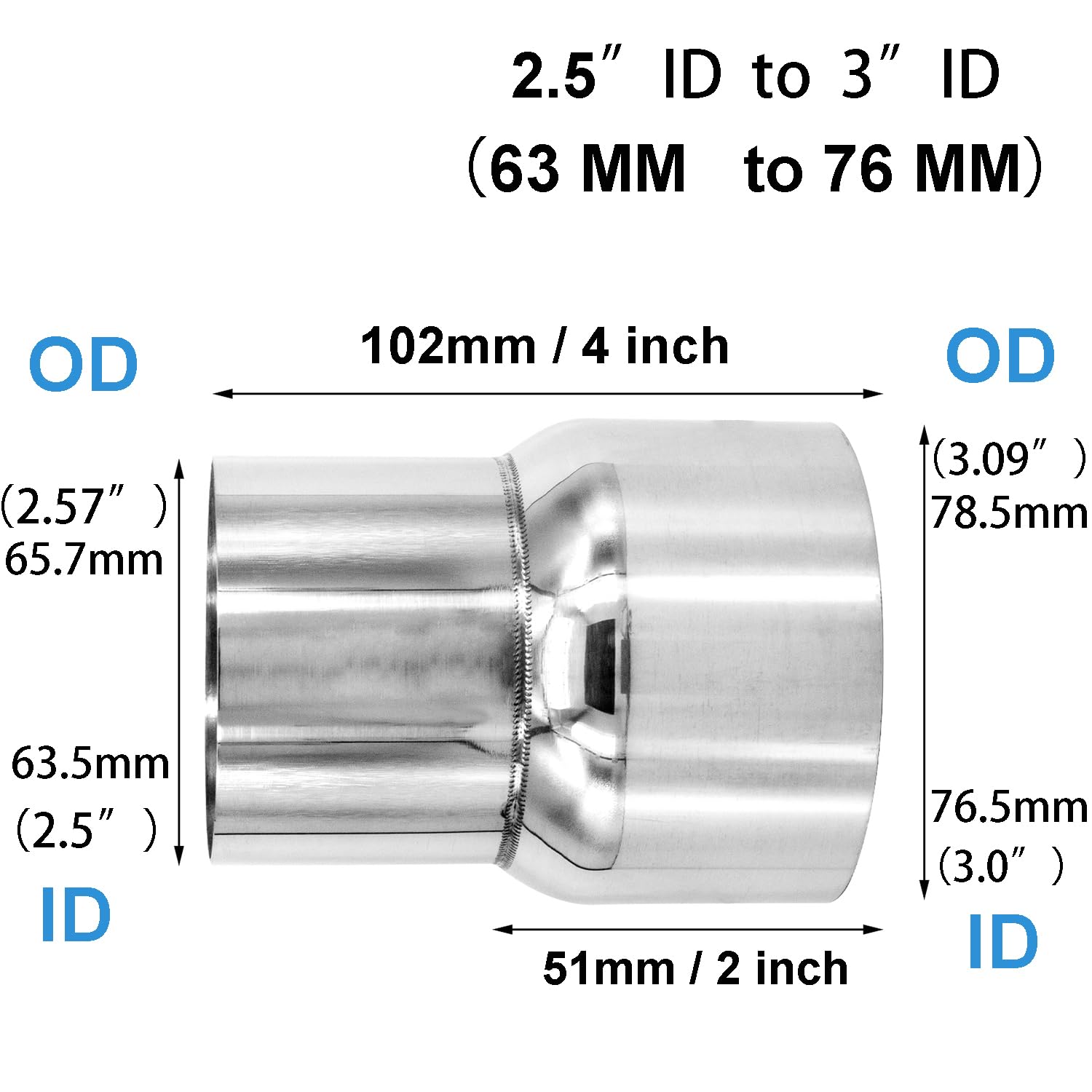 【Quality & Size】:Our exhaust adapter made of high quality 304 stainless steel, welds to two concentric pipes of different diameters can form a tight seal against leaks.The length of 2.5 to 3 inch exhaust adapter is approx.102mm