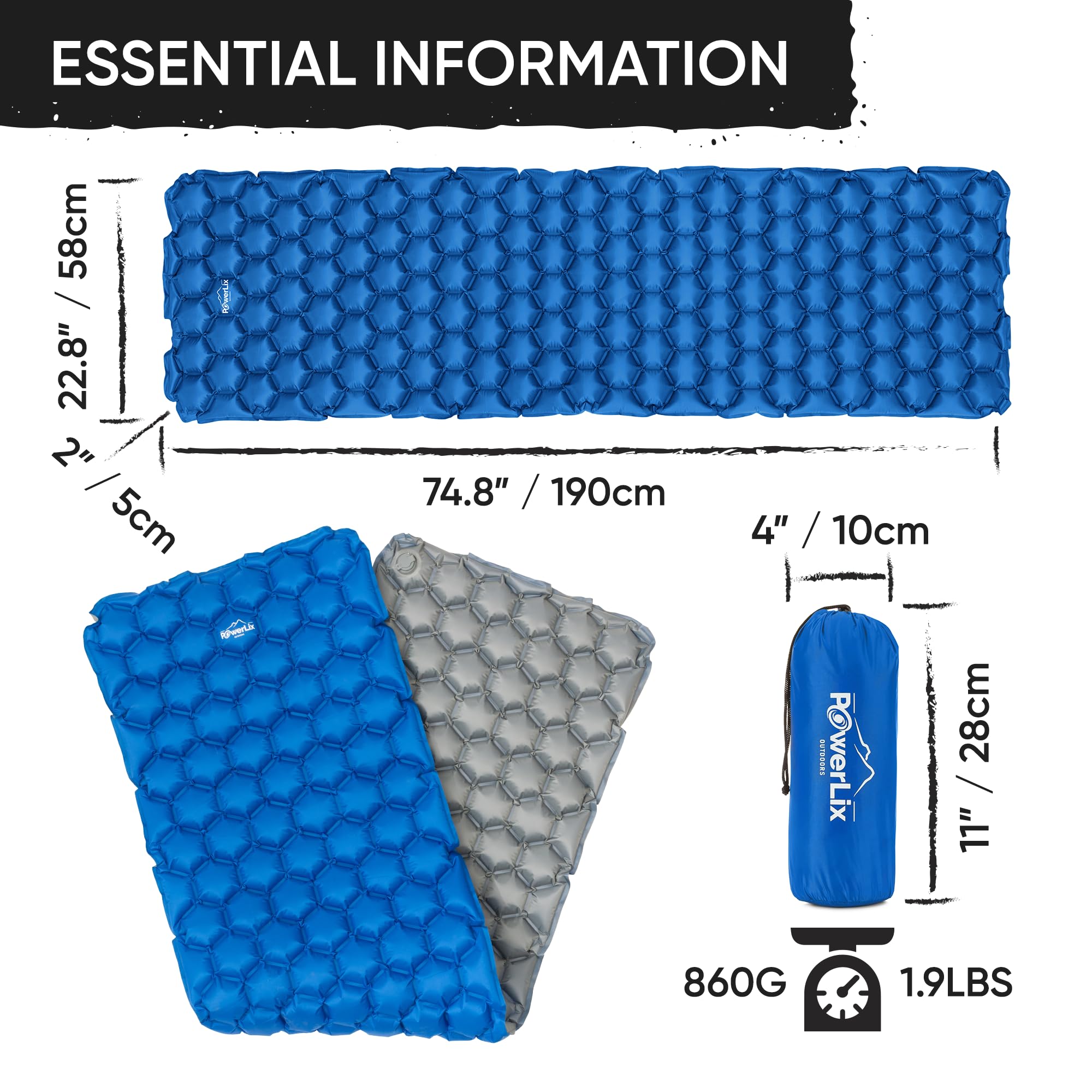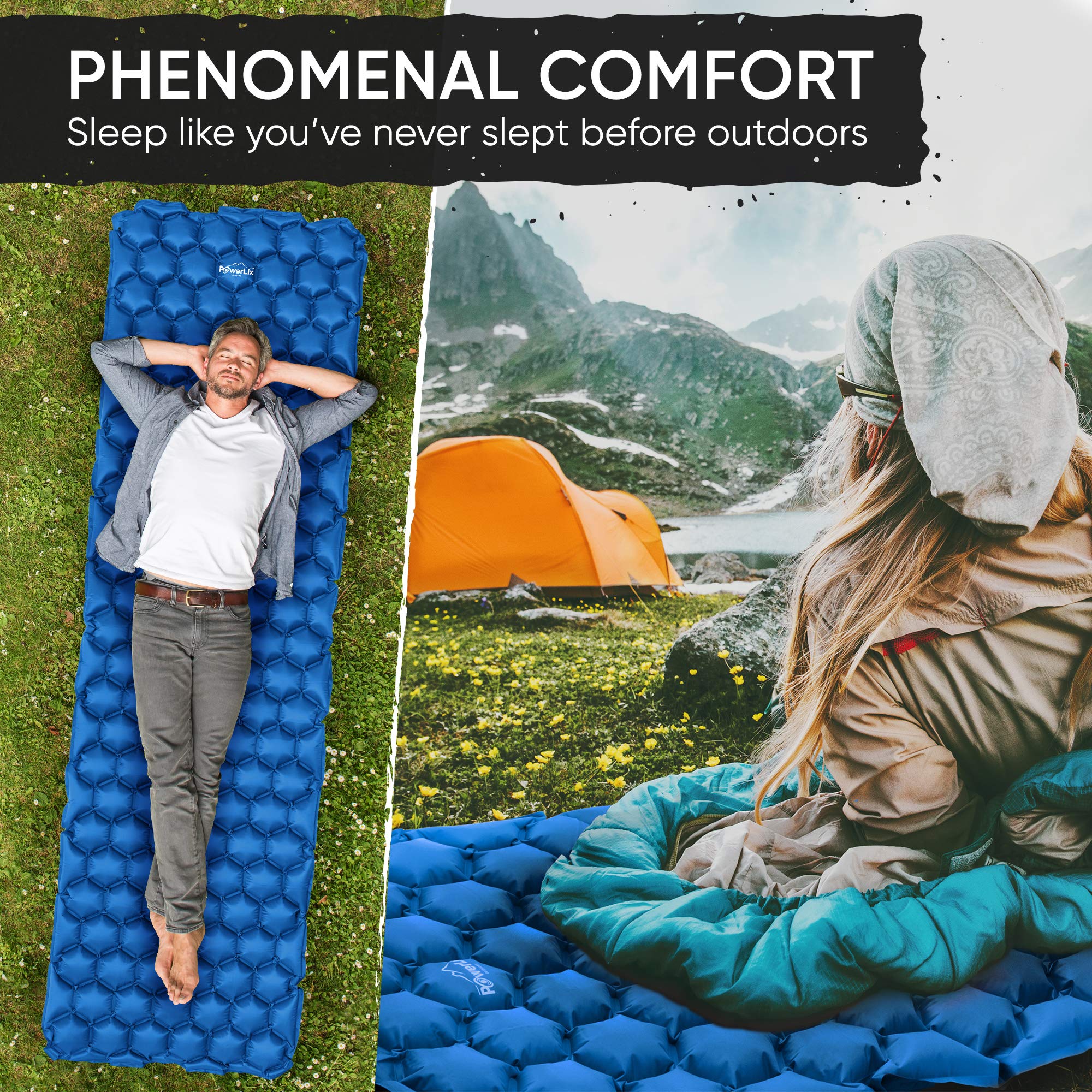 REJUVENATE YOUR BODY: Powerlix camping pad has revolutionary hexagon design made with body mapping technology. The hexagon air cells ergonomically support all of your pressure points, giving you superior support and comfort all night long, no matter how you sleep! The sleeping mat is also a camping gear must haves luxury, being comfortable yet lightweight. It rolls up small, making it effortless to carry around. The cot comes in a variety of color choices, sure to match anyone's personality.
