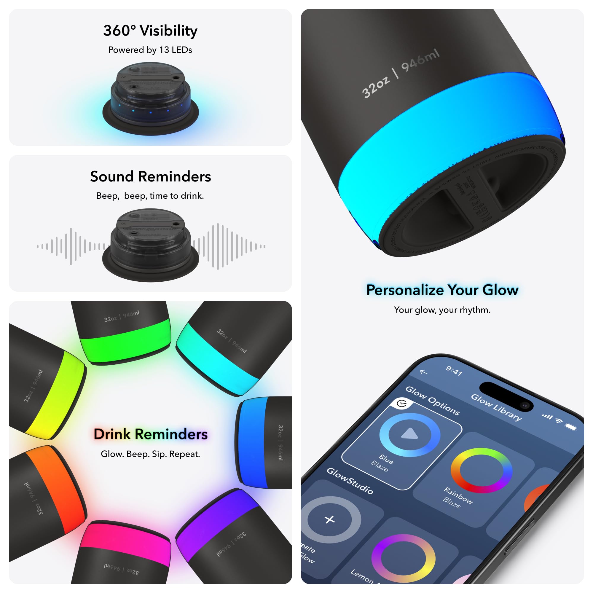 SMART DRINK REMINDERS (GLOW & SOUND) – Stay hydrated with customizable 360° glow alerts and optional sound reminders when it’s time to drink. Personalize glow color, pattern, and timing—plus sound type, frequency, and volume.