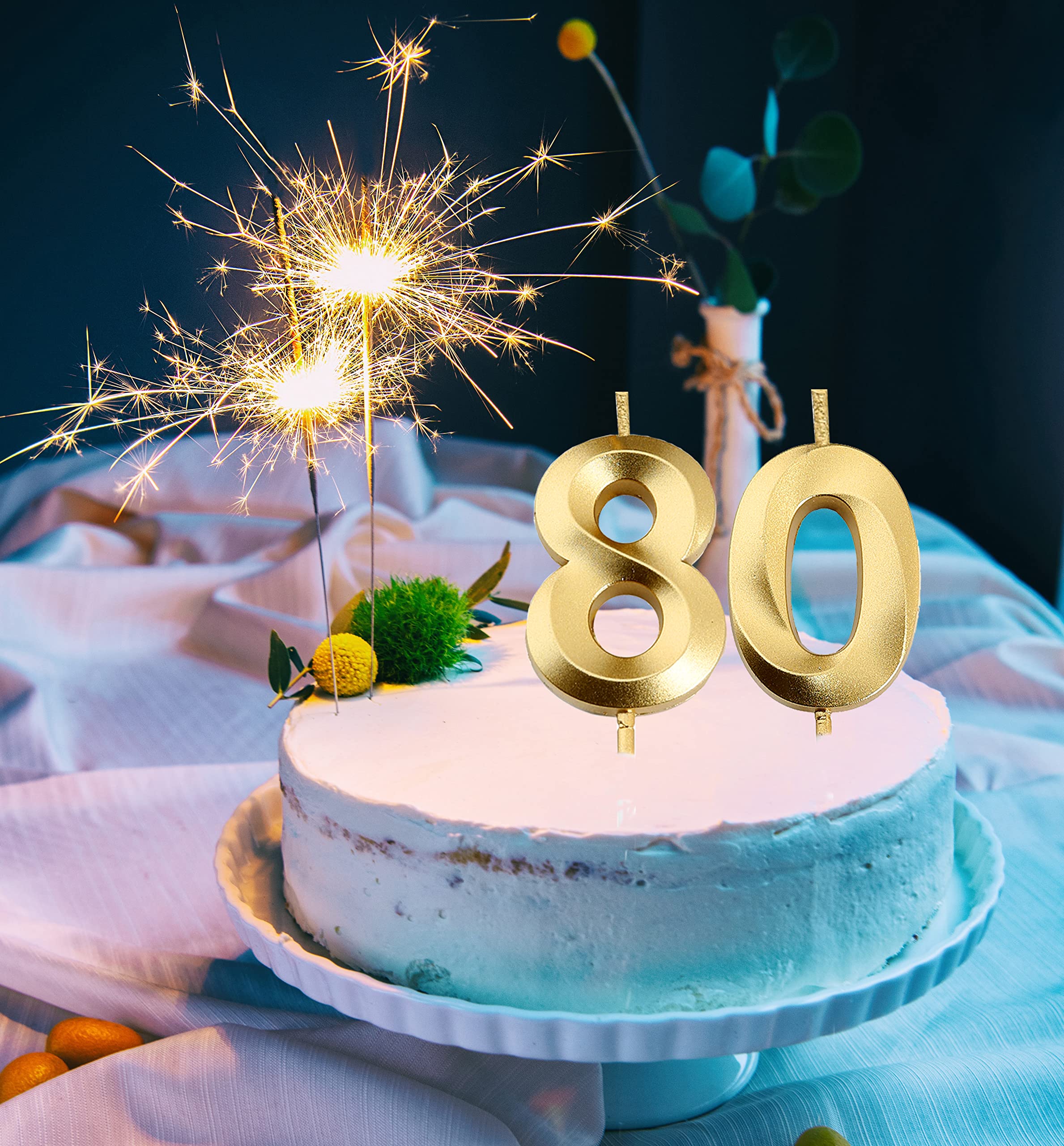 INSTRUCTIONS: Size: Width:1.3 in. Number height: 1.9 in. Total height: 4.8in Color : Glitter Gold Material : quality wax ,smokeless and non-toxic Burning Time :approx 4-5 minutes Package included:2 Pcs ,Gold Number 80 birthday candles PLEASE NOTE: Please keep the candles in shade away from the fire and make sure the size match to your birthday cakes