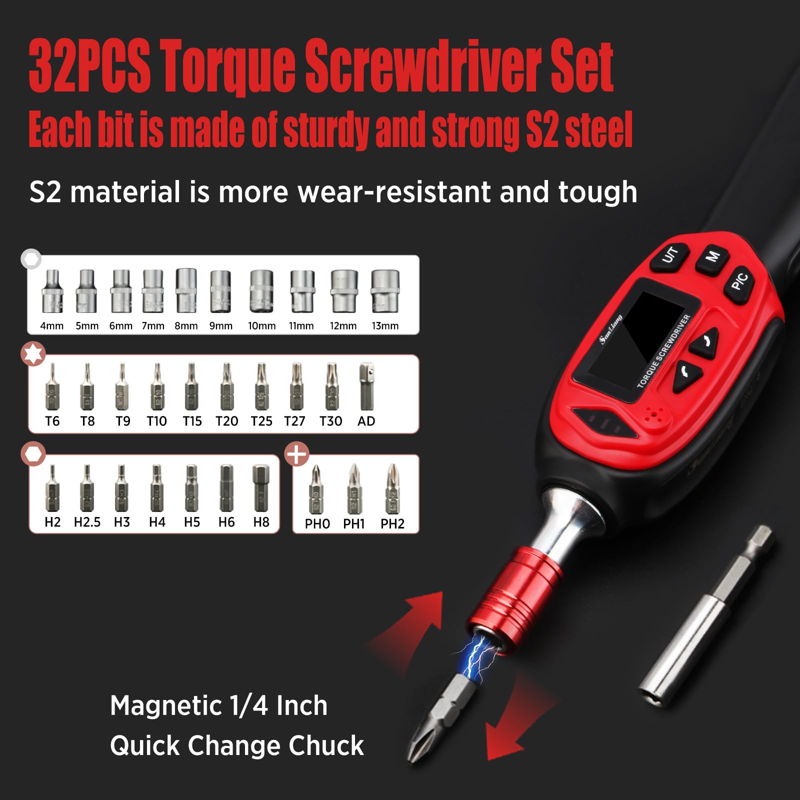 【Compact Set & Stores 999 Sets of Values】This is a compact set of 32-piece precision 1/4" digital torque screwdriver set, including the high-precision torque screwdriver, 19 sturdy and durable S2 screwdriver bits , 1 socket adapter, 10 drive sockets made of chrome vanadium steel and 1 extension bar. Torque value data can be recorded after each use in peak mode, and up to 999 sets of data can be stored.