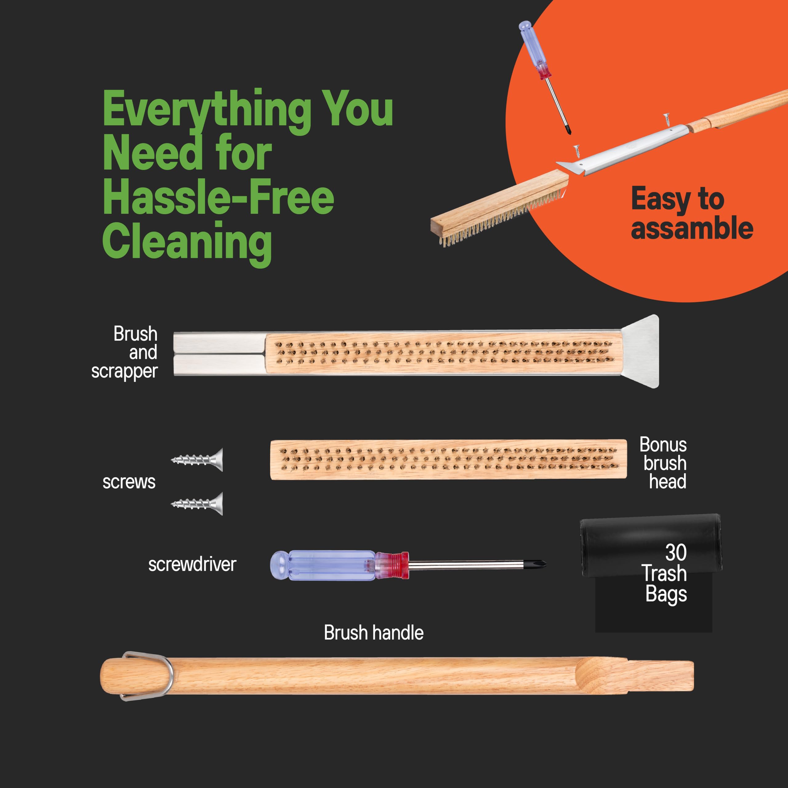 Easy Assembly: The Brush Handle and the Brush and Scraper come together in seconds we included a screwdriver and nails to get your new Pizza Cleaning Brush and Scraper up in seconds. Simply screw together the Brush handle and Scraper head and you’re ready to get your oven spotless in minutes.