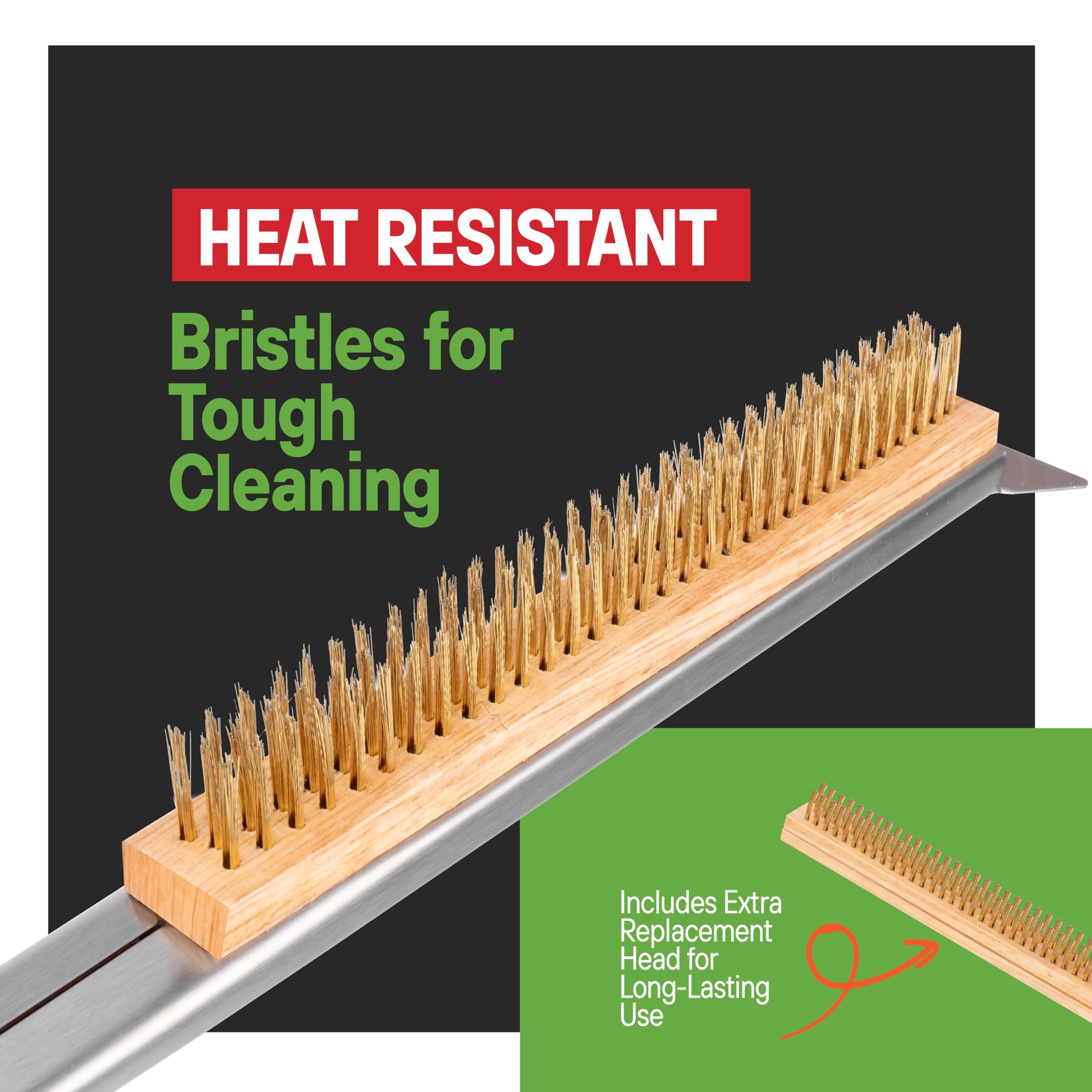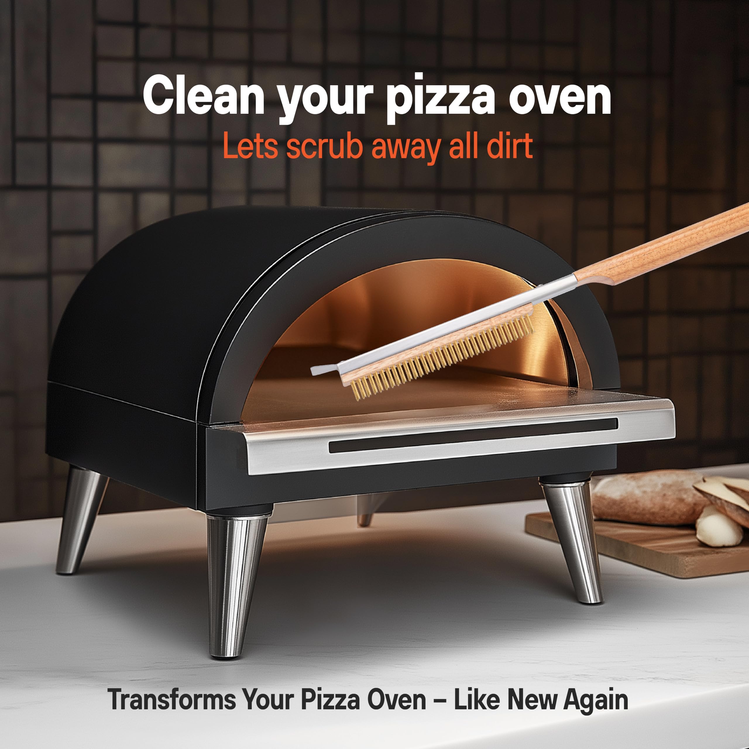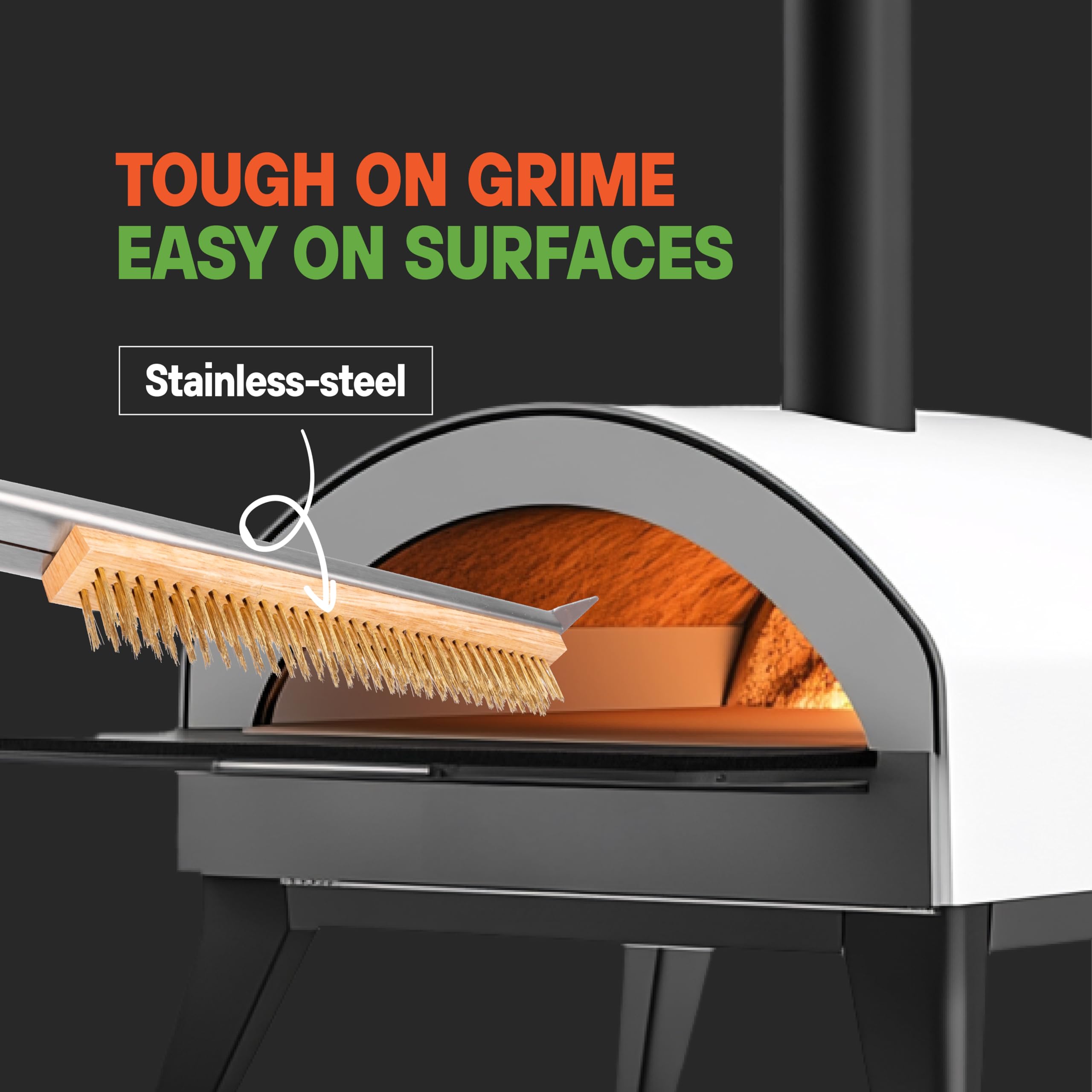 Tough On Grime: Tired of all the scrubbing and Scraping after every Pie? We also are! With its Stainless-Steel Bristles and tough-on-grime Pizza Oven Scraper you'll have all the all the dirt and grime off in minutes. Its 2-in-1 design was created to speed up both the brushing and scraping at the same time, so you can clean quickly and efficiently and get to baking your next Pie.