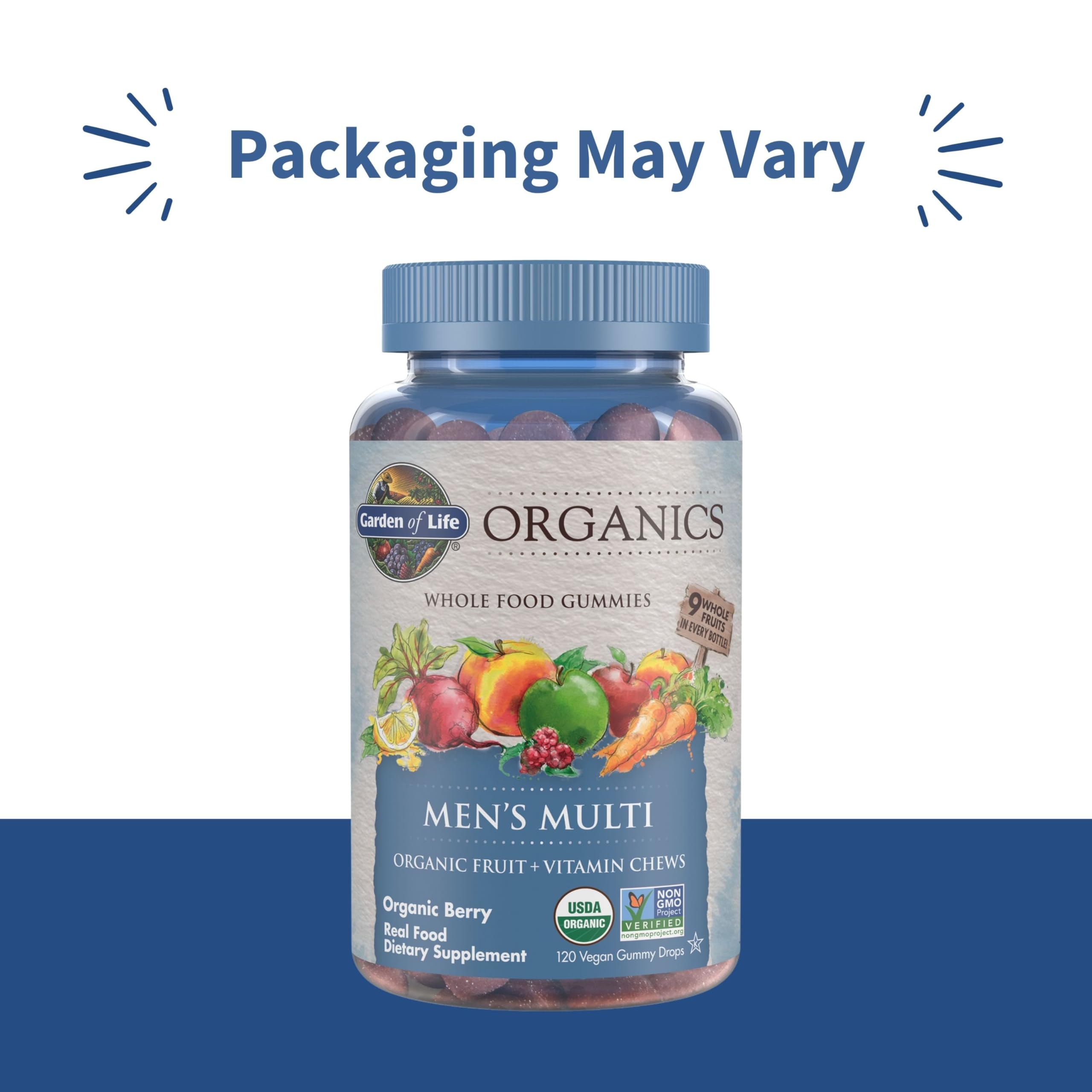Designed for men seeking comprehensive support, Garden of Life Organics Men's Gummy Vitamins is a multivitamin gummy made with 9 organic whole fruits in every bottle, plus targeted ingredients to support men's health: Methylated B12, vitamin C, 800IU vegan D3, vitamin E, and folate per 4 gummies. This gummy multivitamin formula delivers whole food-based nutrients with no artificial colors or preservatives, supporting men's overall wellness.* Each delicious gummy features an organic berry flavor made with pectin from organic apples and organic orange peel. Garden of Life Organics Men's Gummy Vitamins is Certified USDA Organic, Non-GMO Project Verified, Vegan, Gluten-Free, and Kosher. Each bottle contains 120 real fruit gummies for convenient daily support. *These statements have not been evaluated by the Food and Drug Administration. This product is not intended to diagnose, treat, cure or prevent any disease.