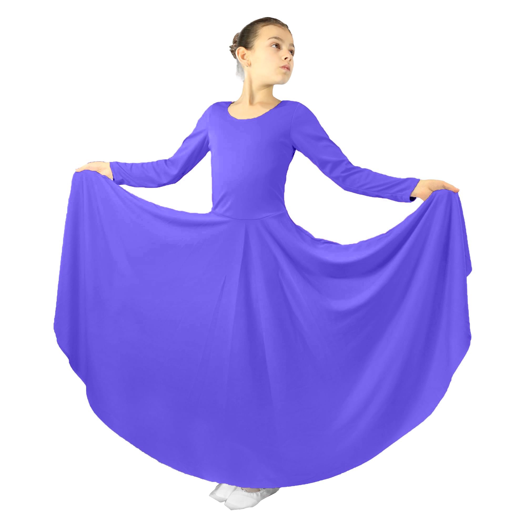 Description This is one of Danzcue's most popular dresses and features a soft and smooth polyester/spandex fabric, breathable, skin-friendly, lightweight, makes you feeling well. The upper torso of this dress is slightly fitted to show the grace and beauty of movement. Fitted in torso, loose in skirt, wide swing, give you enough space to move and give you the best comfort when dancing. The dress features a rounded neckline and long sleeve that allows it to be worn over any top or tunic combination, which is very suitable for worship praise dance, modern liturgical dance, ceremonies, etc. Sell by US Company.