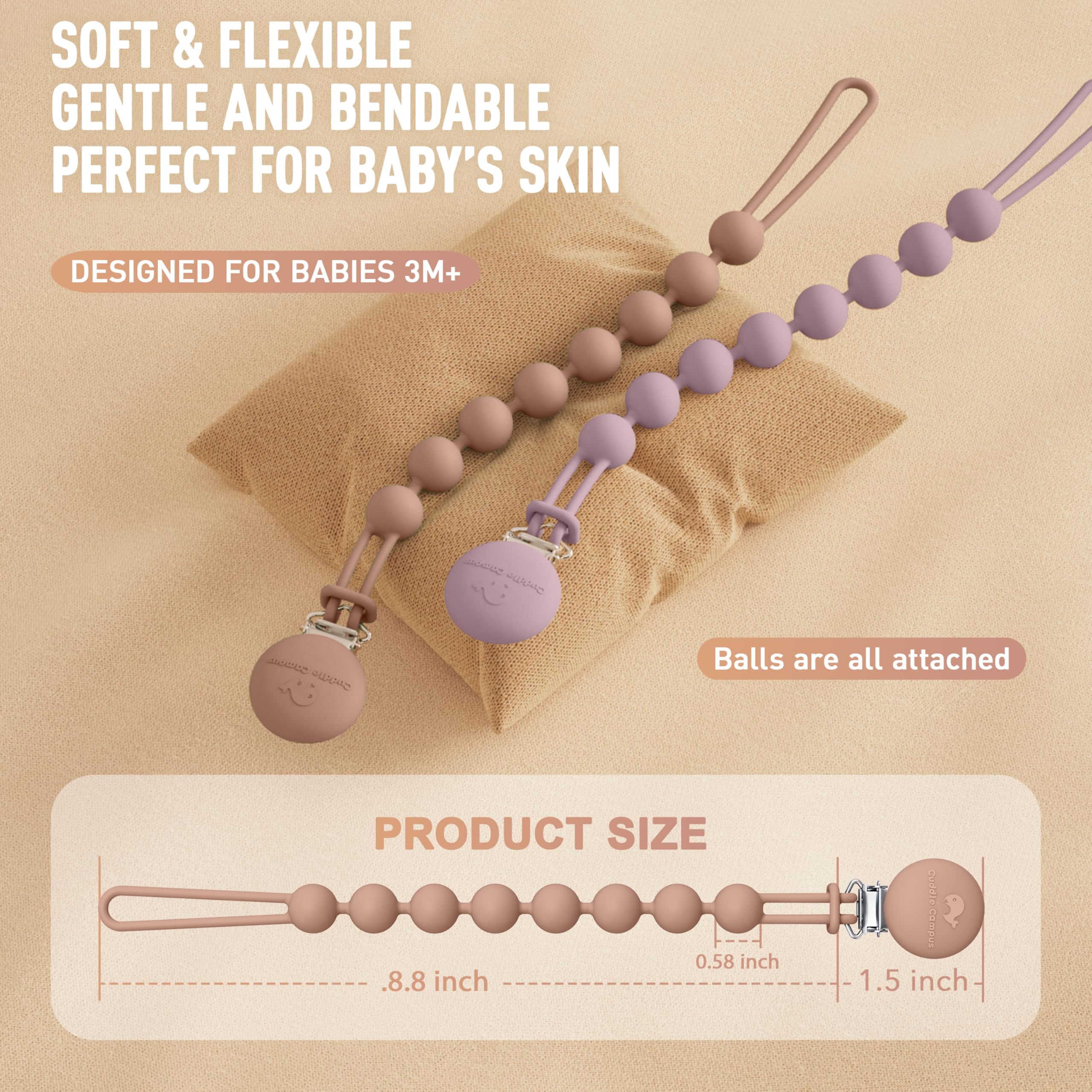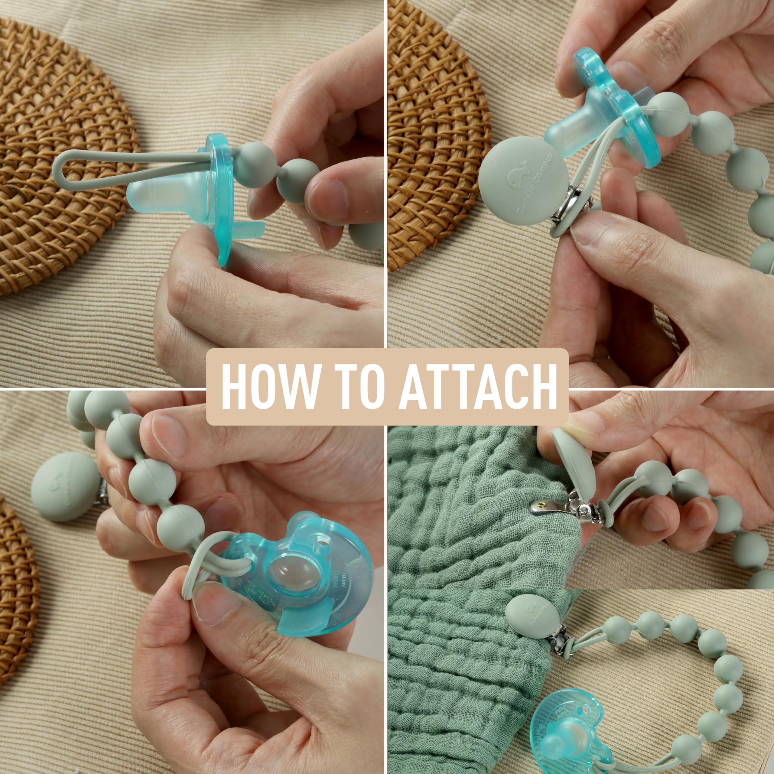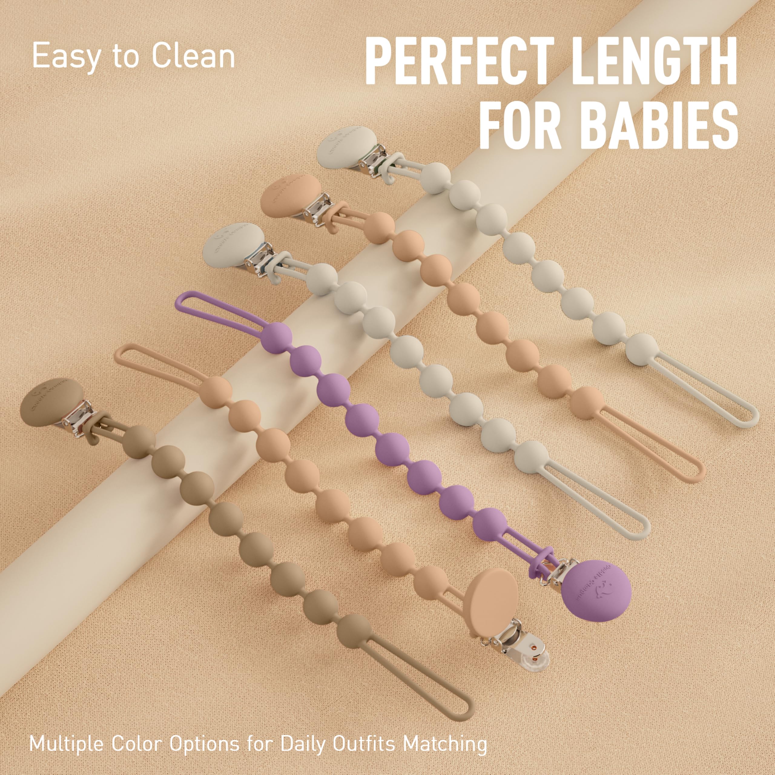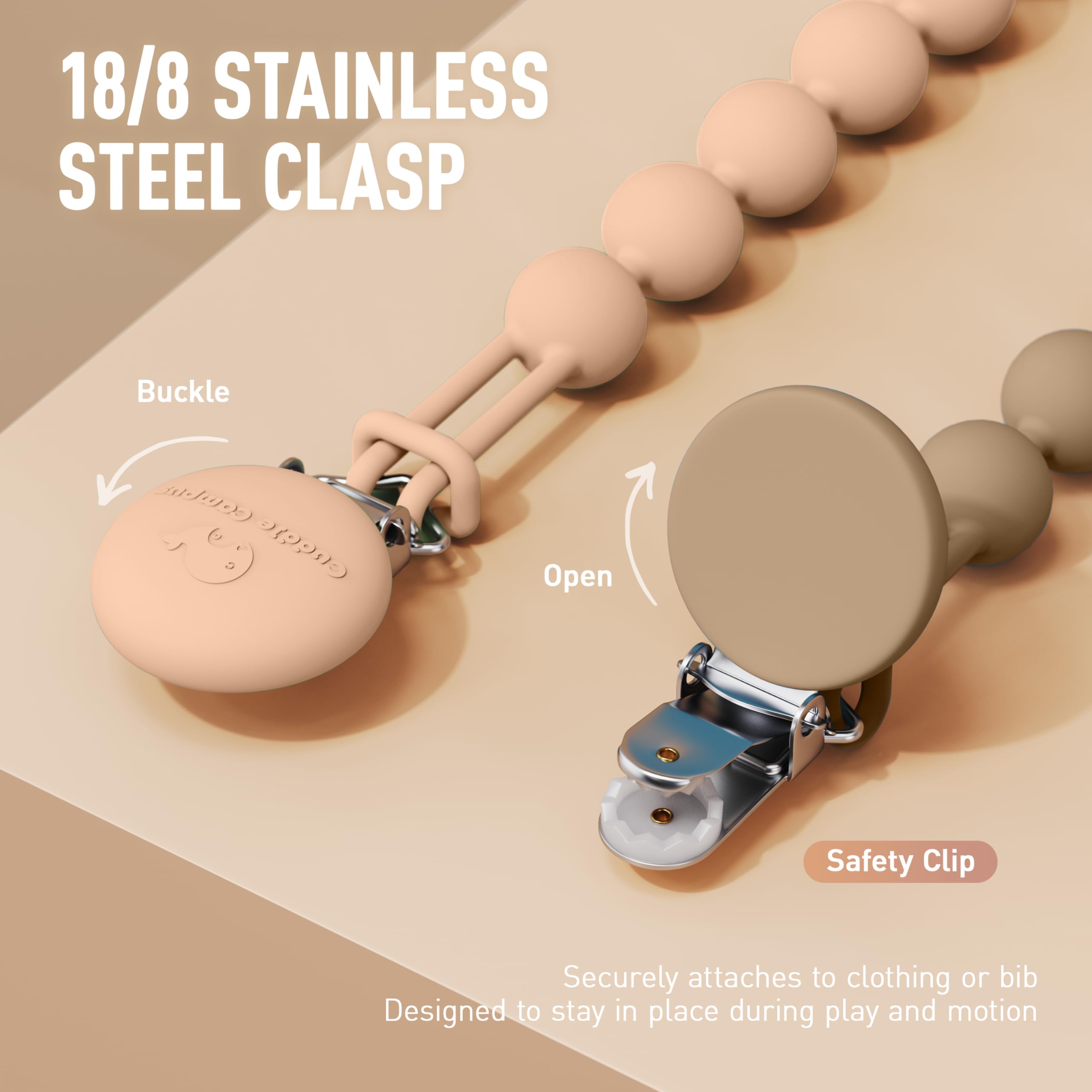 FOOD GRADE SILICONE: The beads of our pacifier clip are made from 100% pure food-grade silicone—a material we carefully pick for its dependable safety, letting you use the clip with total ease