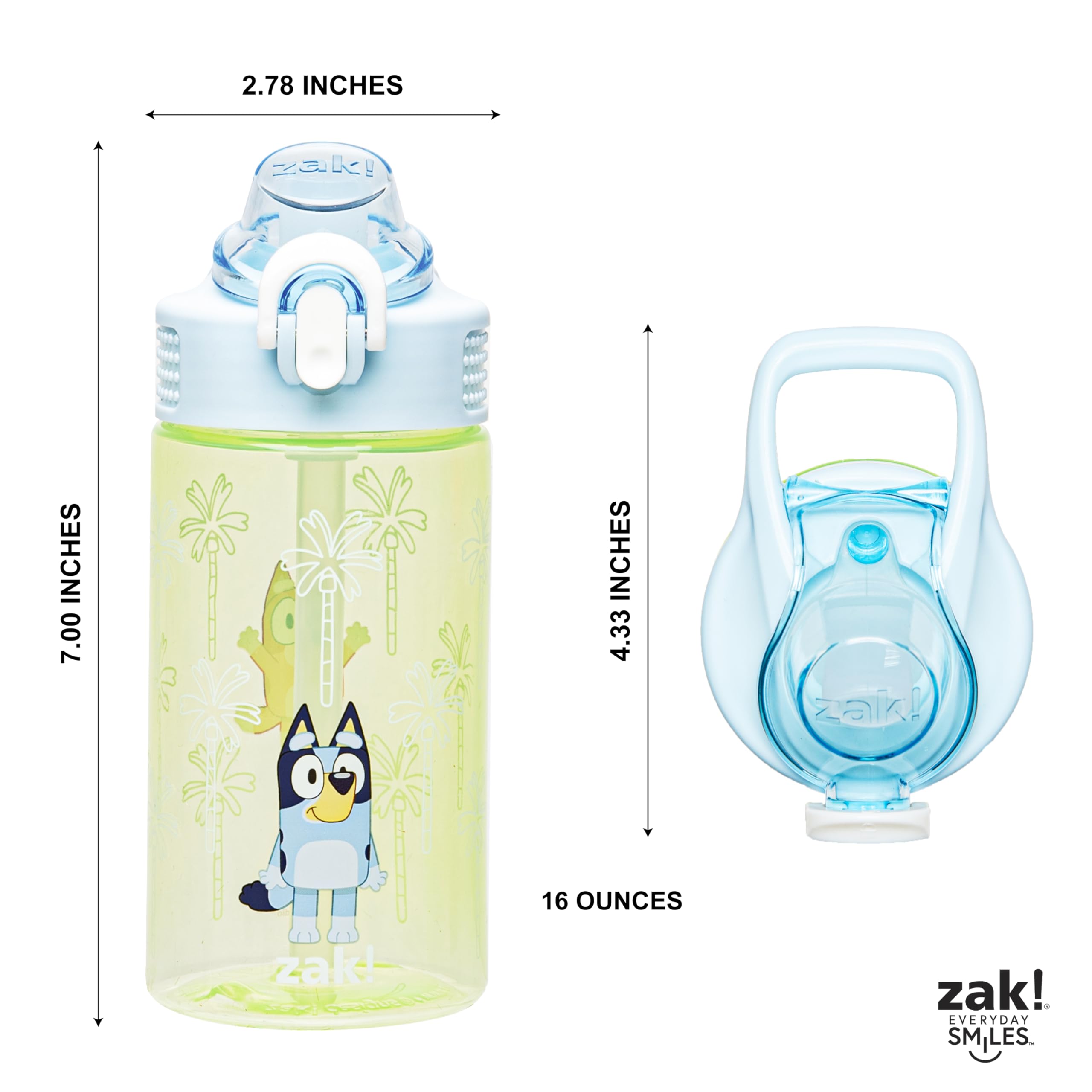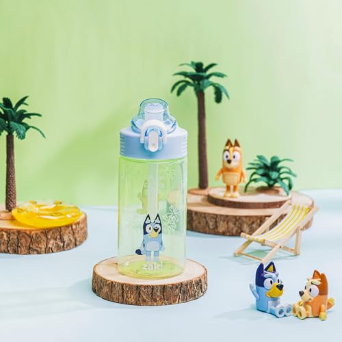 Let kids enjoy hydration with a fun water bottle by Zak Designs! Reusable and Durable Material: Reusable water bottles will last wash after wash—good news for you and the environment! The 16 oz water bottle is made of PP plastic, durable enough for kids to use every day and bring on any adventure. Leak-Proof Lid: The lid screws on securely and won't leak when the spout is closed, though water flows for easy drinking when the spout is open. The easy-open button has a flip-up lock to keep it from activating accidentally. On the Go: The water bottle has a built-in carrying loop on the lid for easy transportation, and with the spout cover to keep the spout clean and closed, it can be tossed into a bag for worry-free travel. Specifications: 16 oz capacity. Made of durable plastic. Dishwasher safe, do not microwave. Length: 4.33-inch, Width: 2.78-inch, Height: 7-inch. Character: Bluey and Bingo (Bluey).
