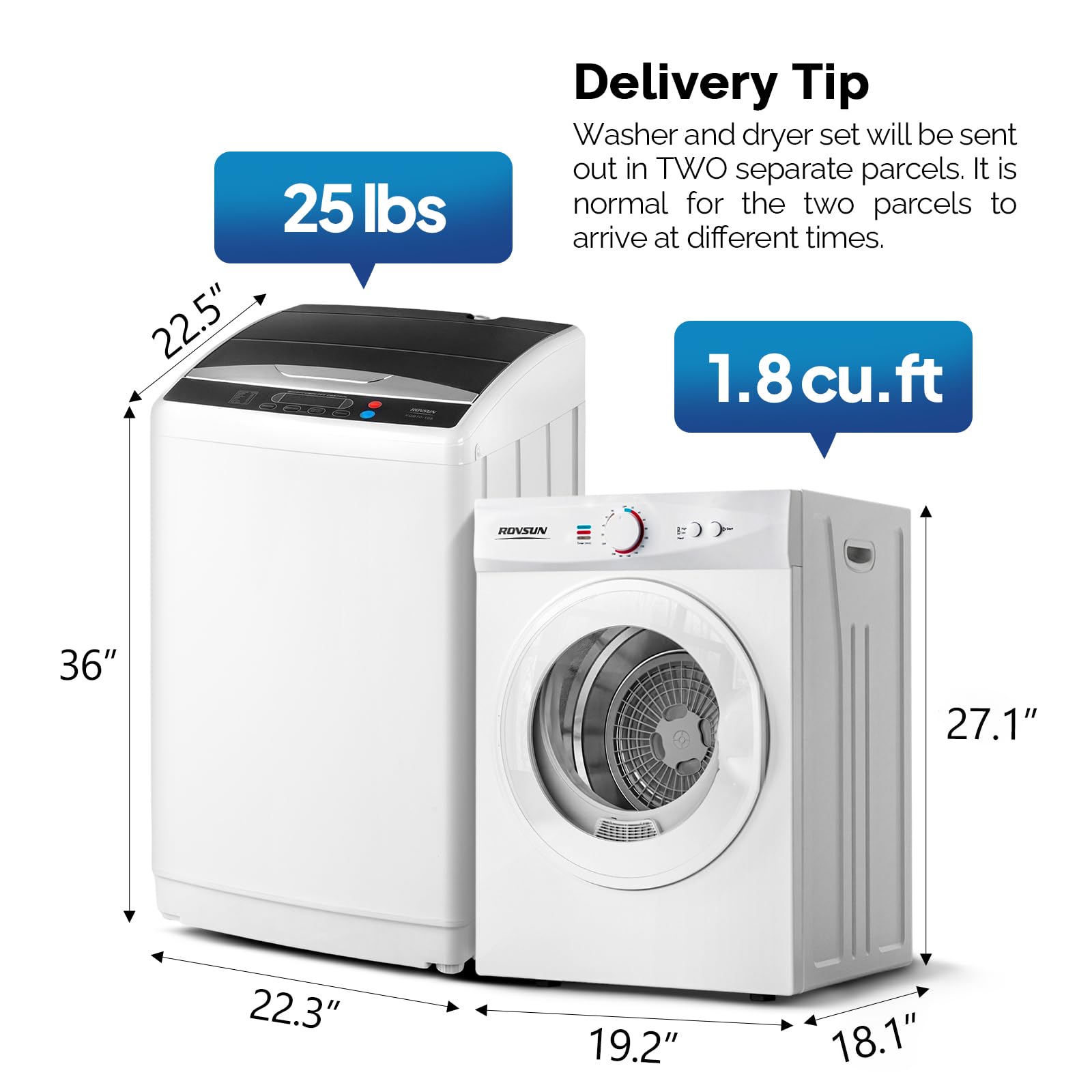 【Wash & Dry Efficiency】This washer and dryer combo combines a 25 lbs fully automatic washing machine and a max 10.6lbs electric portable clothes dryer for seamless same-day laundry cycles. The washer's spin-dry function pairs with the dryer's 1020W power and 140°F heat to eliminate damp waits—perfect for rainy days or busy schedules. Wash, dry, and wear your favorite outfits all in one day! (NOTE: for quick drying, no more than 6.6 pounds of clothes at a time)
