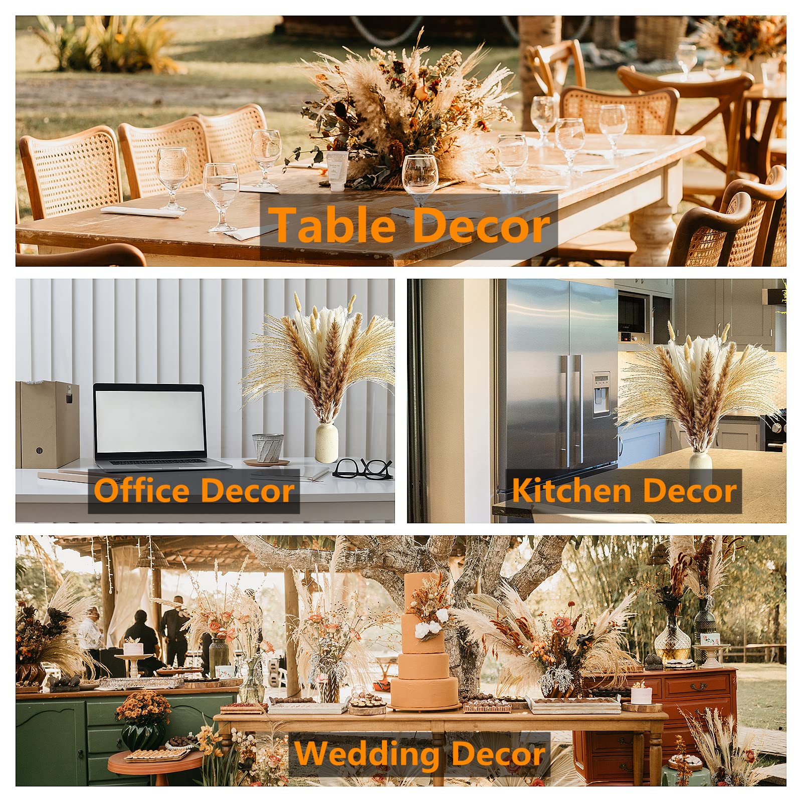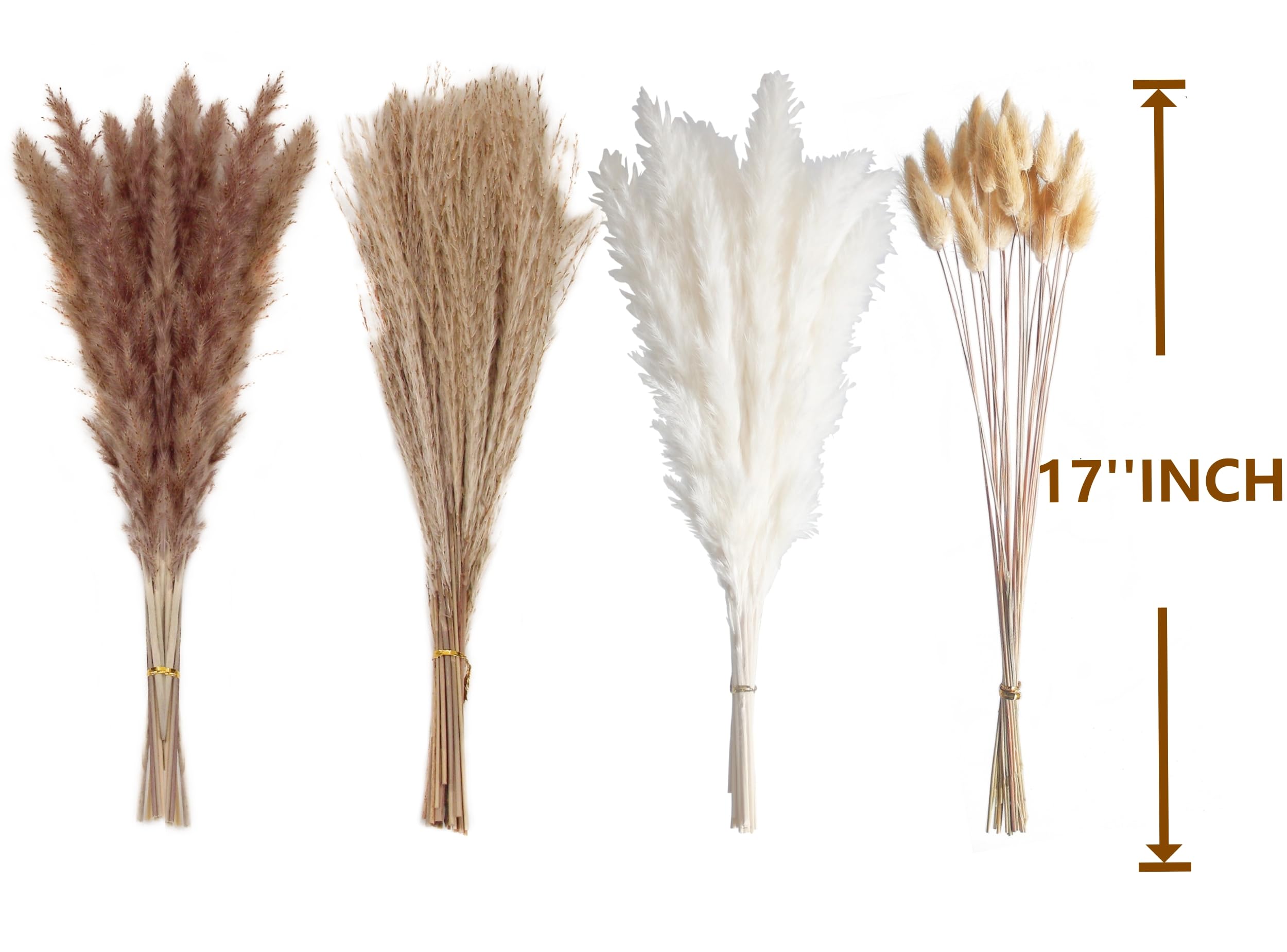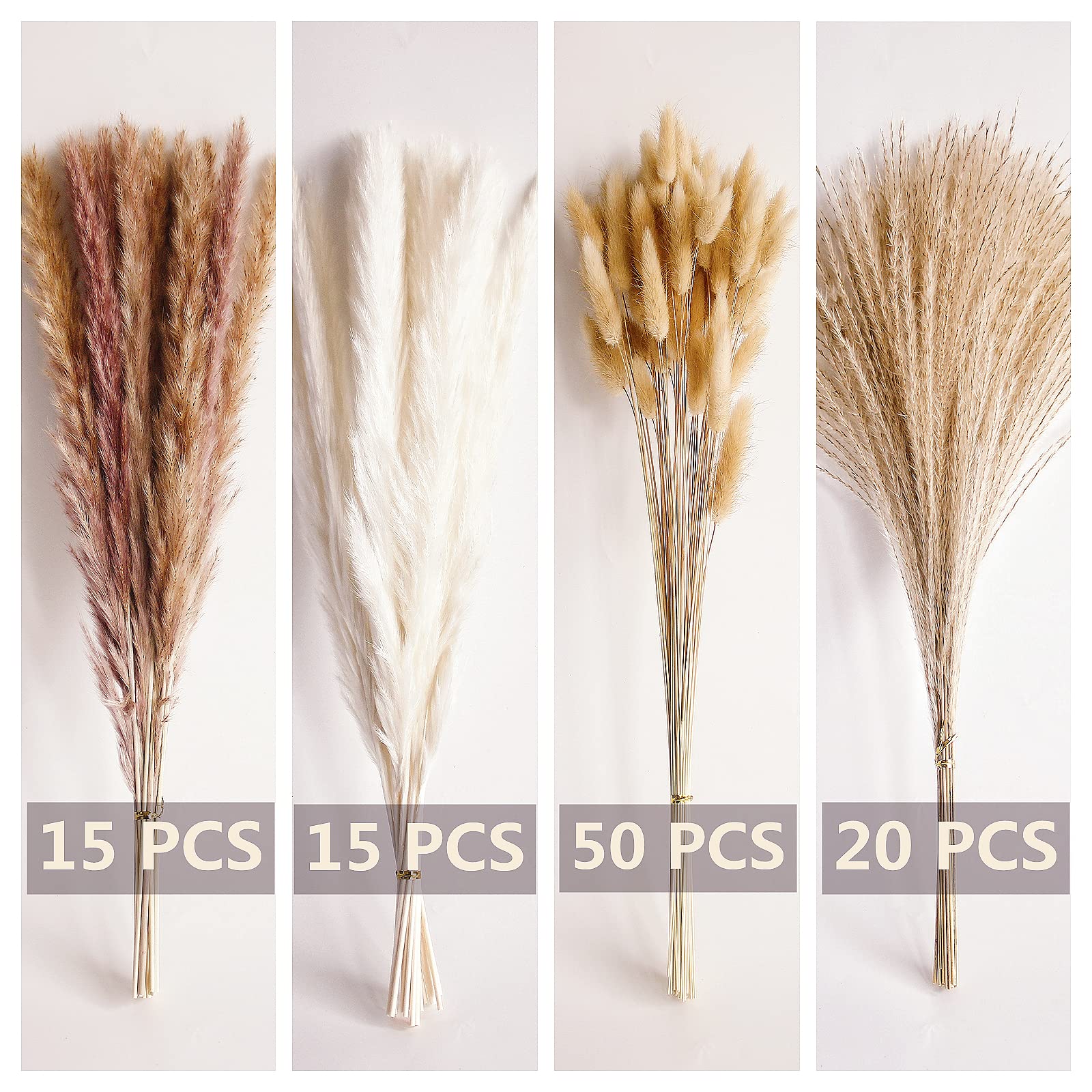 Quantity: The total number of pampas grass is 100pcs, pampas grass bouquets are 50 primary color dried bunny tails, 20 primary color reed grass, 15 white pampers, and 15 primary color pompas. There are four types of grass decor, make dried floral better and more Match for more bouquets (Vase not included)