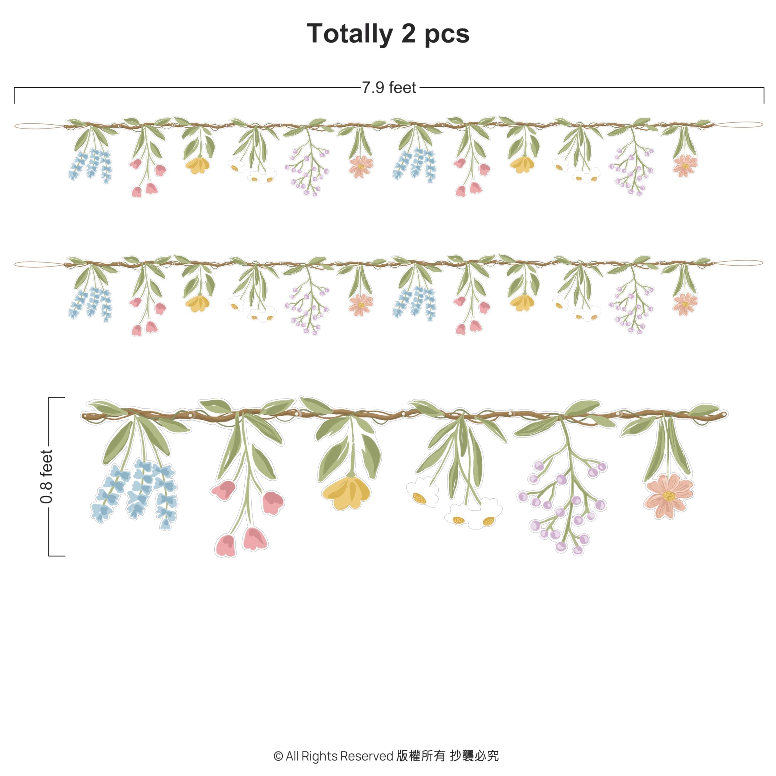 Package:This set includes two luxurious 7.9-foot plastic flower banners, each bursting with a vibrant mix of wildflowers, lush greenery, and delicate branches for a naturally enchanting look. The wildflowers are permanently attached, ensuring a tangle-free, hassle-free decorating experience. These flower garlands are perfect for creating floral backdrops, spring-themed banners, table runners, or ceiling draping, instantly transforming any space into a blooming paradise or botanical theme party.