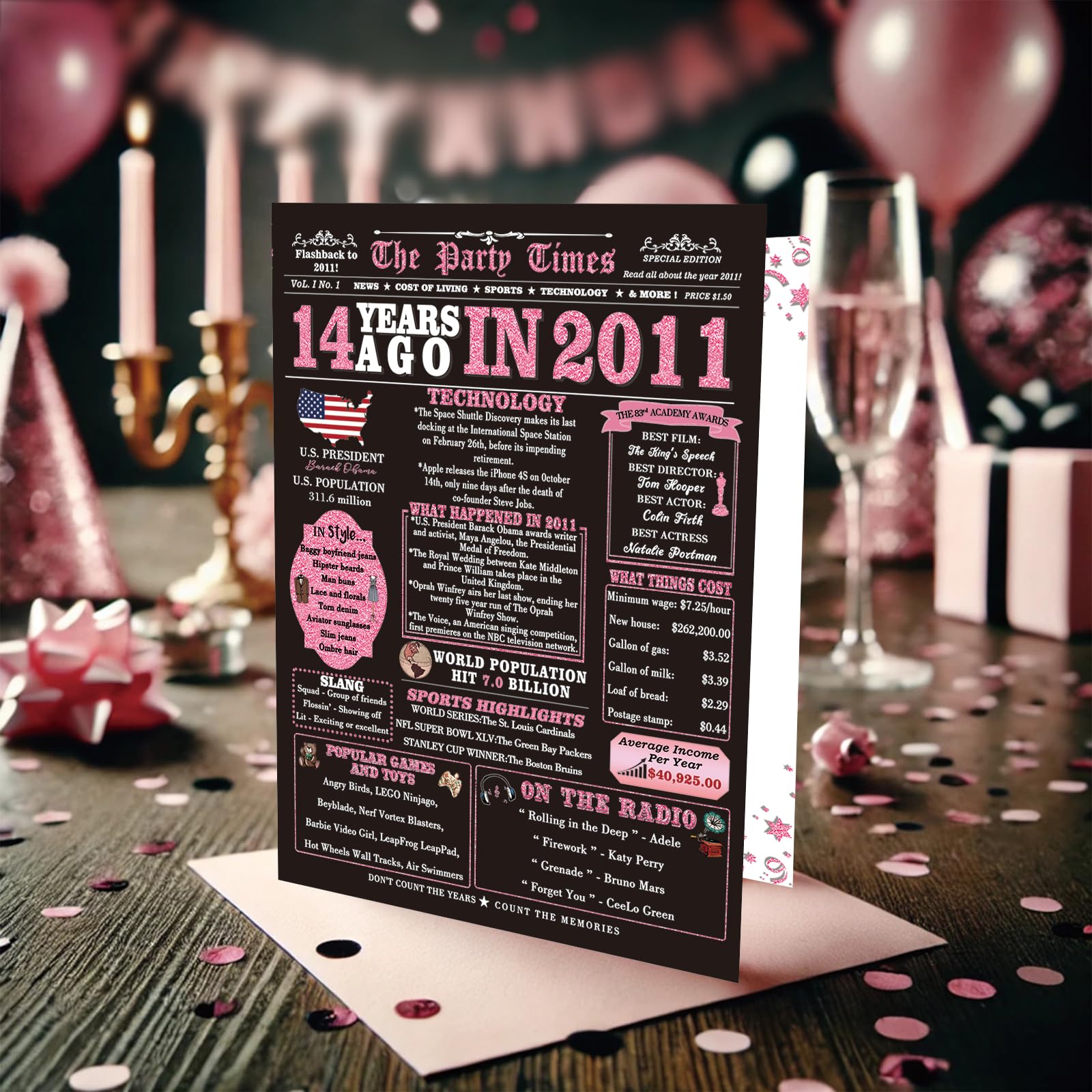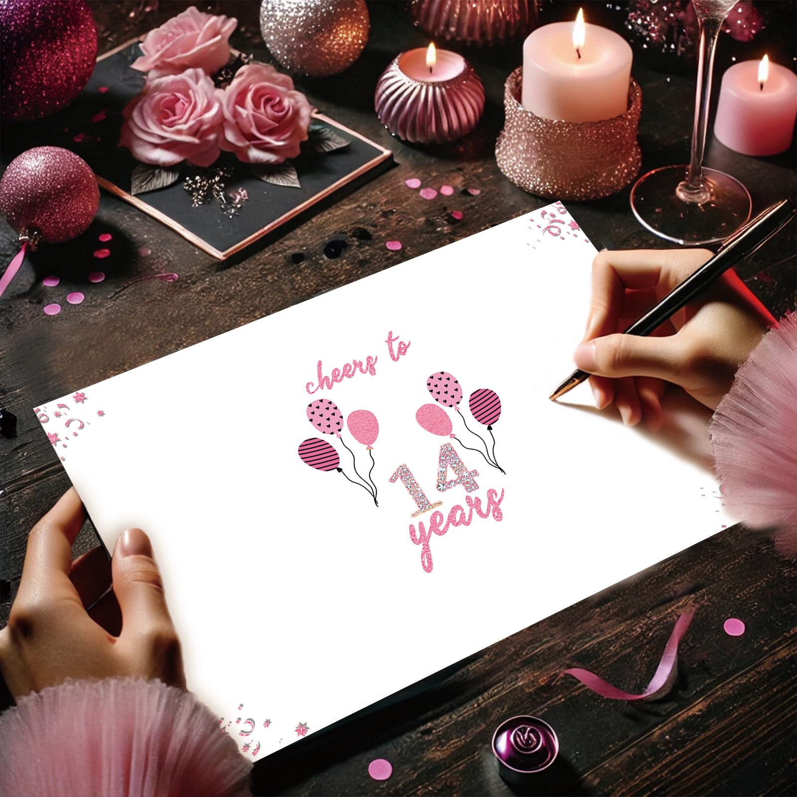 This card features a fun interior design with pink balloons and the words "Cheers to 14 Years." There’s still plenty of space for you to write your own heartfelt message