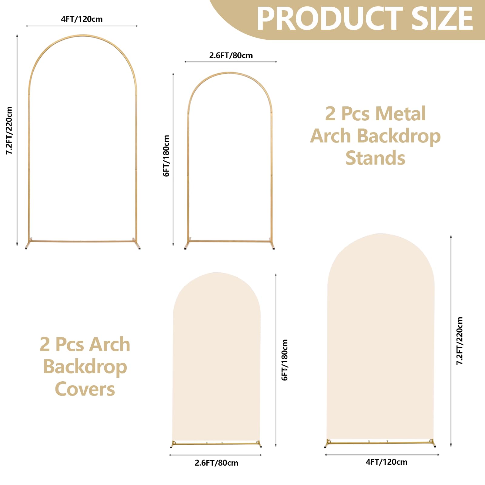 【Arch Backdrop Stand Set】You will receive 2 metal arch backdrop stand Which are 7.2FT and 6FT, as well as 2 arch backdrop stand cover of the same size and an installation manual.