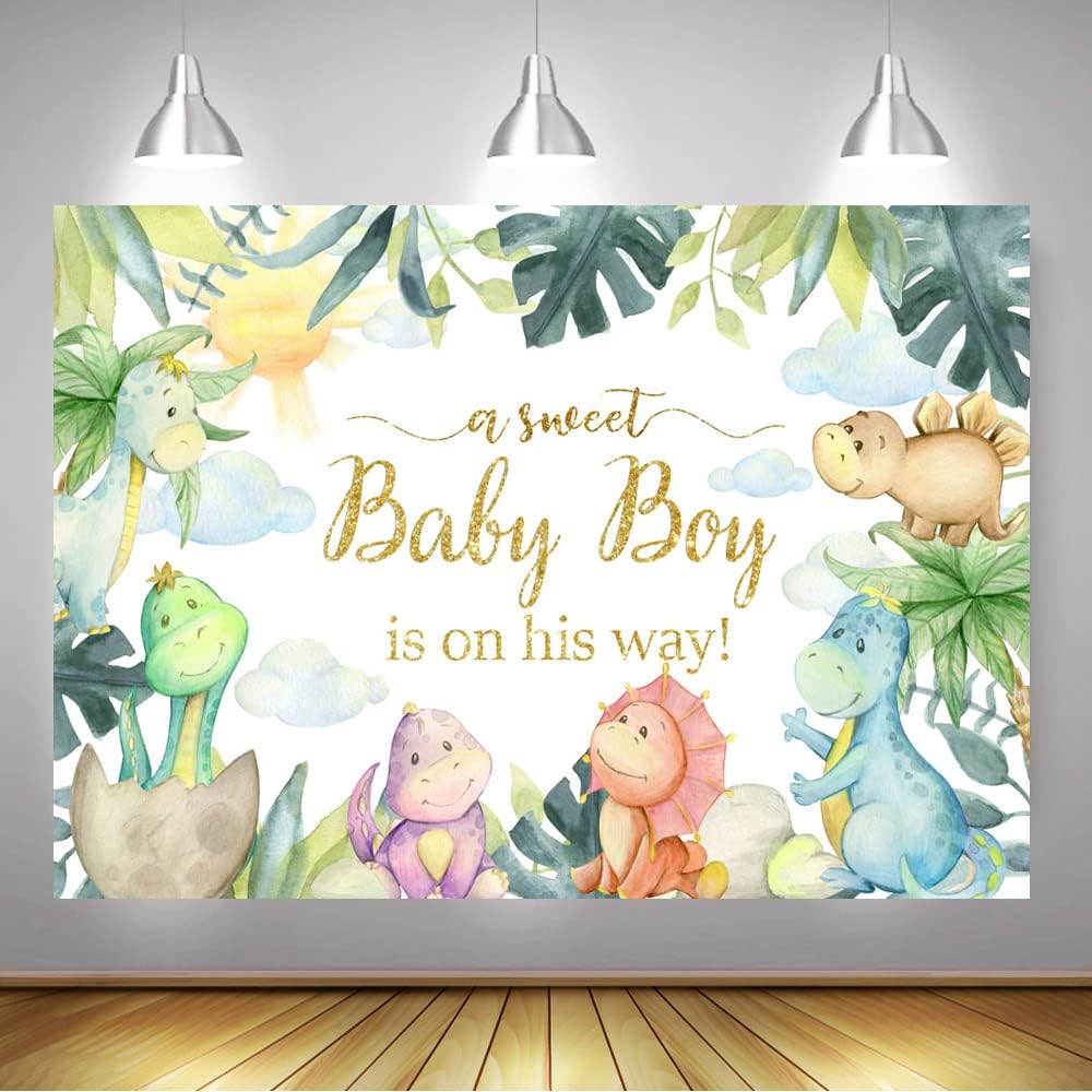 Color: The dino a sweet baby boy is on his way baby shower backdrop is printed with vivid color and high-resolutions digital printers, realistic scene and eye-catching product details; Hang it against the wall for best scene; It's fashionable, clear printed, and fashionable enough to keep your party stylish; The Colors are noticeable and will make your decorations for birthday party or baby shower party better